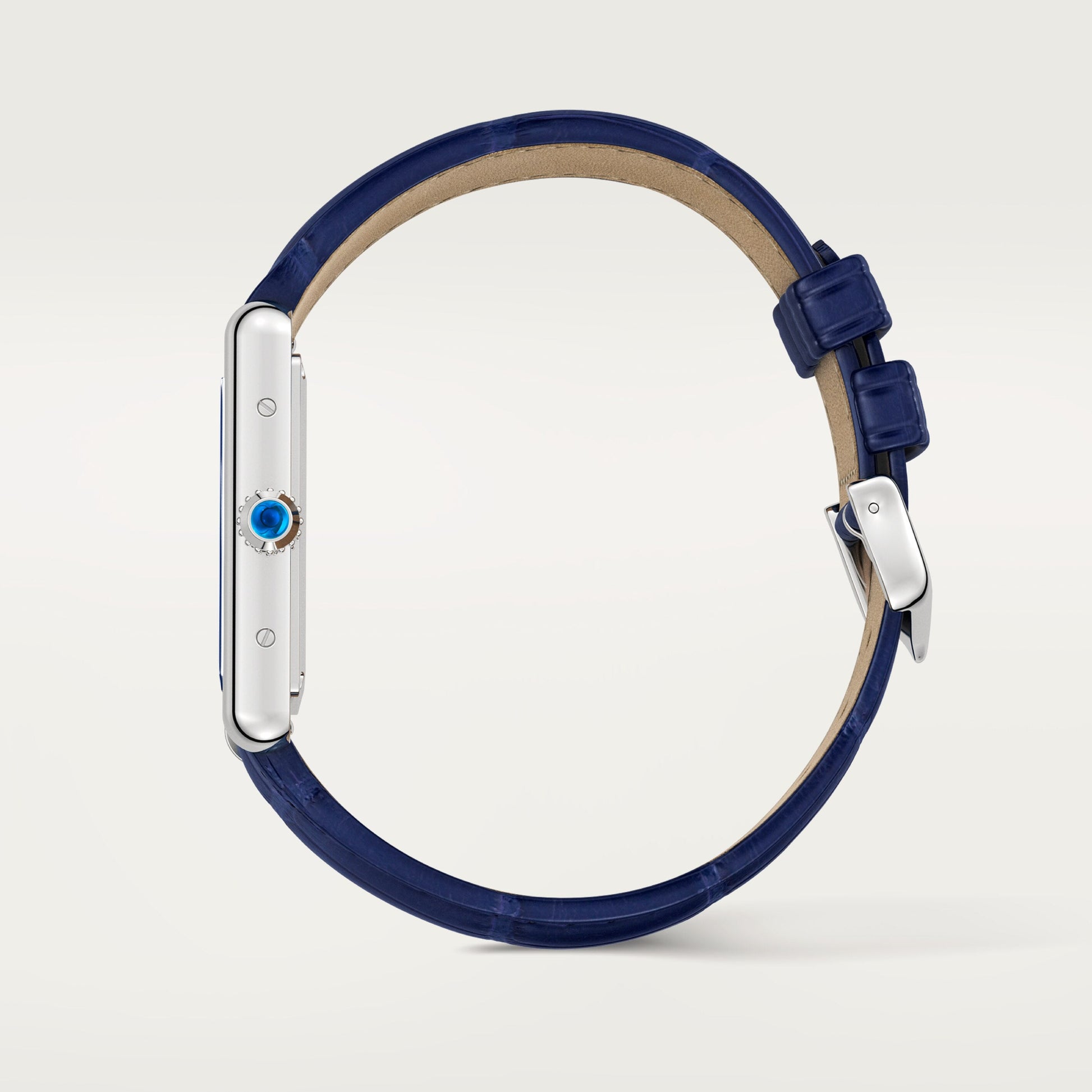 Tank Must watch, large model, High Autonomy quartz movement. Steel case, beaded crown set with a synthetic cabochon-shaped spinel, blue lacquered dial, polished steel sword-shaped hands, blue alligator-skin strap, steel ardillon buckle. Case dimensions: 33.7 mm x 25.5 mm, thickness: 6.6 mm. Water-resistant up to 3 bar (approx. 30 metres).
