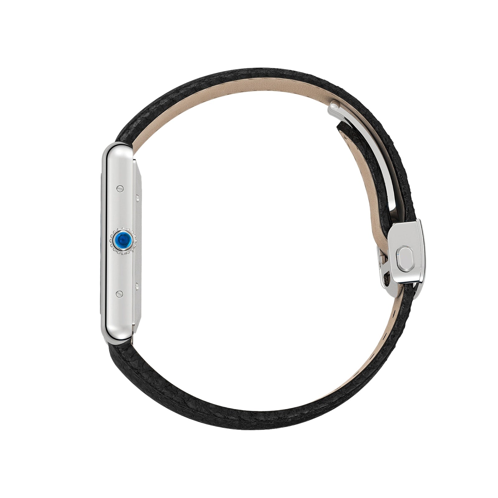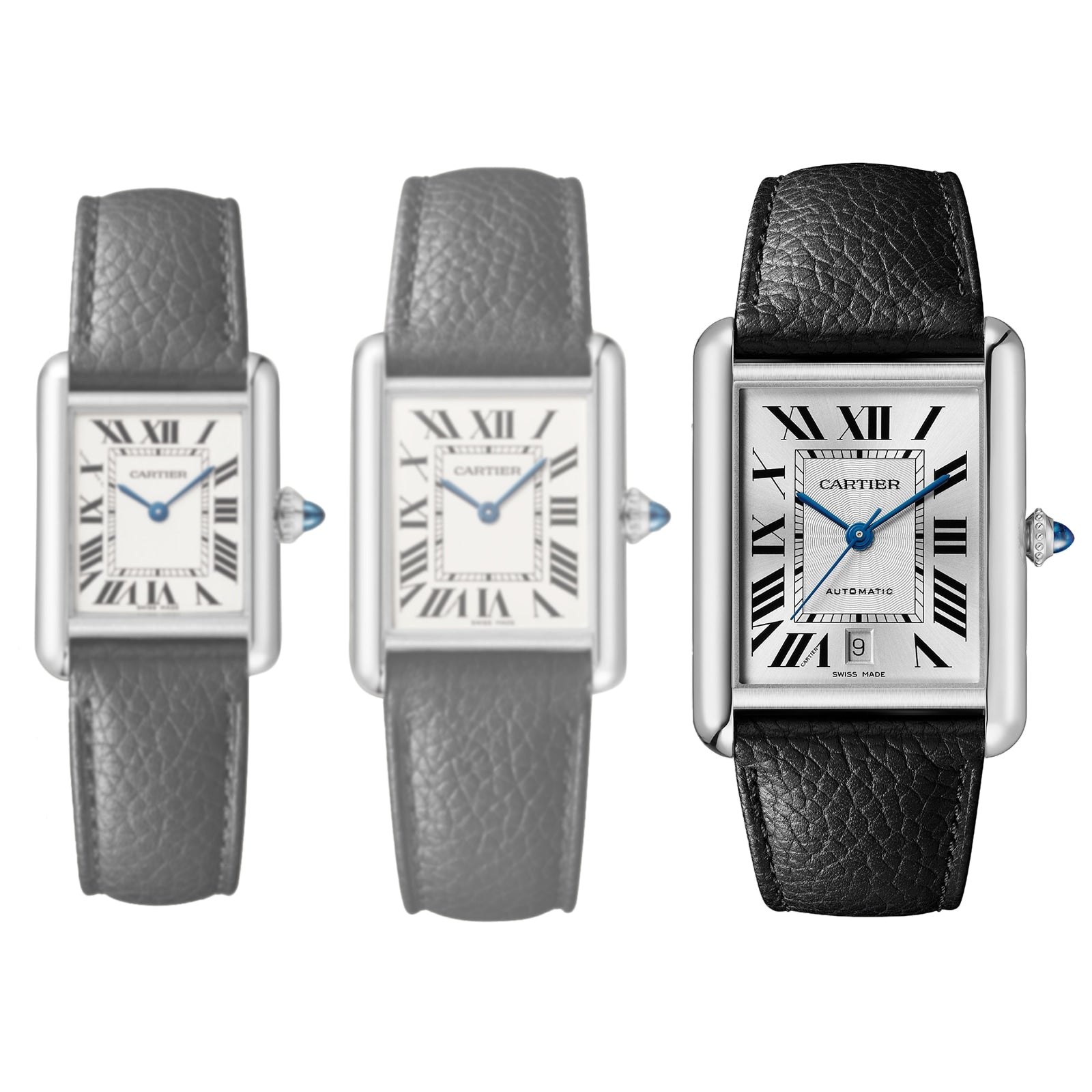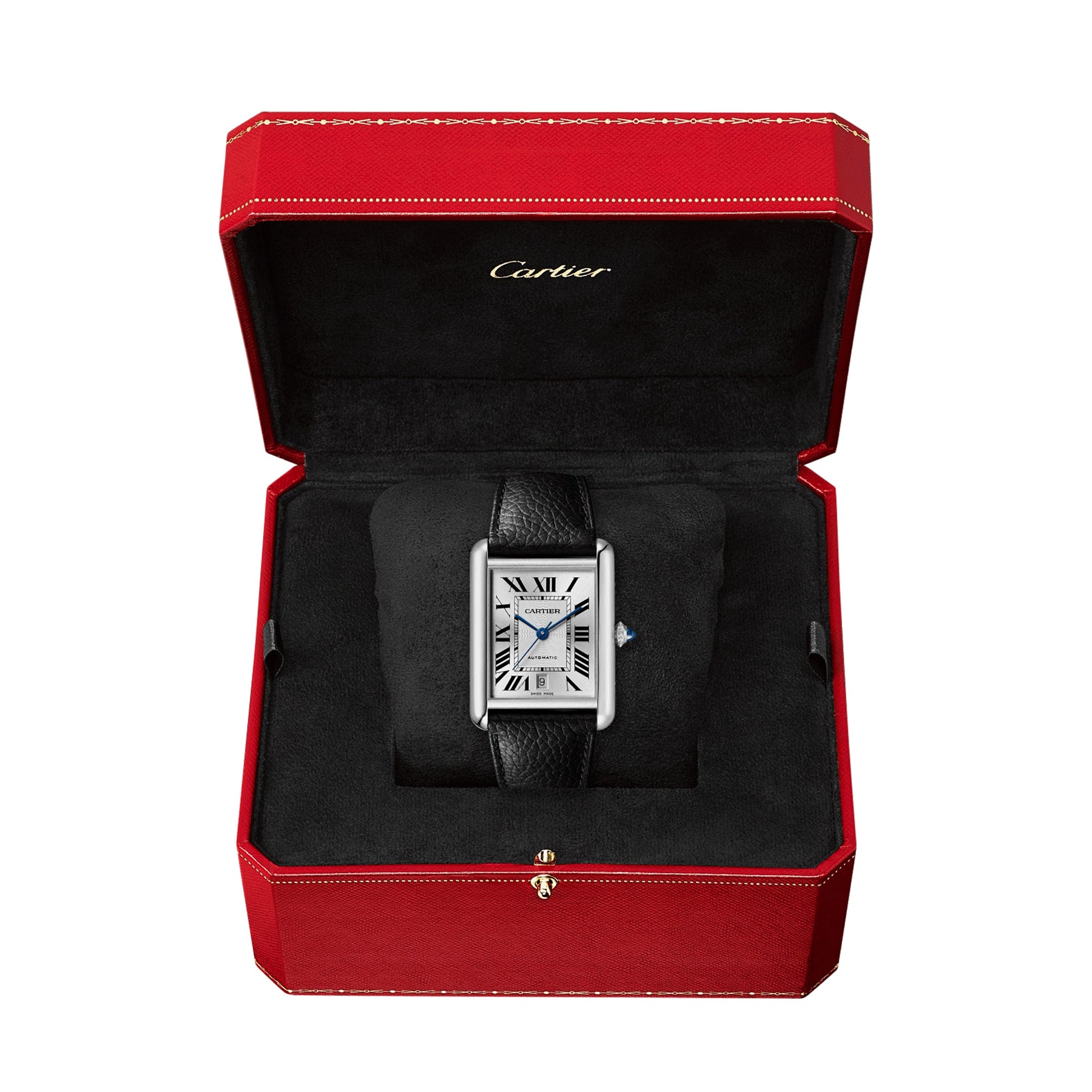 Tank Must watch, extra-large model, mechanical movement with automatic winding, calibre 1847 MC. Steel case, beaded crown set with a synthetic cabochon-shaped spinel, silvered flinqué dial, blued-steel sword-shaped hands, black grained calfskin strap, interchangeable steel folding buckle, calendar aperture at 6 o'clock. Case dimensions: 41 mm x 31 mm, thickness: 8.4 mm. Water- resistant to 3 bar (approx. 30 metres).