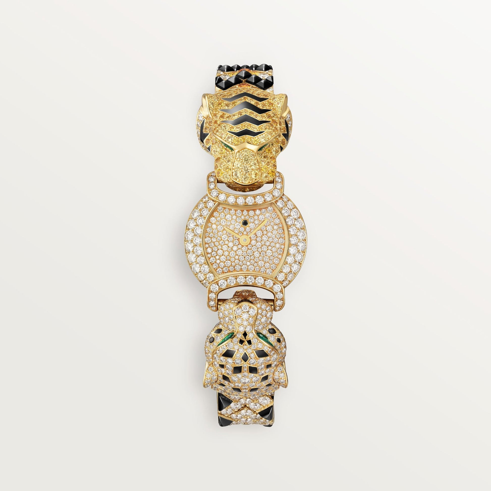 Indomptables de Cartier tiger motif watch, 22.2 mm, quartz movement. Case in 18K yellow gold (750/1000) set with 128 brilliant-cut diamonds totaling 1.08 carat, panther head in 18K yellow gold (750/1000) set with 275 brilliant-cut diamonds totaling 1.32 carat, black lacquer spots and nose, tiger head in 18K yellow gold (750/1000) set with 174 yellow sapphires totaling 1.48 carat and 23 orange spessartite garnets, pear-shaped emerald eyes totaling 0.28 carat, 18K yellow gold (750/1000) dial set with 160 diamonds totaling 0.37 carat and 1 black spinel, gold-finish steel sword-shaped hands, 18K yellow gold (750/1000) strap set with 146 brilliant-cut diamonds totaling 5.24 carats, 47 black spinels, 13 yellow sapphires totaling 0.84 carat. Thickness: 7.55 mm. Water-resistant up to 3 bar