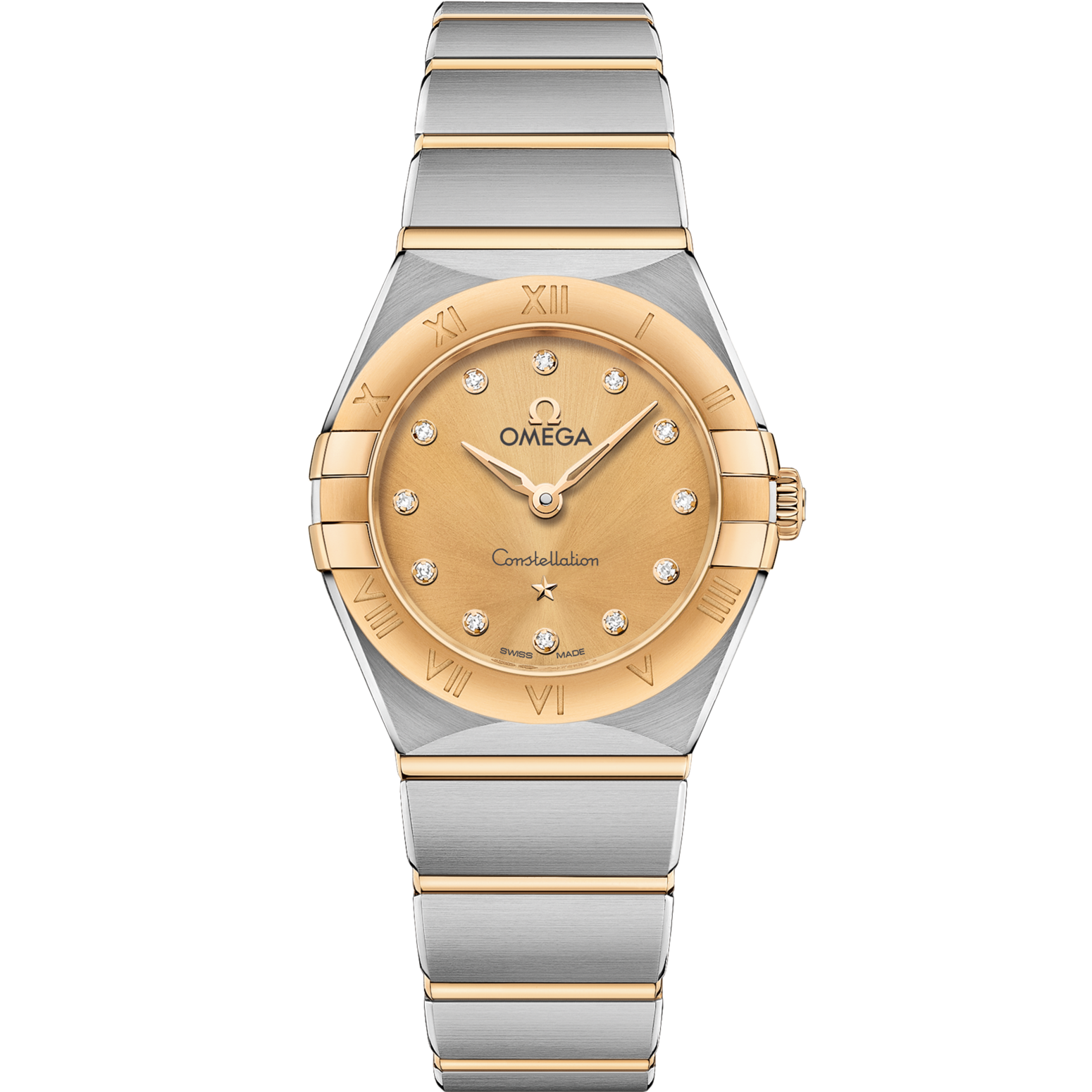 This 25 mm 18K yellow gold and stainless steel model features a bezel engraved with Roman numerals, sun-brushed champagne dial with diamond hour markers and scratch-resistant saphire crystal. The hands, OMEGA logo, Constellation star and diamond holders are also in 18K yellow gold.