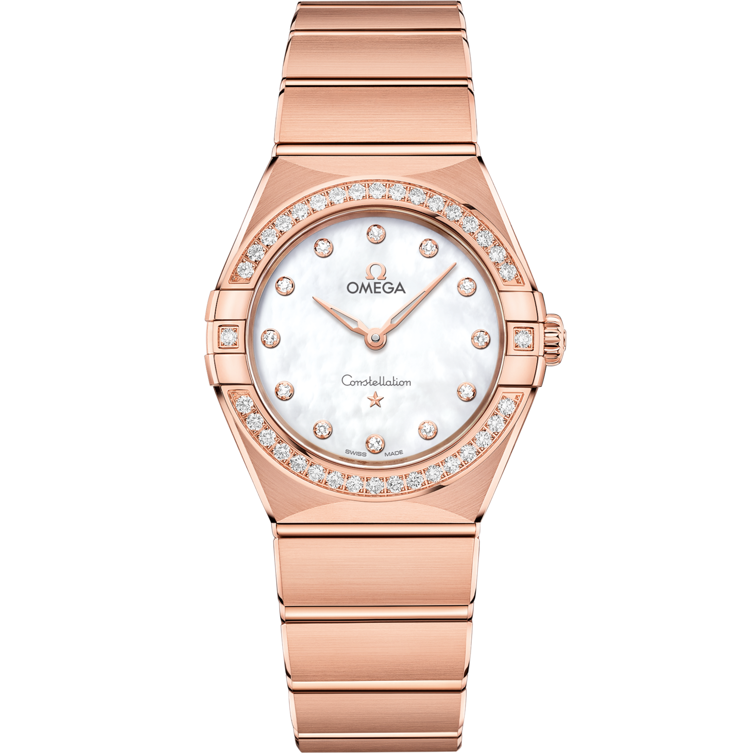 This 28 mm 18K Sedna™ gold model features a diamond-paved bezel, white mother-of-pearl dial with diamond hour markers and scratch-resistant sapphire crystal. The bracelet, hands, OMEGA logo, Constellation star and diamond holders are also in 18K Sedna™ gold.