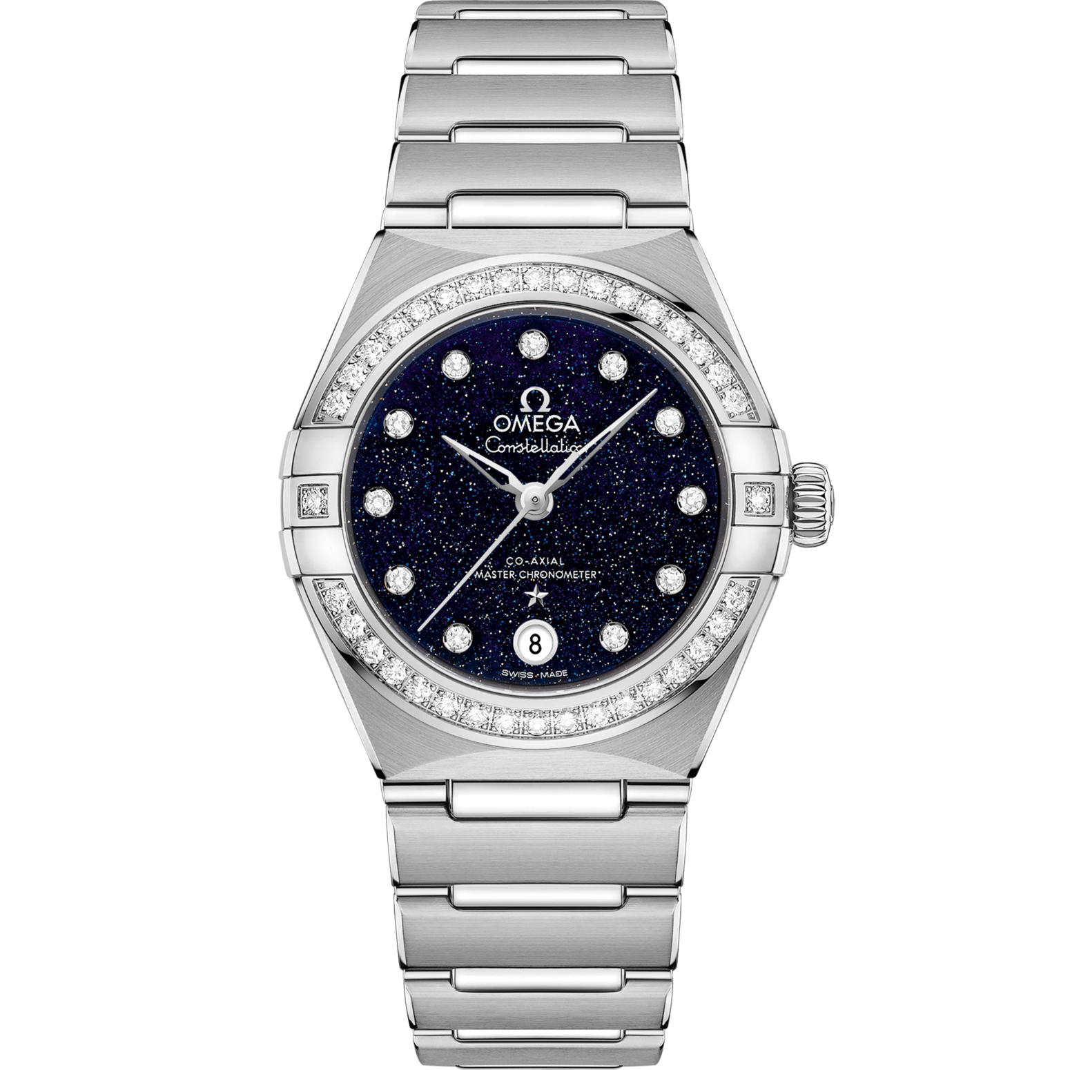 This 29 mm stainless steel model features a diamond-paved bezel, blue aventurine glass dial with diamond hour markers and a date window at the 6 o'clock position. The hands, OMEGA logo, Constellation star and diamond holders are in 18K white gold.