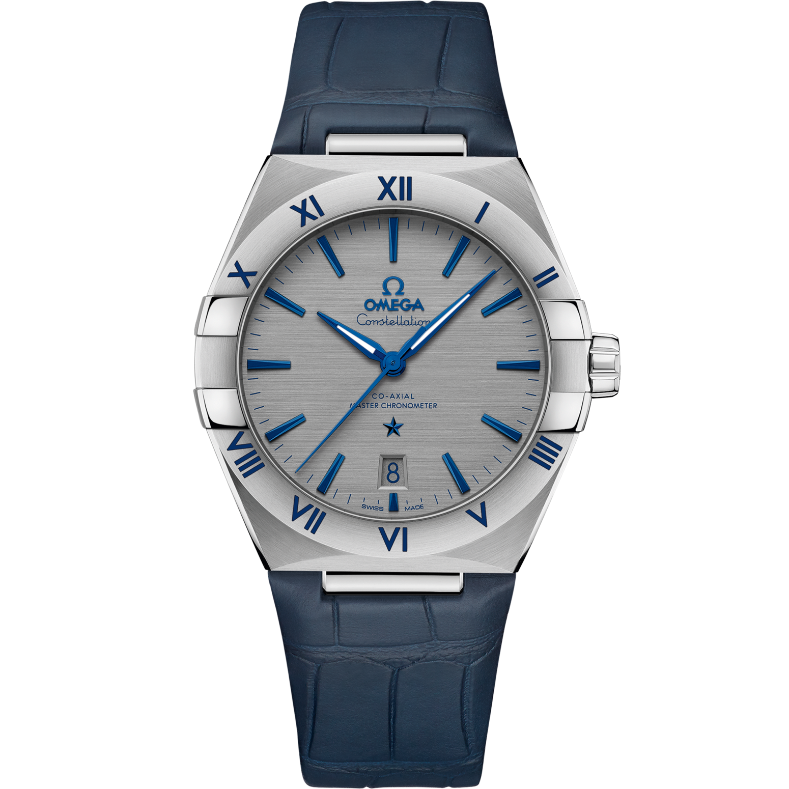 This 39 mm stainless steel model features a bezel with blued Roman numerals, a deep horizontally-brushed ruthenium-grey dial and a date window at the 6 o'clock position. The hands, OMEGA logo, Constellation star and indexes are all blued.