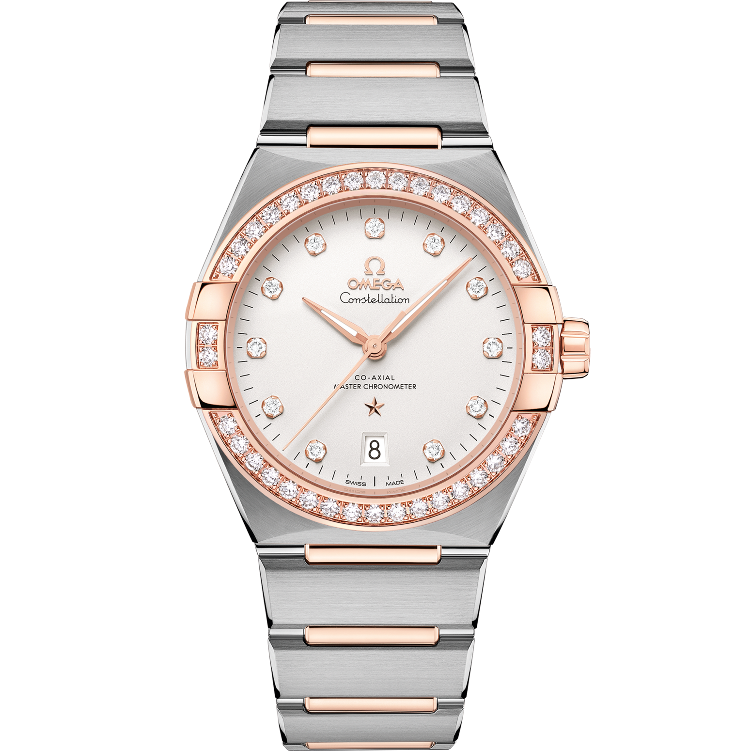 This 39 mm stainless steel and 18K Sedna™ gold model features a diamond-paved bezel, an opaline silvery dial with diamond hour-markers and a date window at the 6 o'clock position. The hands, OMEGA logo, Constellation star and diamond-holders on the dial are all in 18K Sedna™ gold.