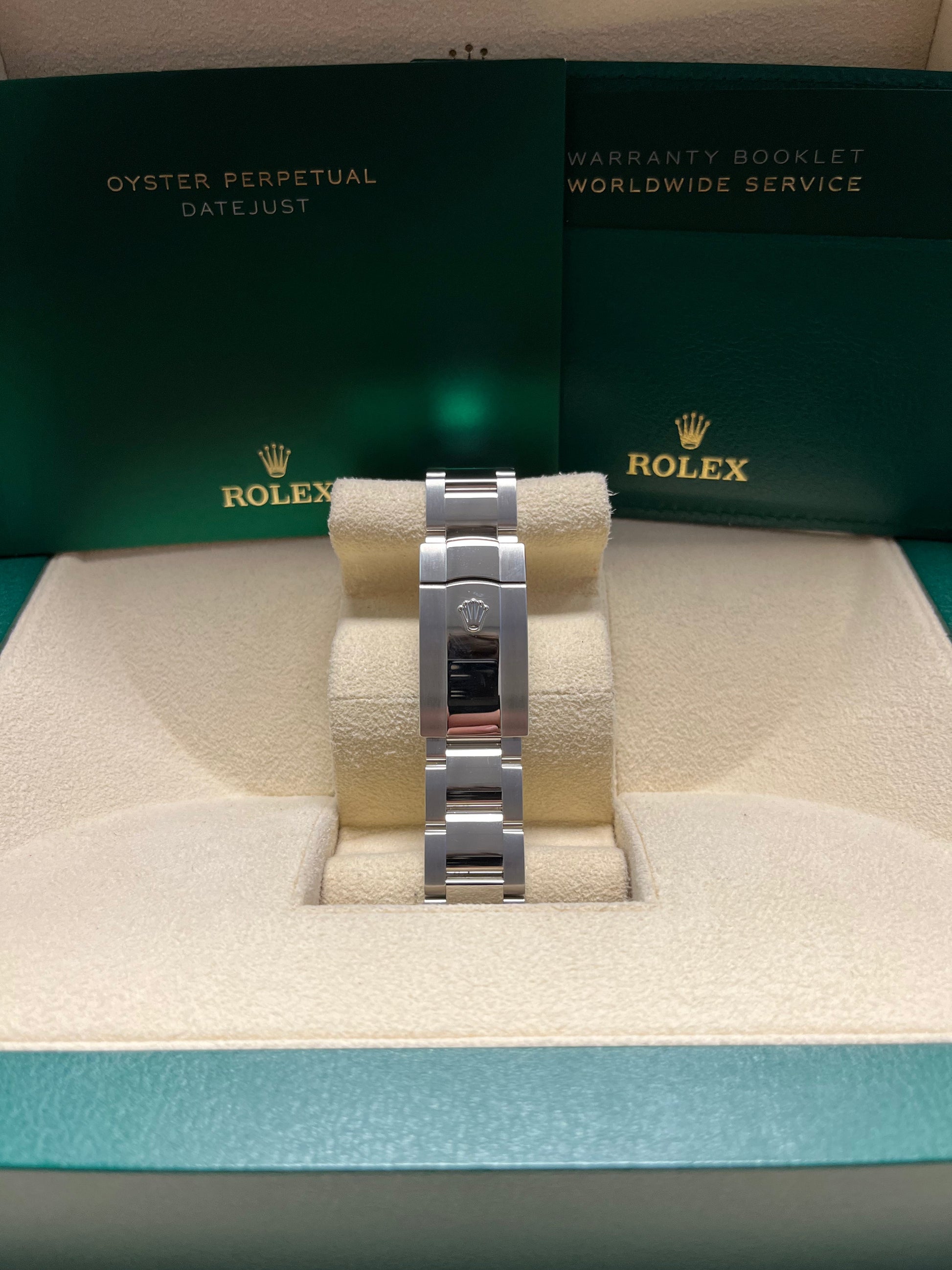 41mm white Rolesor case comprised of a 904L steel monobloc middle case, screw-down steel back, screw-down crown with twin lock double waterproofness system, 18K white gold fluted bezel, scratch-resistant double anti-reflective sapphire crystal with cyclops lens over the date, white mother-of-pearl dial, 10 diamond hour markers. Rolex calibre 3235 perpetual self-winding movement with date at 3 o'clock that changes instantaneously at midnight in a few thousandths of a second, approximately 70 hours of power reserve, 904L steel folding Oysterclasp buckle with Easylink 5mm comfort extension link. Waterproof up to 100 meters.
