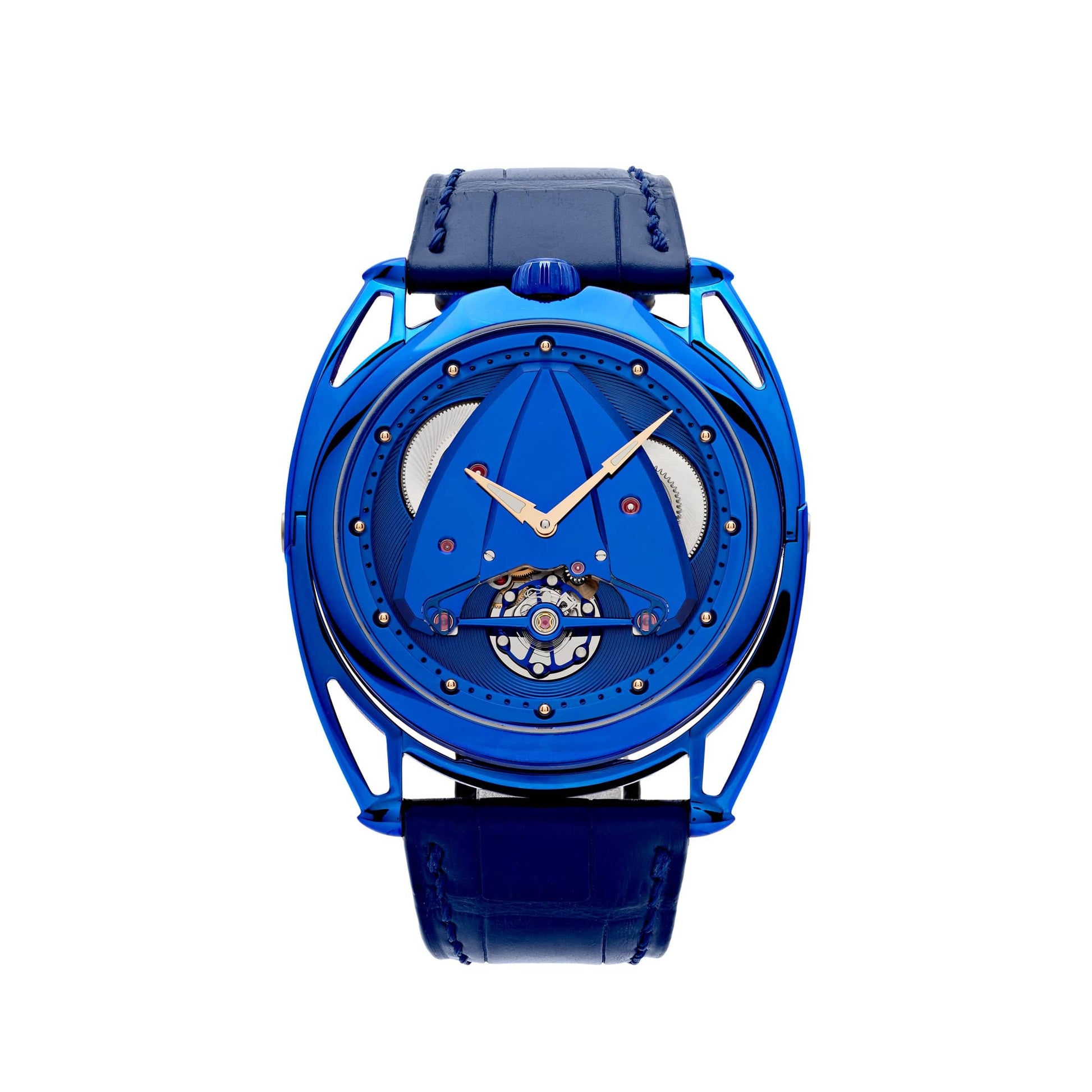 The De Bethune DB28XP “Kind of Blue” is a strikingly futuristic and artisanal limited edition that pushes the boundaries of independent watchmaking. Crafted in heat-blued titanium, the ultra-thin 43mm case delivers a mirror-like electric blue tone, achieved through a painstaking thermal oxidation process—De Bethune’s calling card. The delta-shaped bridge, exposed balance wheel, and signature floating lugs all contribute to the architectural symmetry that defines this model.