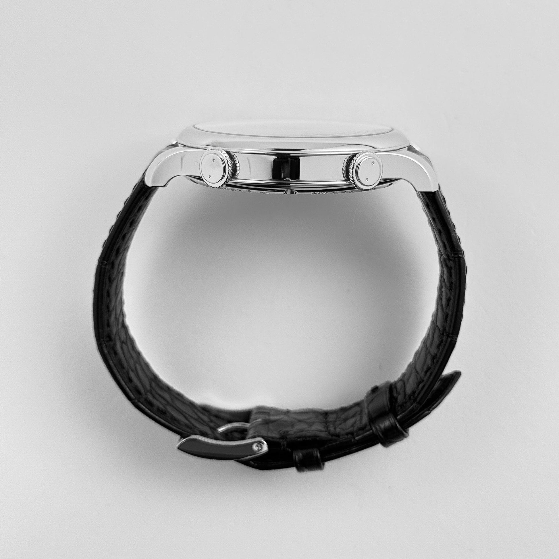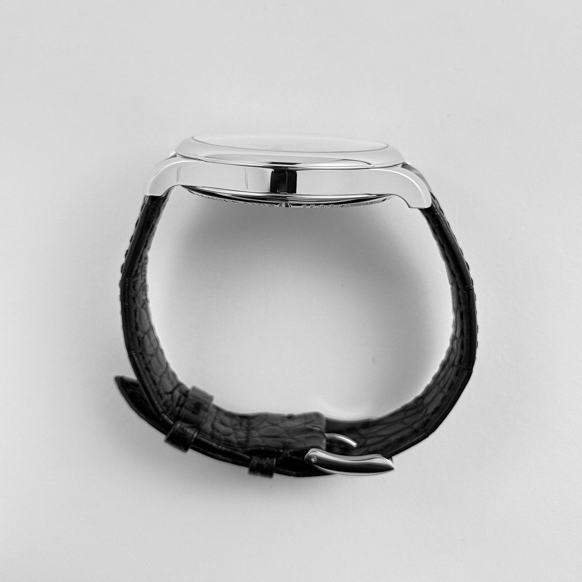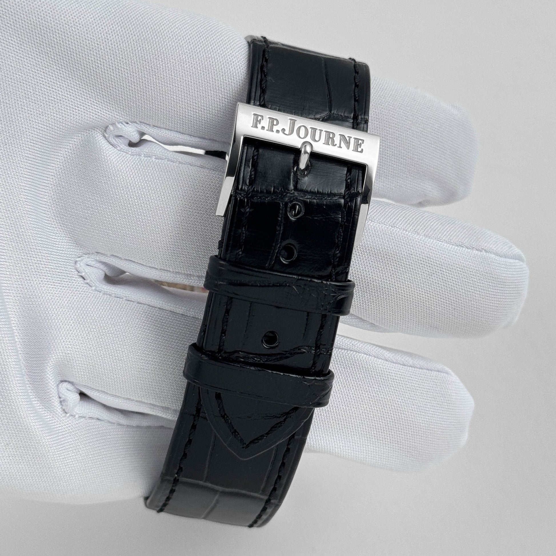 The F.P. Journe Chronomètre à Résonance RQ in platinum stands at the pinnacle of independent watchmaking. It is powered by the Calibre 1520—its most advanced movement to date. The 42 mm platinum case houses a silvery-whitened guilloché dial with two distinct time displays and dual small seconds, underpinned by a single mainspring barrel that intelligently powers two escapements via a differential. Each gear train incorporates its own remontoir d’égalité, ensuring constant force and chronometric precision—an unmatched technical achievement in the wristwatch realm.
