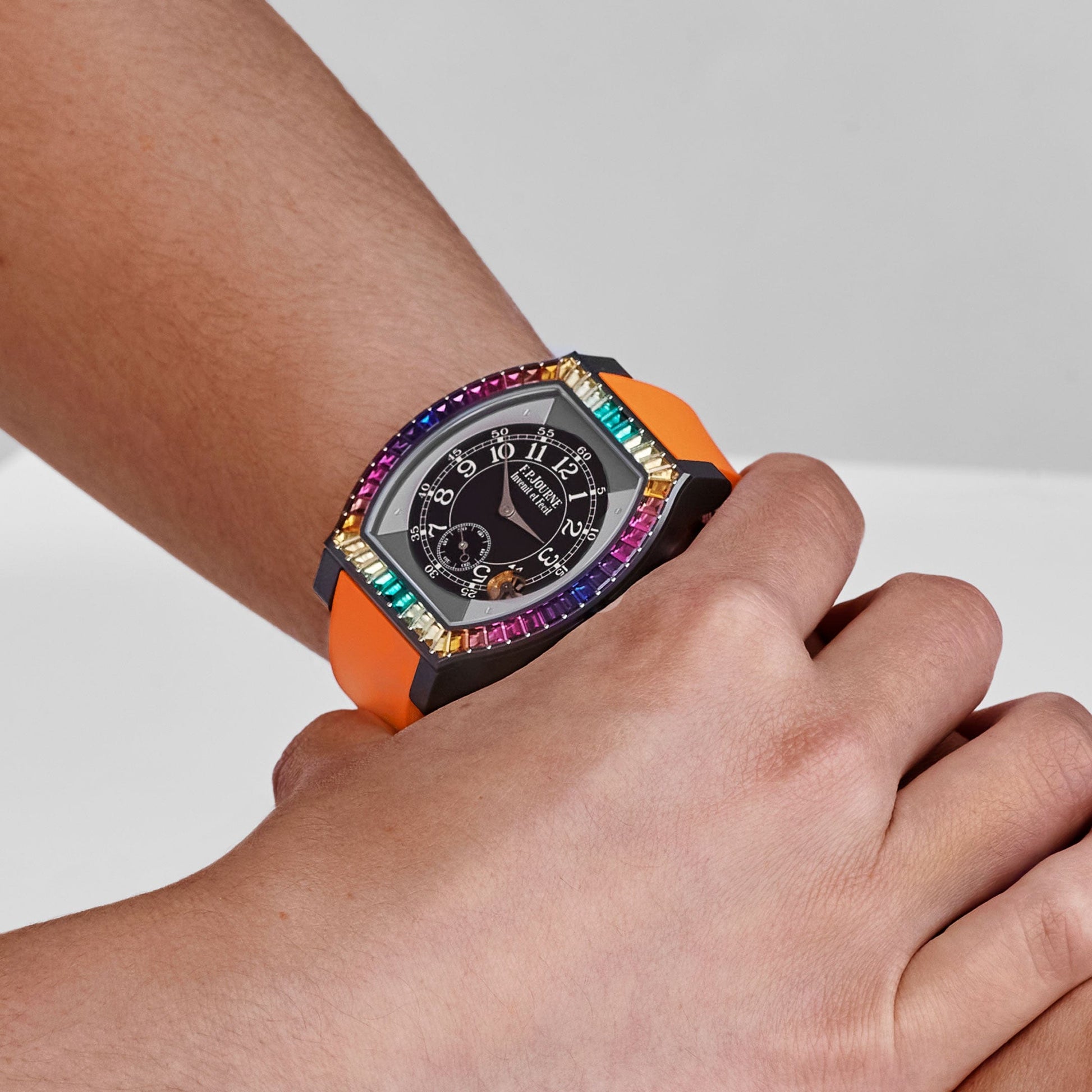 The F.P. Journe Élégante 48 “Gino’s Dream” in Titalyt is a striking limited edition that merges haute horlogerie with bold color expression. The 48 × 40 mm Flat Tortue case is micro-blasted Titalyt, giving it a matte, technical finish that contrasts beautifully with its bezel—set with 52 individually selected baguette glass “rainbow” pieces arranged in a graduated spectrum. The luminescent black dial glows softly after dark, adding a layer of ethereal presence beneath the colorful bezel ring.