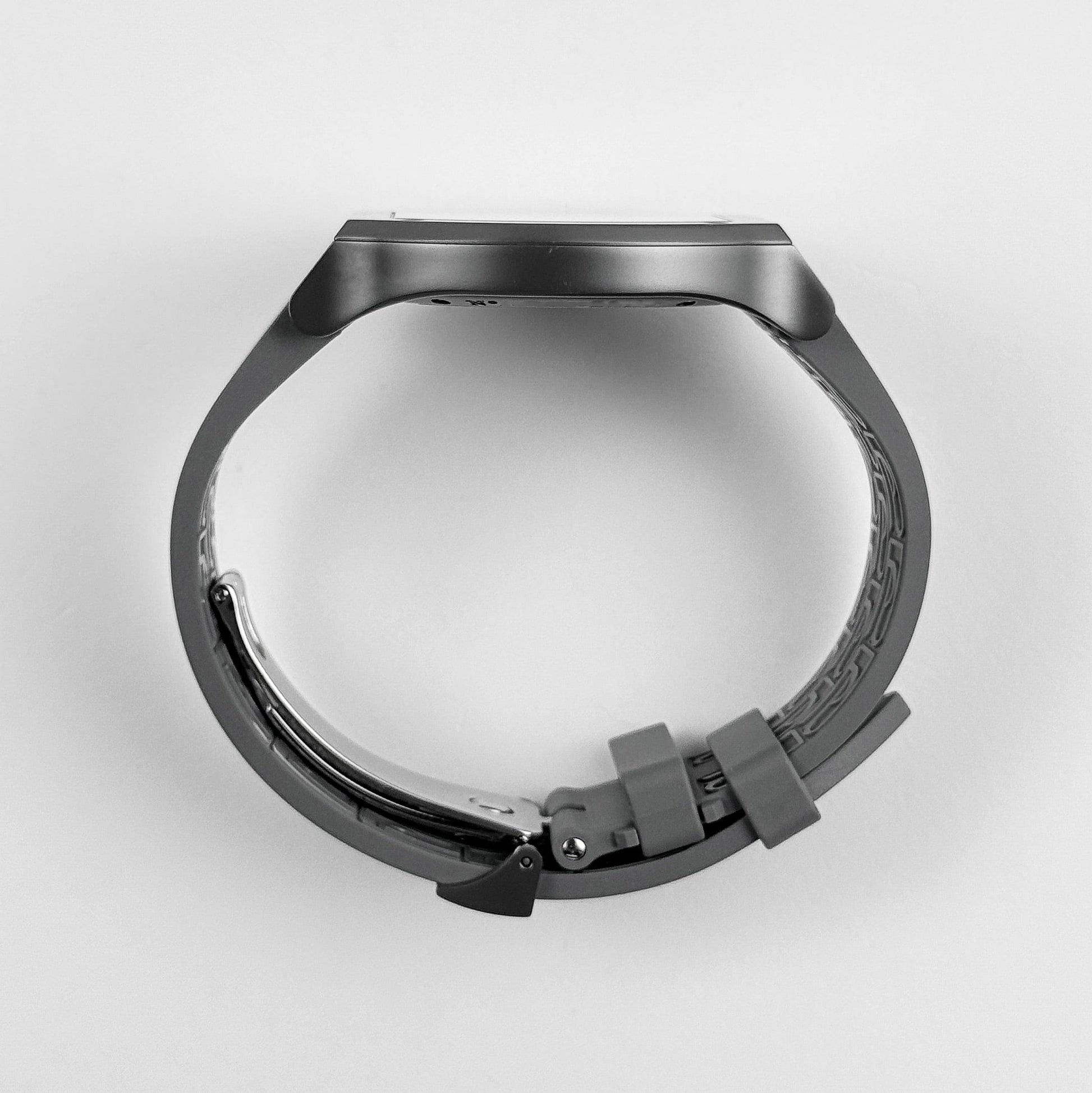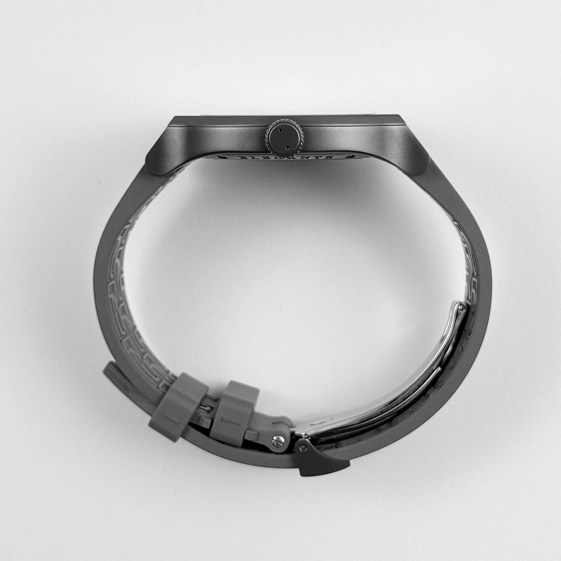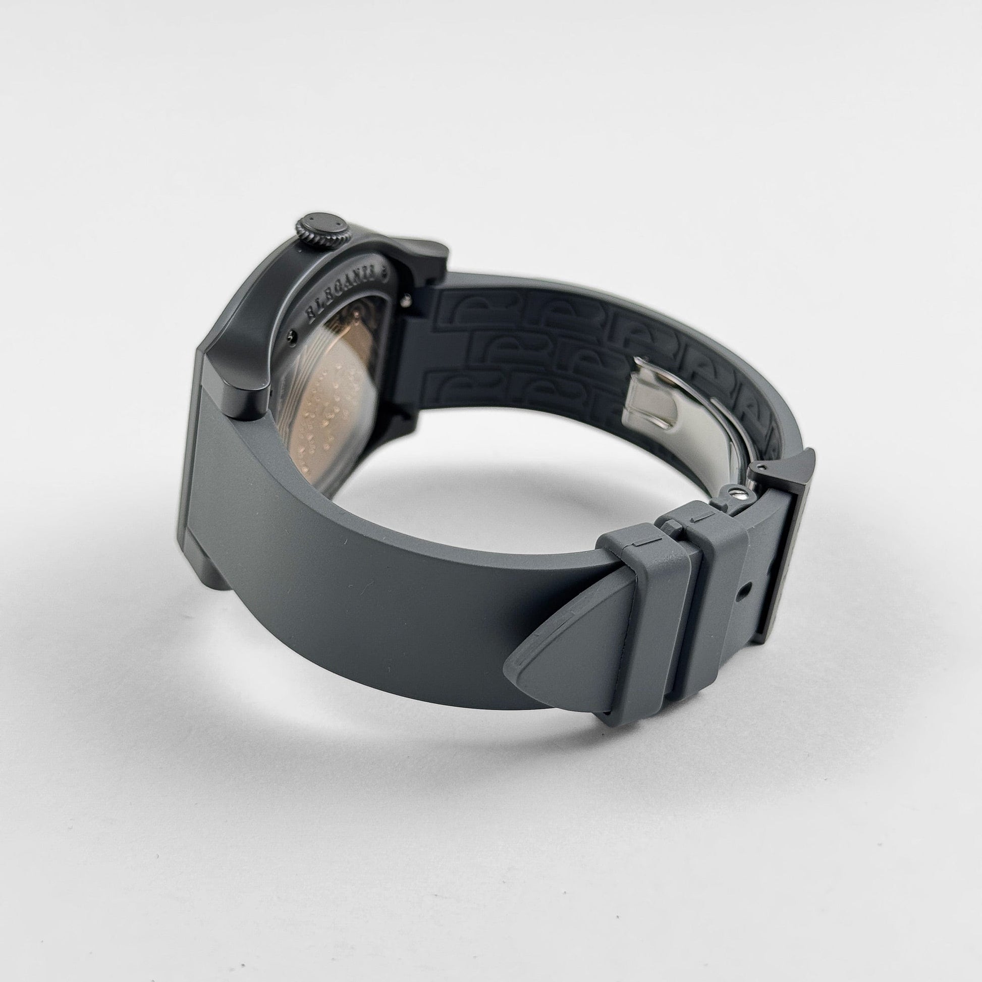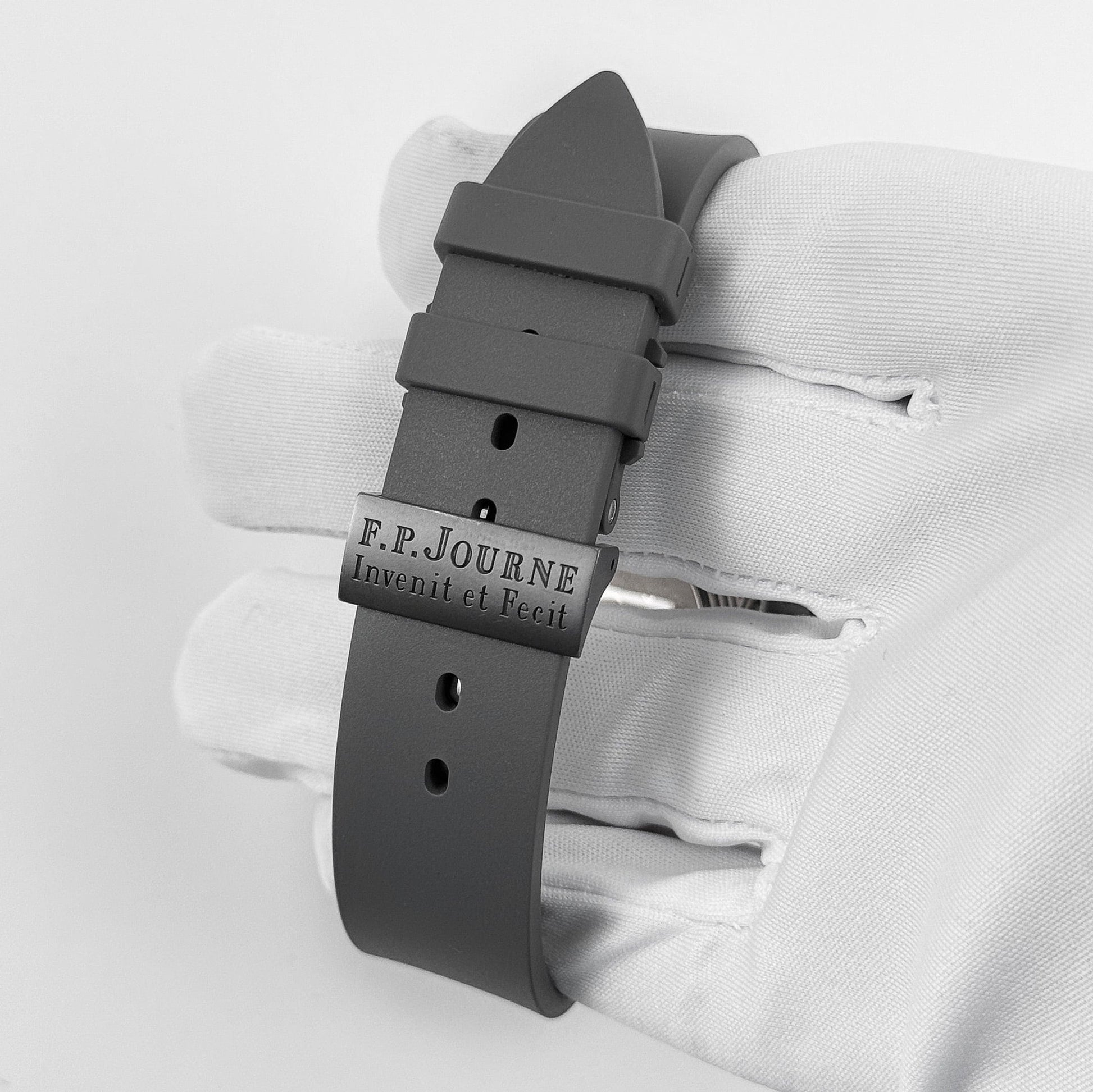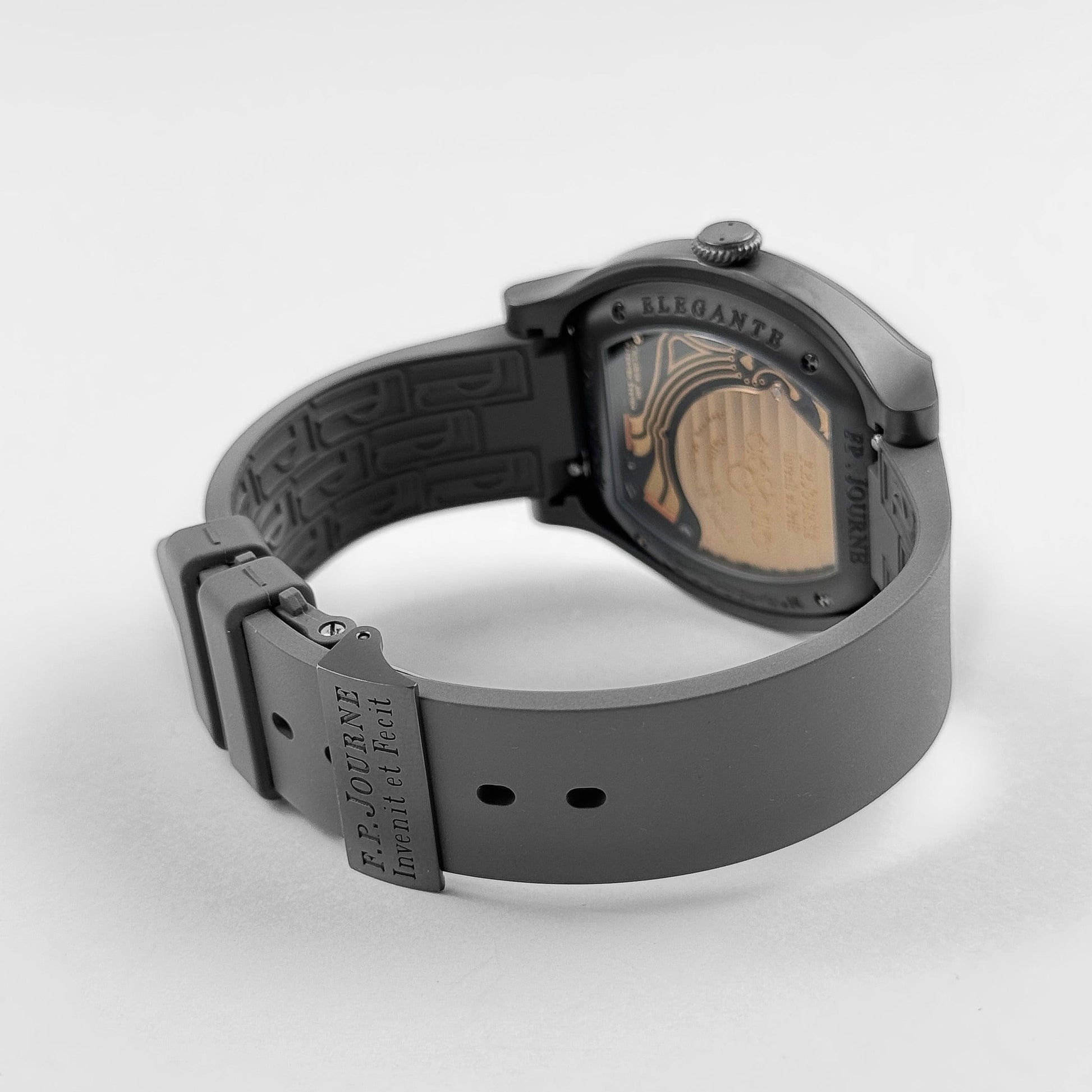 The F.P. Journe Élégante 48 in Titalyt delivers a striking blend of avant-garde design and discreet functionality. Featuring a 48 mm micro-blasted Titalyt case, its luminescent white dial channels a soft glow in low light, complemented by blue hands for enhanced readability. The seamless rubber strap echoes the dial’s aesthetic, while the signature F.P. Journe movement architecture remains elegantly concealed, allowing collectors to focus purely on clean, contemporary lines.