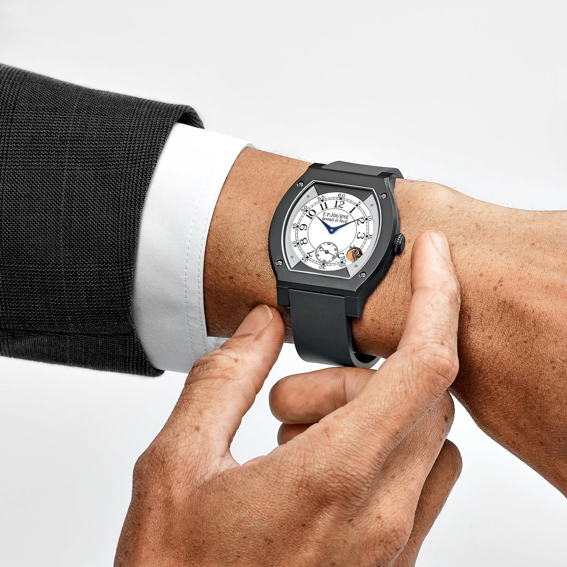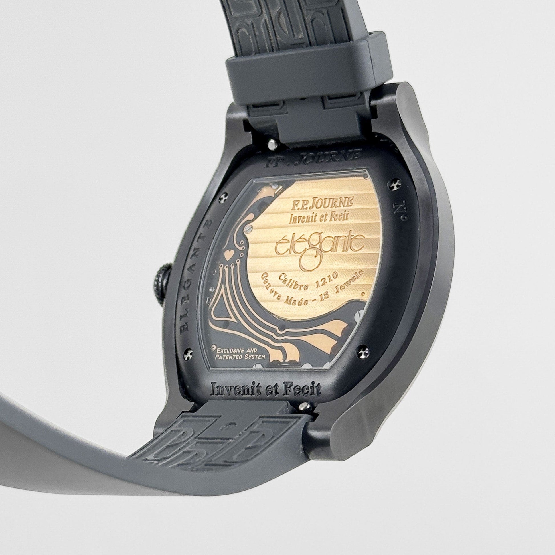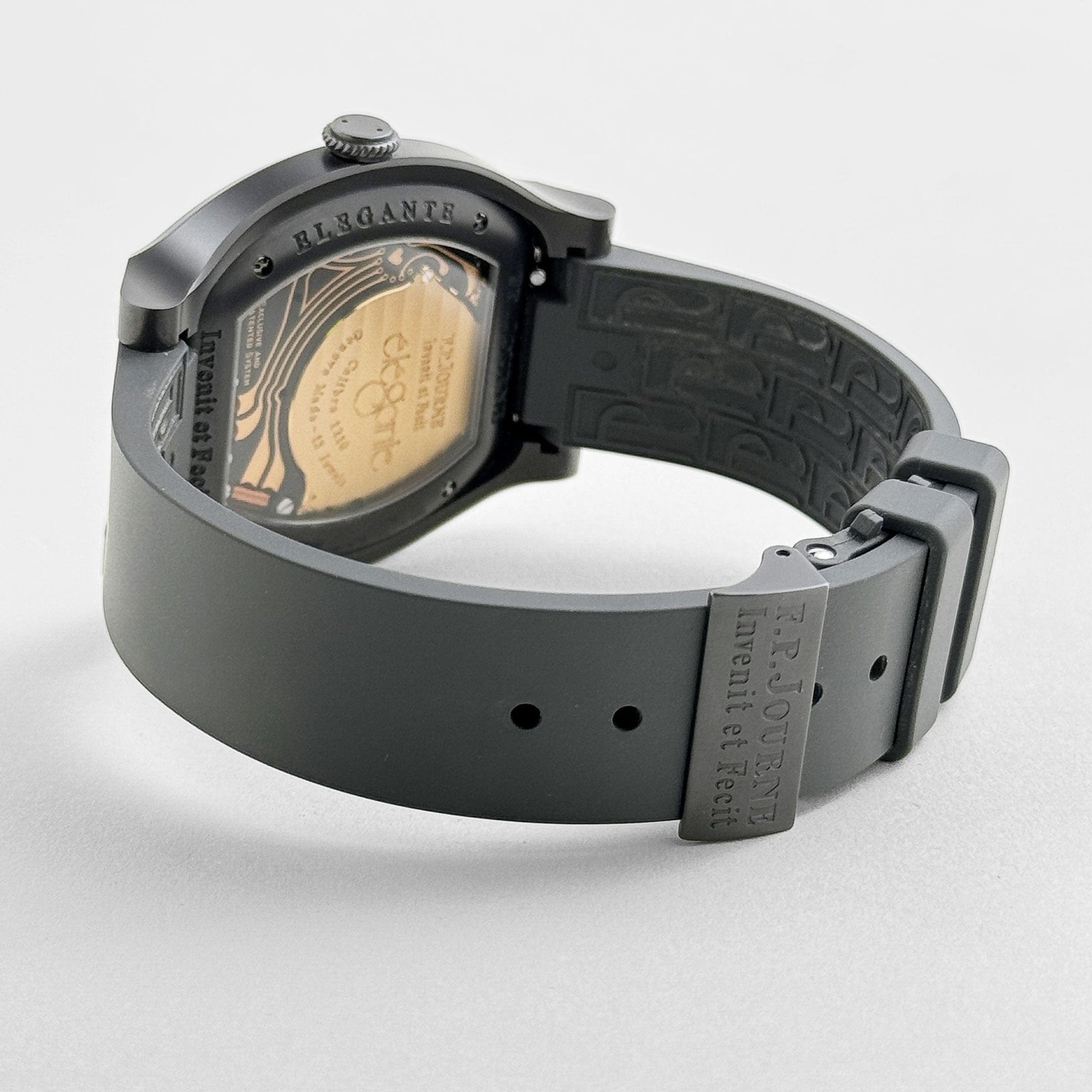 The F.P. Journe Élégante 48 in Titalyt delivers a striking blend of avant-garde design and discreet functionality. Featuring a 48 mm micro-blasted Titalyt case, its luminescent white dial channels a soft glow in low light, complemented by blue hands for enhanced readability. The seamless rubber strap echoes the dial’s aesthetic, while the signature F.P. Journe movement architecture remains elegantly concealed, allowing collectors to focus purely on clean, contemporary lines.