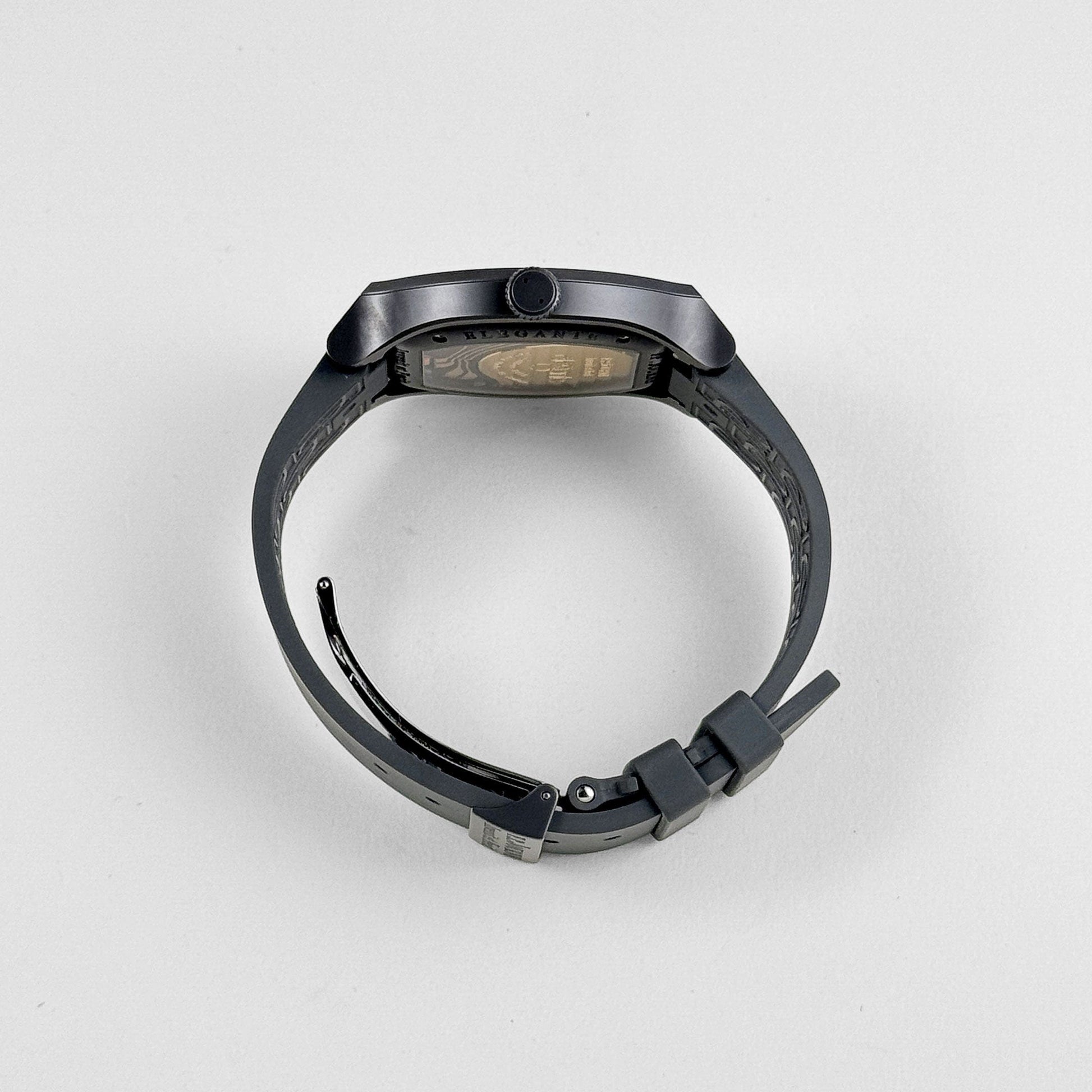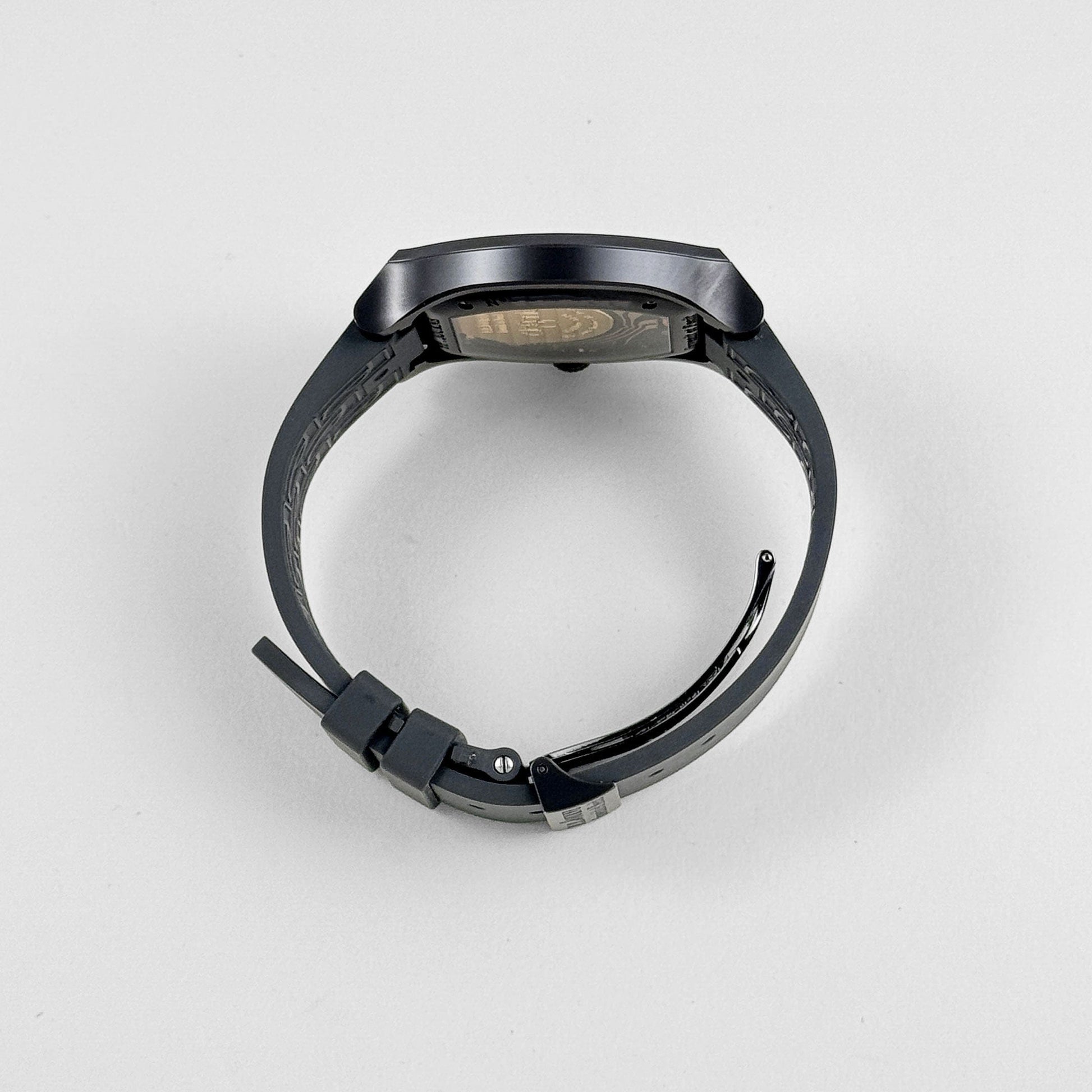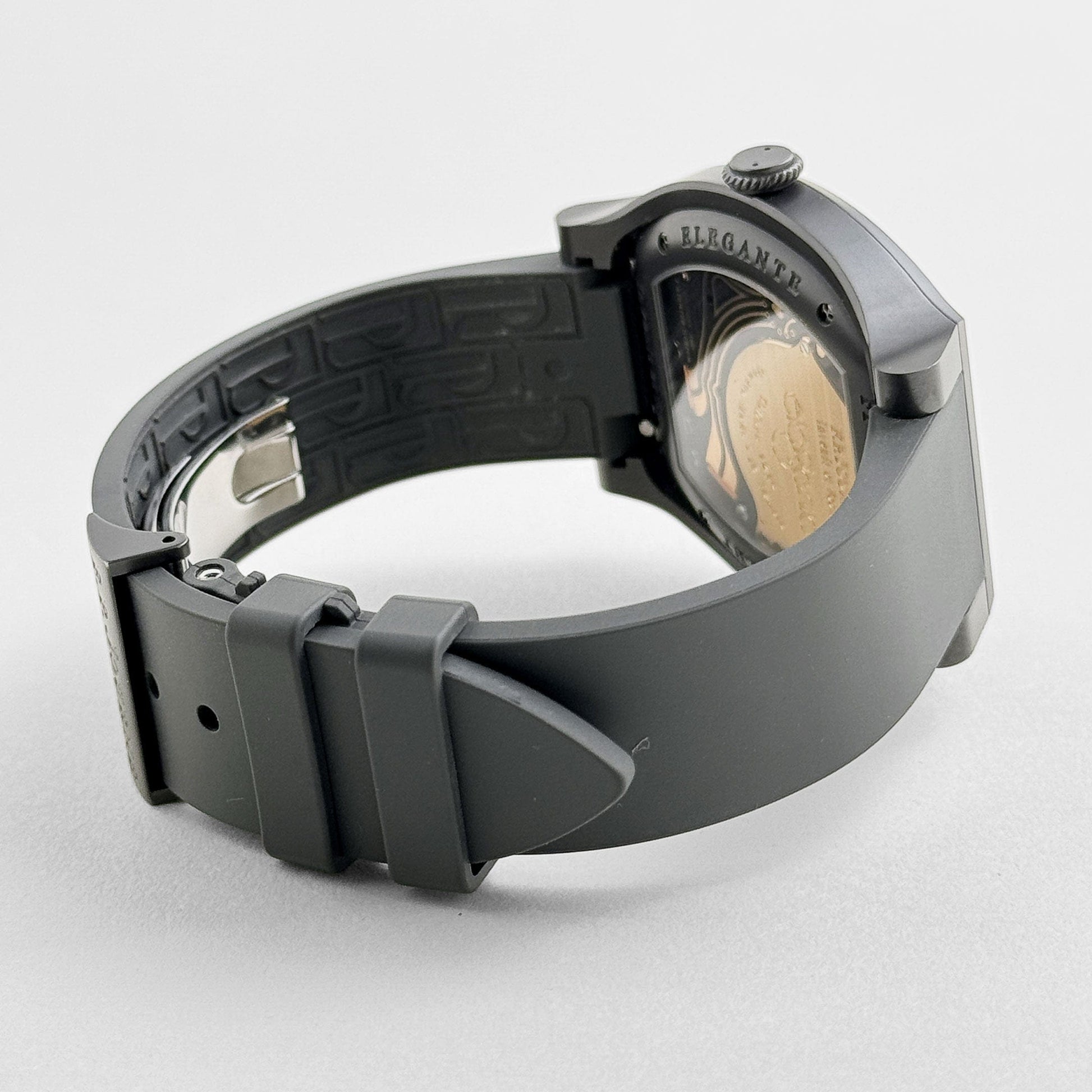 The F.P. Journe Élégante 48 in Titalyt delivers a striking blend of avant-garde design and discreet functionality. Featuring a 48 mm micro-blasted Titalyt case, its luminescent white dial channels a soft glow in low light, complemented by blue hands for enhanced readability. The seamless rubber strap echoes the dial’s aesthetic, while the signature F.P. Journe movement architecture remains elegantly concealed, allowing collectors to focus purely on clean, contemporary lines.