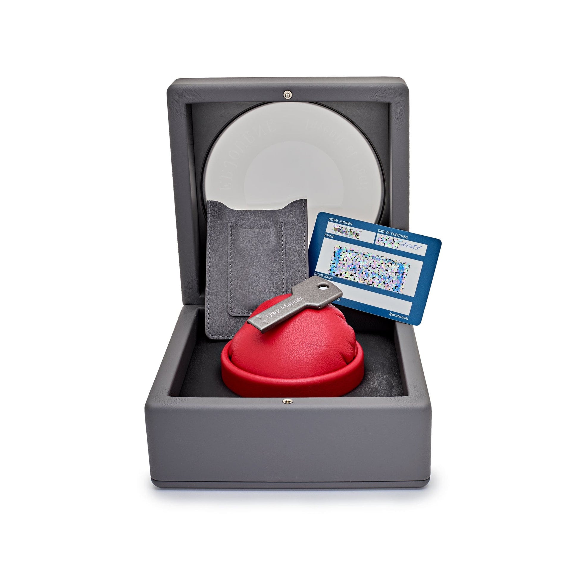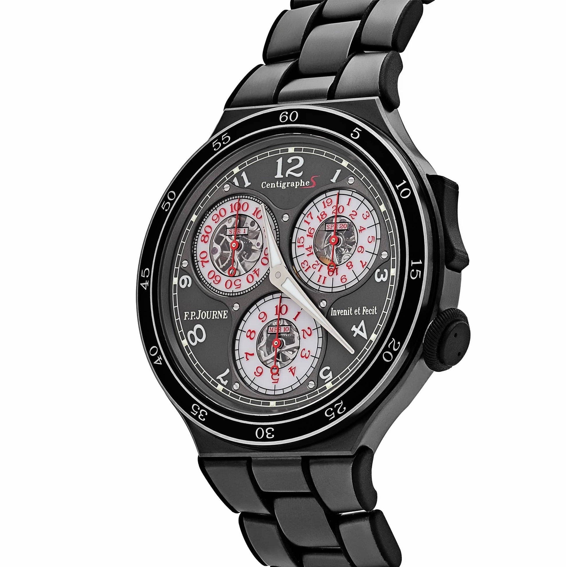 The dial features three subdials for measuring elapsed times—1 second, 20 seconds, and 10 minutes—displayed in a highly legible layout. The red accents on the subdial tracks and hands add a sporty touch, contrasting beautifully with the muted grey tones. Powered by F.P. Journe's patented chronograph mechanism, this timepiece delivers unparalleled precision without compromising its elegant design.