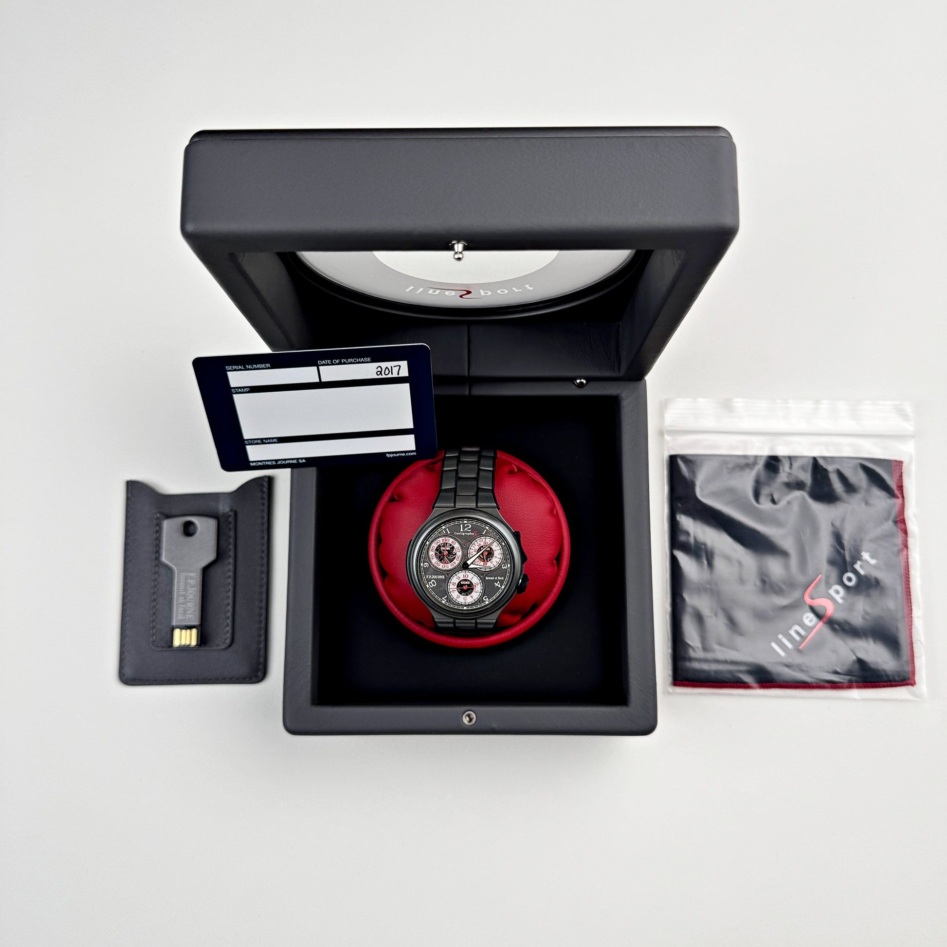 This F.P.Journe Linesport Centigraphe is crafted in a 42mm titanium case and styled on a matching bracelet. The slate grey dial hosts three chronograph sub-dials with markers in a striking red. Complications include one-second, 20-second, and 10-minute chronographs, as well as central hour and minutes. An exhibition case back reveals the intricate Calibre 1506, powering all of the watches functions.