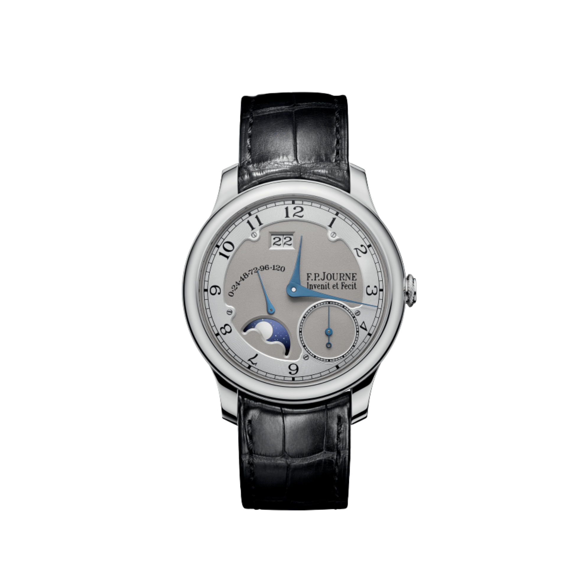 The F.P. Journe Octa Divine (Ref. D) houses the Octa 1300.3 calibre in an elegant 40mm platinum case. Its dial is rendered in a guilloché-finished whitened silver, with applied white-gold numerals and apertures, delivering a harmonious contrast against the cool tone of platinum. The design accommodates central hours and minutes, a large instantaneous date, a moonphase indicator, small seconds, and a retrograde power reserve display—all arranged with Journe’s signature balance and dial clarity.