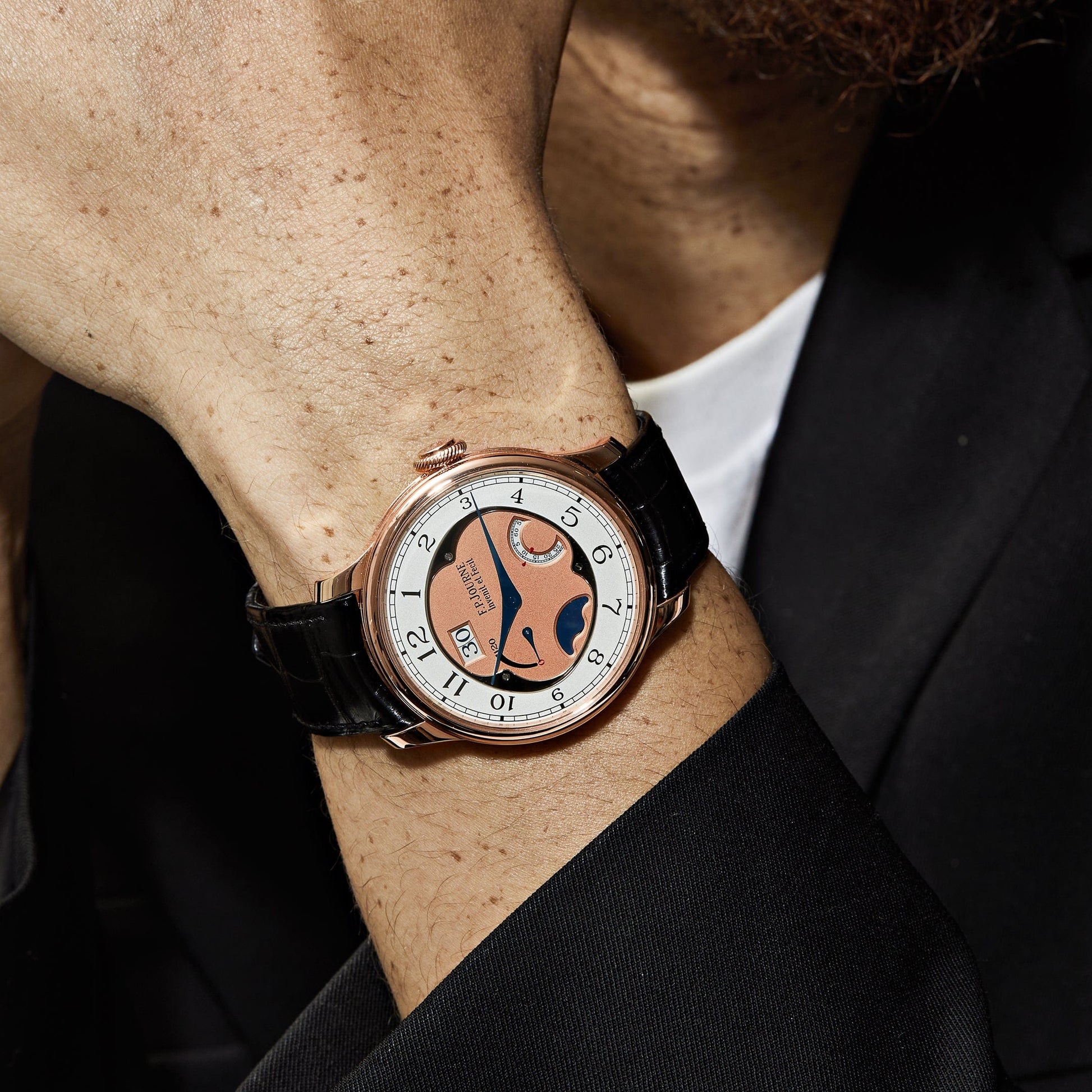 This F.P. Journe Octa Divine is crafted in a 42mm rose gold case and styled on a leather strap. The rose gold dial hosts a collage of high-end functionality and blue steel markers. Complications include central hours and minutes, small seconds, Moon Phases, and a power reserve indicator. An exhibition case back reveals the intricate Calibre 1300.3, powering all of the watches functions.