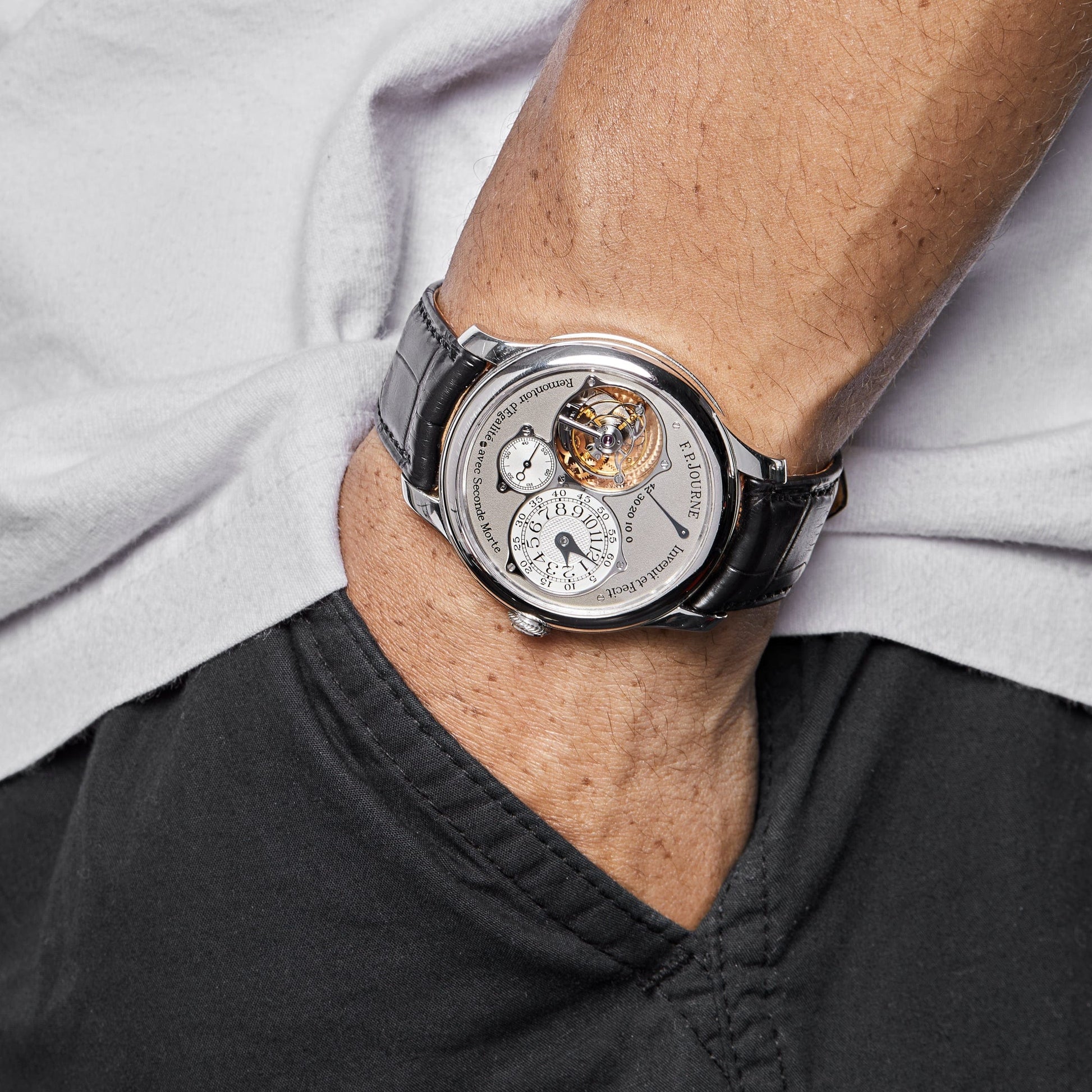 The F.P. Journe Tourbillon Souverain watch, introduced in 1999 by François-Paul Journe, is a remarkable timepiece known for its precision and craftsmanship. This watch features a unique Invenit et Fecit mechanism, making it one of the most accurate tourbillon wristwatches with a remontoire available. The 40mm case comes in platinum, allowing a view of the intricate mechanism through a transparent sapphire crystal case-back. The white gold dial showcases steel circles screwed onto the face, with silver "guilloché" dials for hours, minutes, and seconds.