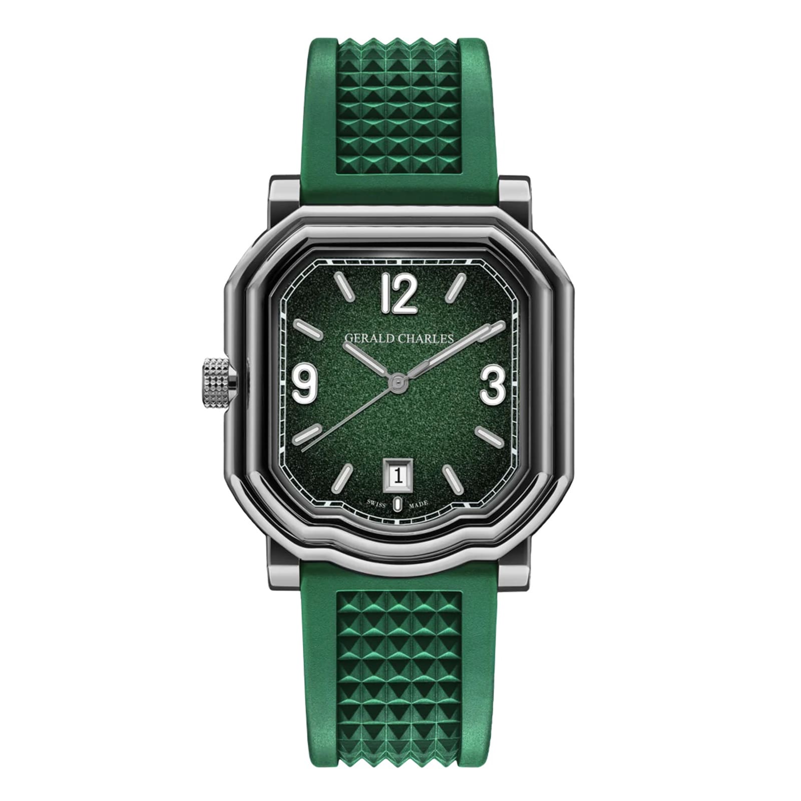 LIMITED EDITION OF 200 PIECES The GC Sport graduated green dial, with applied Arabic numerals at 3, 9 and 12, captures the spirit of the grass court tennis season. The watch's ergonomic case measuring only 8.7mm in thinness and its lightweight design in polished Grade 5 titanium, make it possible for tennis players to wear it during the game. The matching vulcanized rubber strap is decorated with the Maison's signature Clous de Paris motif on the top side, and with Gerald Charles logo tapisserie on the other.