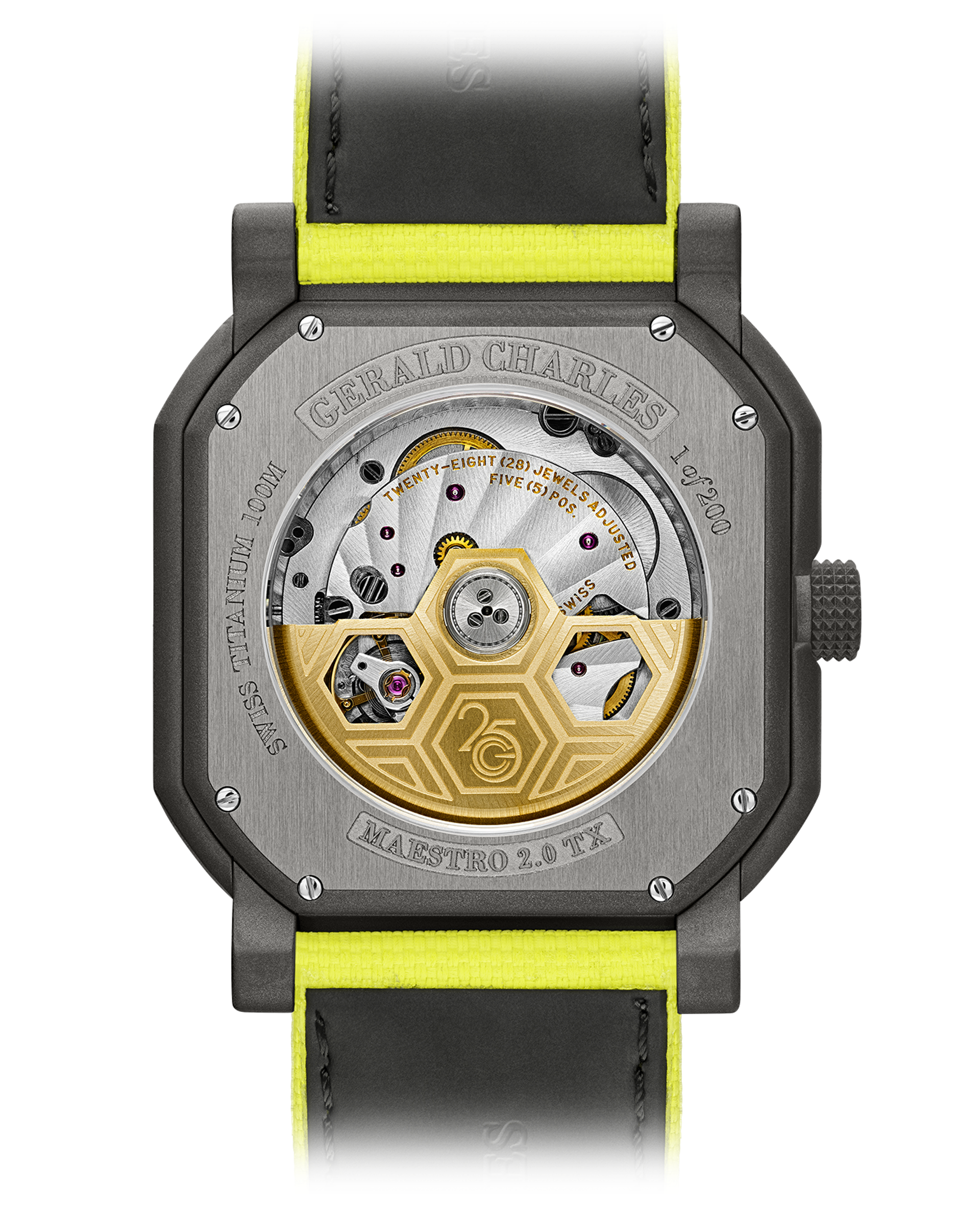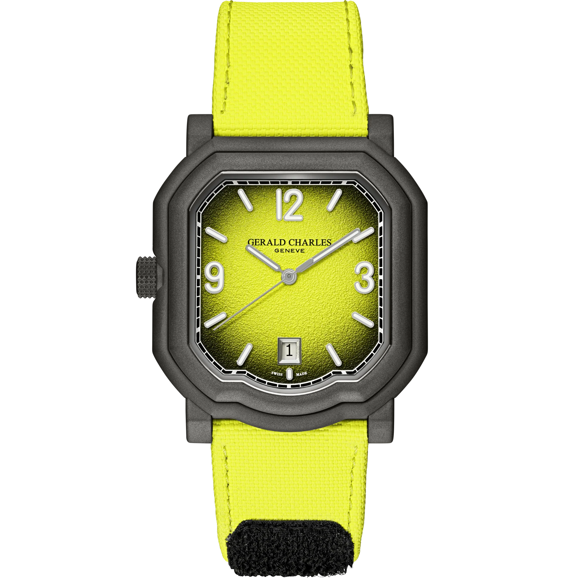The GC Sport Tennis features a Darkblast® titanium case and a grainy-textured yellow dial with applied Arabic numerals at 3, 9, and 12. Inspired by modern tennis aesthetics, its ultralight Velcro strap, crafted in-house in Geneva, mirrors the dial’s porous effect. Tested and approved by professional players, it boasts 5G shock resistance, weighs only 64 grams, and features a left-hand crown to prevent rubbing during matches. The ErgonTeq® design ensures the lugs, case, and strap sit ergonomically, adapting to all wrist sizes for maximum stability and weight distribution. Engineered for performance and versatility, this timepiece embodies Gerald Charles’ commitment to innovation and comfort.