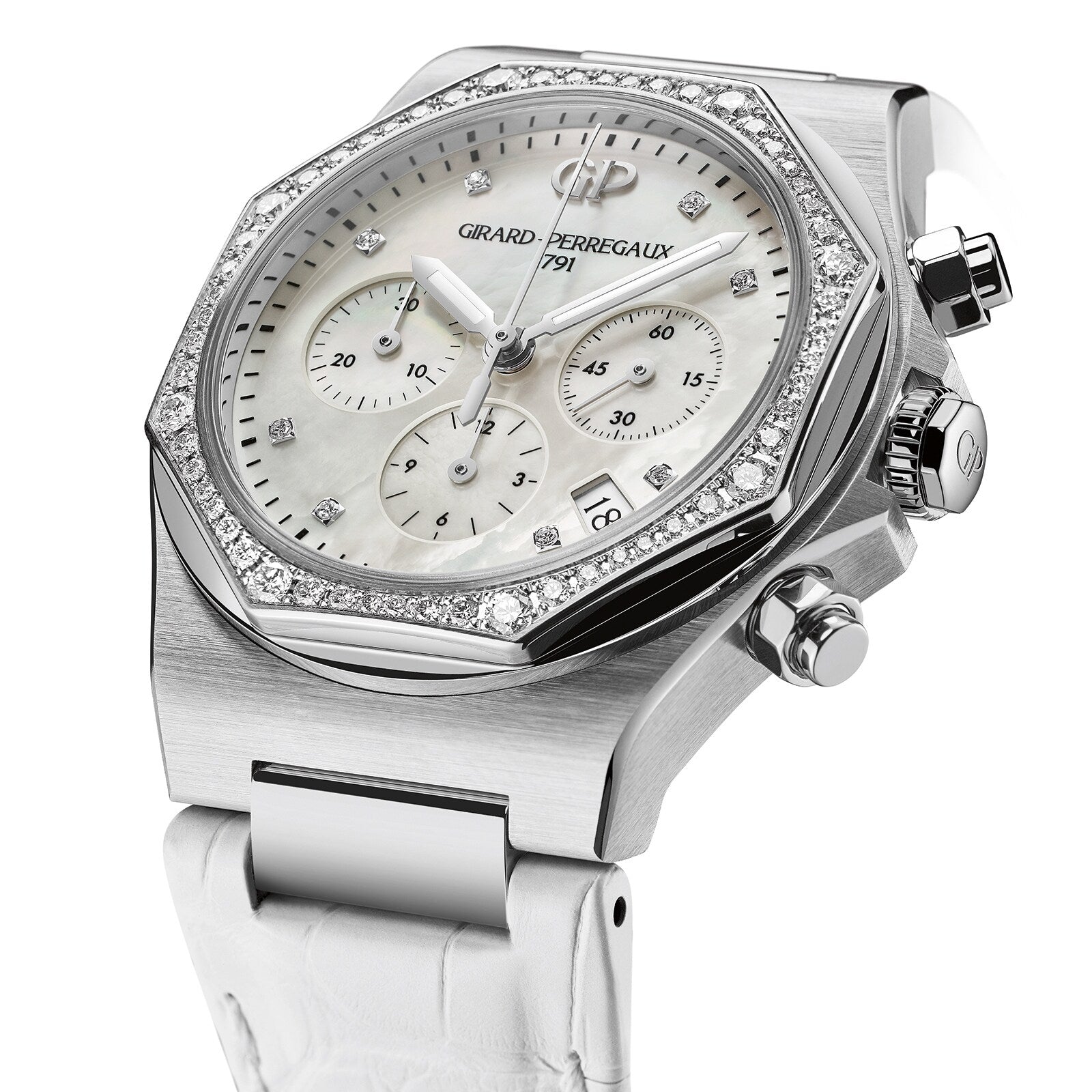Laureato Chronograph –Essence, elegance, and presence Blending aesthetics and functionality Presented in a 38mm steel case Framed by the collection’s iconic polished octagonal bezel set with glistening diamonds Powered by the calibre GP03300 self-winding chronograph movement DRIVING EVOLUTION First launched in 1975, the Laureato is a true gem amongst the brand’s iconic models, embracing sporty lines and classic elegance. Showcasing the collection at its sportiest and most contemporary, the latest models are truly uncompromising, offering a fascinating material spectrum – from bold, architectural steel and super-light titanium to classic pink gold and the radiant sparkle of brilliant cut diamonds. A commanding feature of the first Laureato, the iconic octagonal bezel remains a core part of this exemplary collection. ESSENCE AND CHARISMA This uncompromising chronograph model is presented in a 38mm steel case, secured with a white alligator leather strap. Reflecting the light radiating from the diamond-set octagonal bezel, the white mother-of-pearl dial is both functional and ethereal, with three chronograph sub-dials, a date display, and 8 diamond indexes. The impeccably accurate calibre GP03300 self-winding chronograph movement ensures flawless precision, driving two counter and small seconds dials, as well as the date display. A 46-hour power reserve and water resistance to 10 bar (100 metres) further enhance the performance of this captivating timepiece.