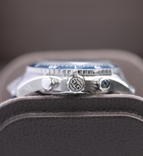 Cool stainless steel and intense blue give this chronograph a striking look. Its finely finished movement with column wheel switch can be easily admired through the sapphire crystal case back. Like all SeaQ models, it is tested according to the strict ISO 6425 and DIN 8306 standards. The SeaQ Chronograph is water resistant up 30 bar (300 m) and is available with a black rubber strap, a stainless steel bracelet or a robust synthetic fabric strap in grey or blue.