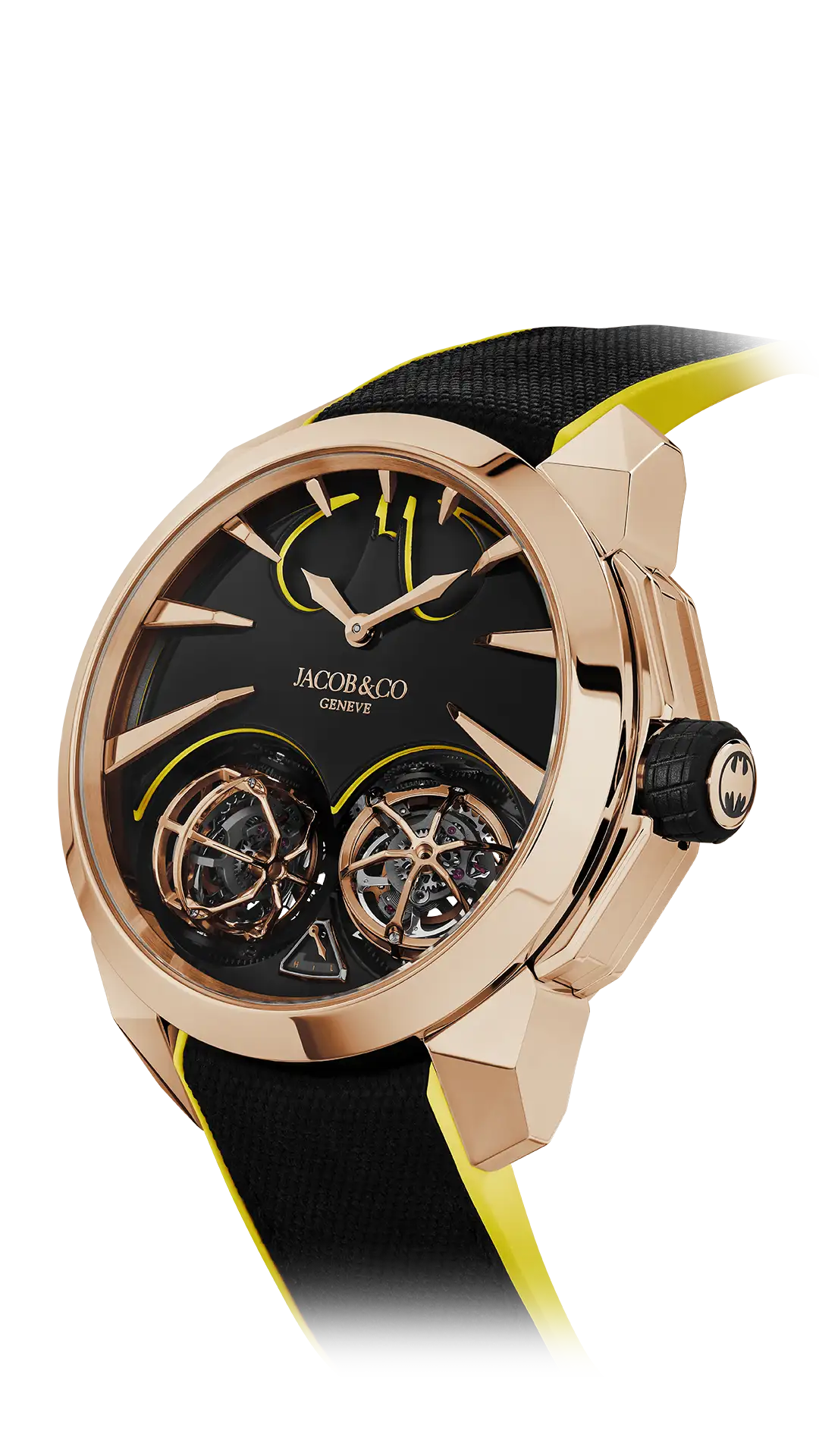 I . ITEM NUMBER DC100.40.AA.AA.A II . MOVEMENT Caliber : JCFM10 Winding : Hand-wound Components : 382 Power Reserve : 48 Hours Frequency : 21'600 vph (3 Hz) Functions : Double Flying Triple-axis Tourbillon 1st Axis: Rotation in 24 Seconds 2nd Axis: Rotation in 48 Seconds 3rd Axis: Rotation in 180 Seconds III . CASE Size : 46 mm Height : 17.2 mm Material : 18K Rose Gold Crystal : Anti-Reflective Sapphire Crystal Caseback : Sapphire Crystal with Batman Signature Drawing Water resistance : 30 m (3 atm) IIII . DIAL & HANDS Dial : Bat-shaped Onyx, Yellow Outline Hands : Rose Gold-Plated, Sword-shaped V . STRAP & CLASP Strap : Cordura with Yellow Rubber Lining Clasp : 18K Rose Gold Deployant Clasp VI . LIMITED EDITION 72 Pieces