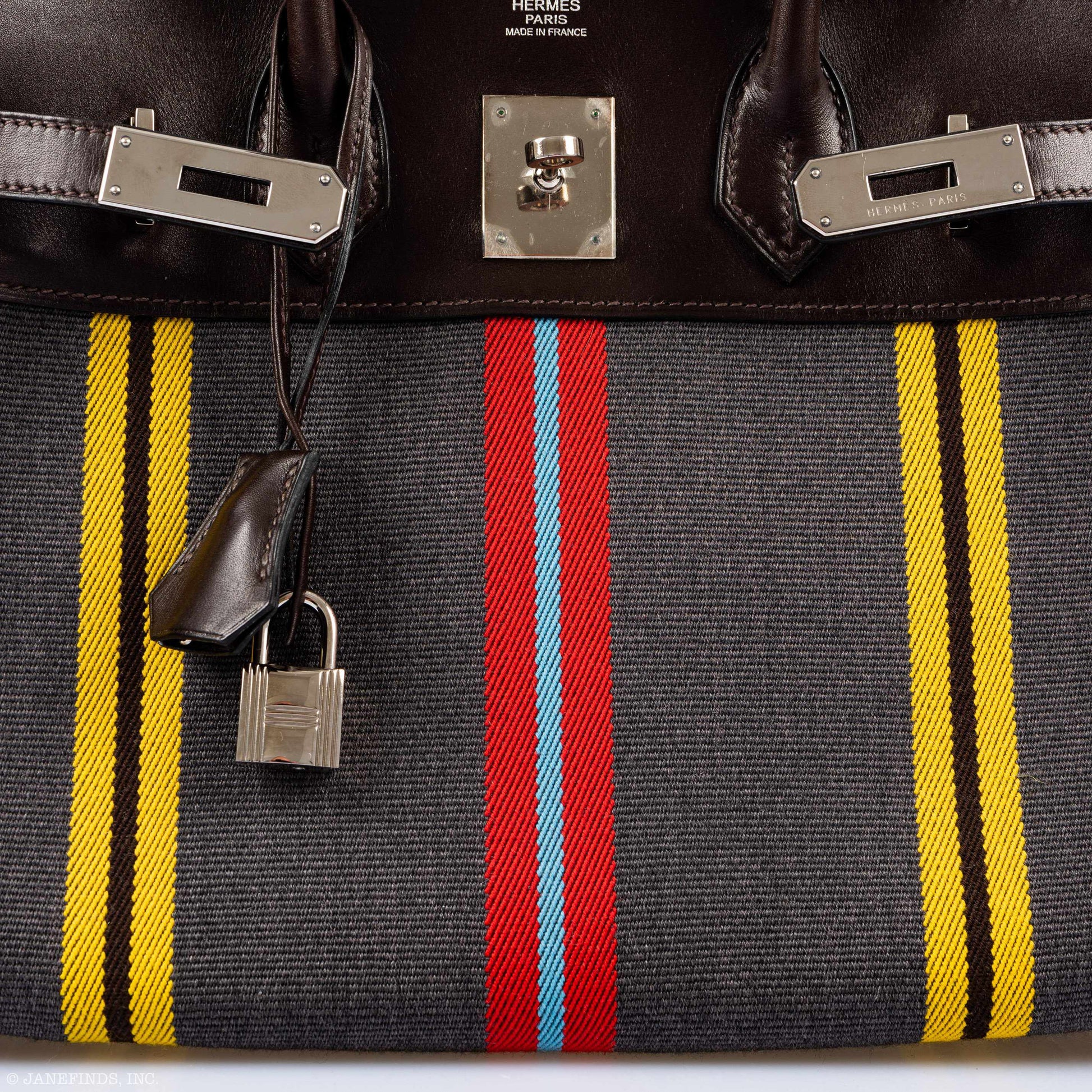 This is a very rare limited edition Birkin with a colorful and sporting wool Jumping canvas body and Marron Fonce Calf box trim. A few canvas Birkin's with different patterns were produced in the early 2000’s, mostly in small HAC Birkin's, so finding a 30cm Birkin is extremely special. Further, this is the most colorful version of the jumping canvas pattern, so we have an extremely special piece here, that is all at once sporting, colorful, casual, and extremely rare.
