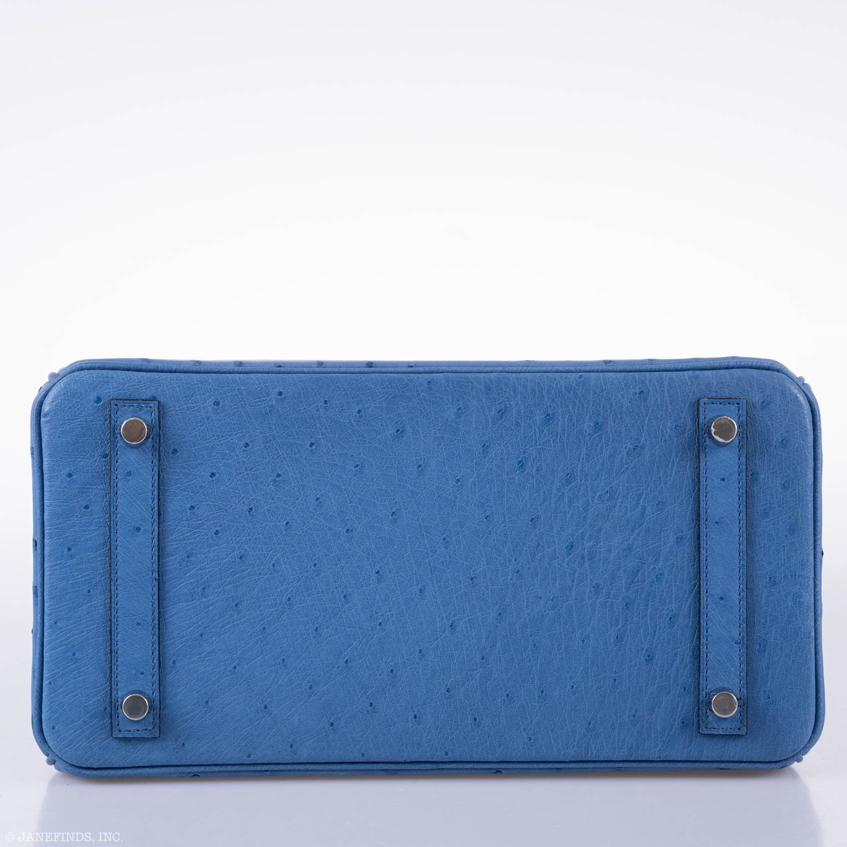 While  Hermès Birkin bags are considered the rarest and most desirable bags in the world, among Birkins, exotic examples are considered even more so. One example of rare exotic skins  Hermès uses to make Birkins is Ostrich, which features a unique pattern of dots made from the bird’s feathers.  Hermès produces Ostrich bags in few numbers, and takes special care when deciding which colors to use. This example, done in bright blue Mykonos Ostrich is a striking example that has been kept in store fresh condition. Paired with Palladium hardware, it is a unique vision that is guaranteed to stand out among other Birkins.