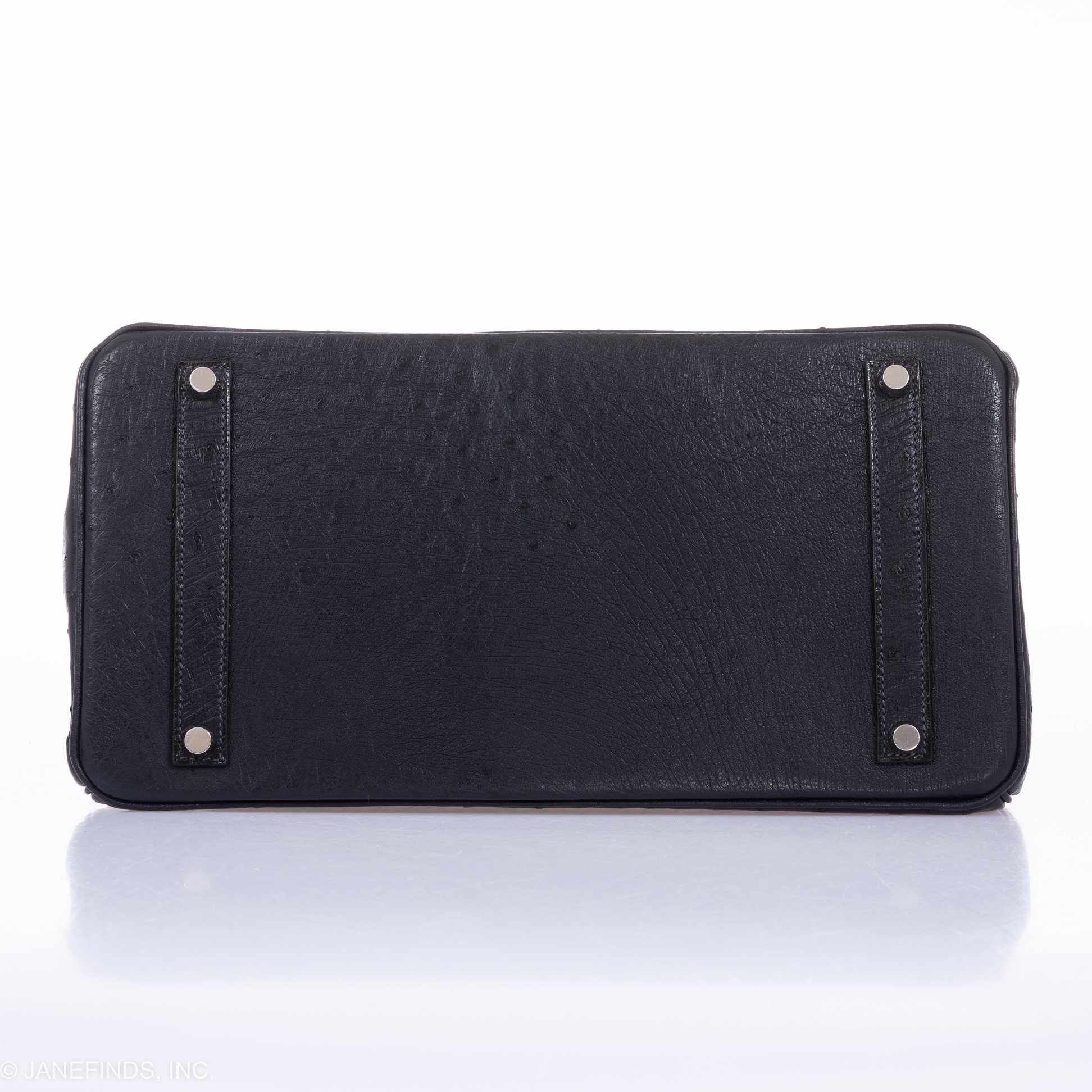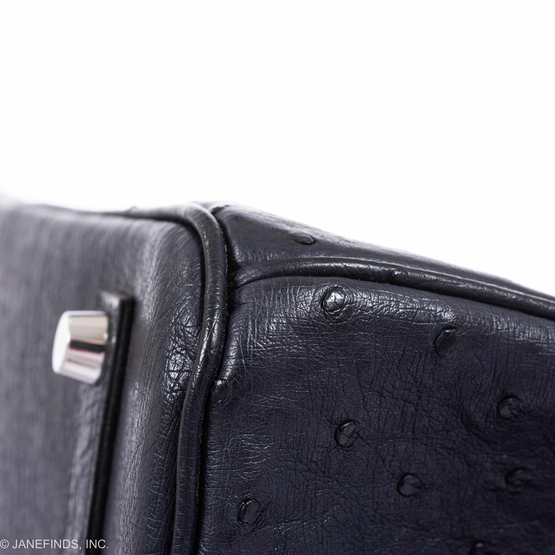 A stunner, the classic 35cm Birkin in the amazing Ostrich leather in beautiful rich Blue Indigo. Bridging the gap between casual and luxury, Ostrich in 35cm is now discontinued from Hermès. A perfect dark blue that is similar to Blue de Prusse with contrasting light blue stitching. This color reads more black than blue. This is a great investment piece the bag that is in pristine condition. The value will only appreciate on this incredible bag.