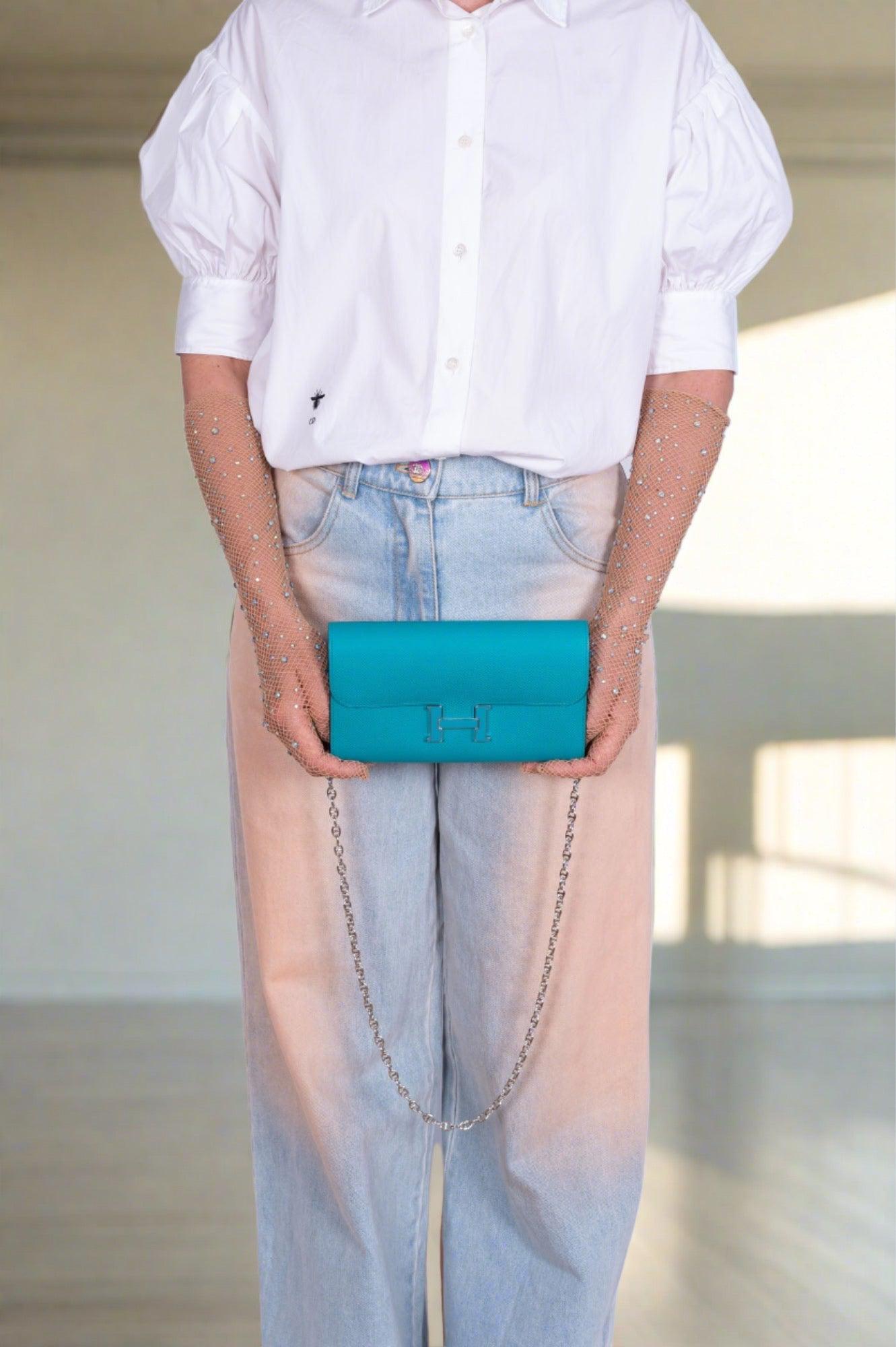 Despite its status as an extraordinary symbol of luxury, the allure of the Constance Long Wallet extends beyond its exclusivity. Resplendent in Blue Paon Epsom leather, this wallet exudes a rich hue that elevates it above traditional colors. Hermès, revered for its tradition of excellence, crafts this piece with meticulous attention to detail, featuring the iconic "H" clasp in striking gold. Palladium-tone hardware complements the clasp, adding a sleek appeal. The intelligently designed interior mirrors the exterior’s Blue Paon finish, with an assortment of slots and pockets to secure every fiscal necessity. An exterior pocket adds practicality, making the Hermès Constance Long Wallet a testament to sophisticated design and a celebration of the brand’s uncompromising quality. It's an investment in timeless elegance, balancing fashion with utility as the quintessential companion for the modern luxury connoisseur. Pairs perfectly with our Wide Cuban or Crossbody Mariner chain, pictured.