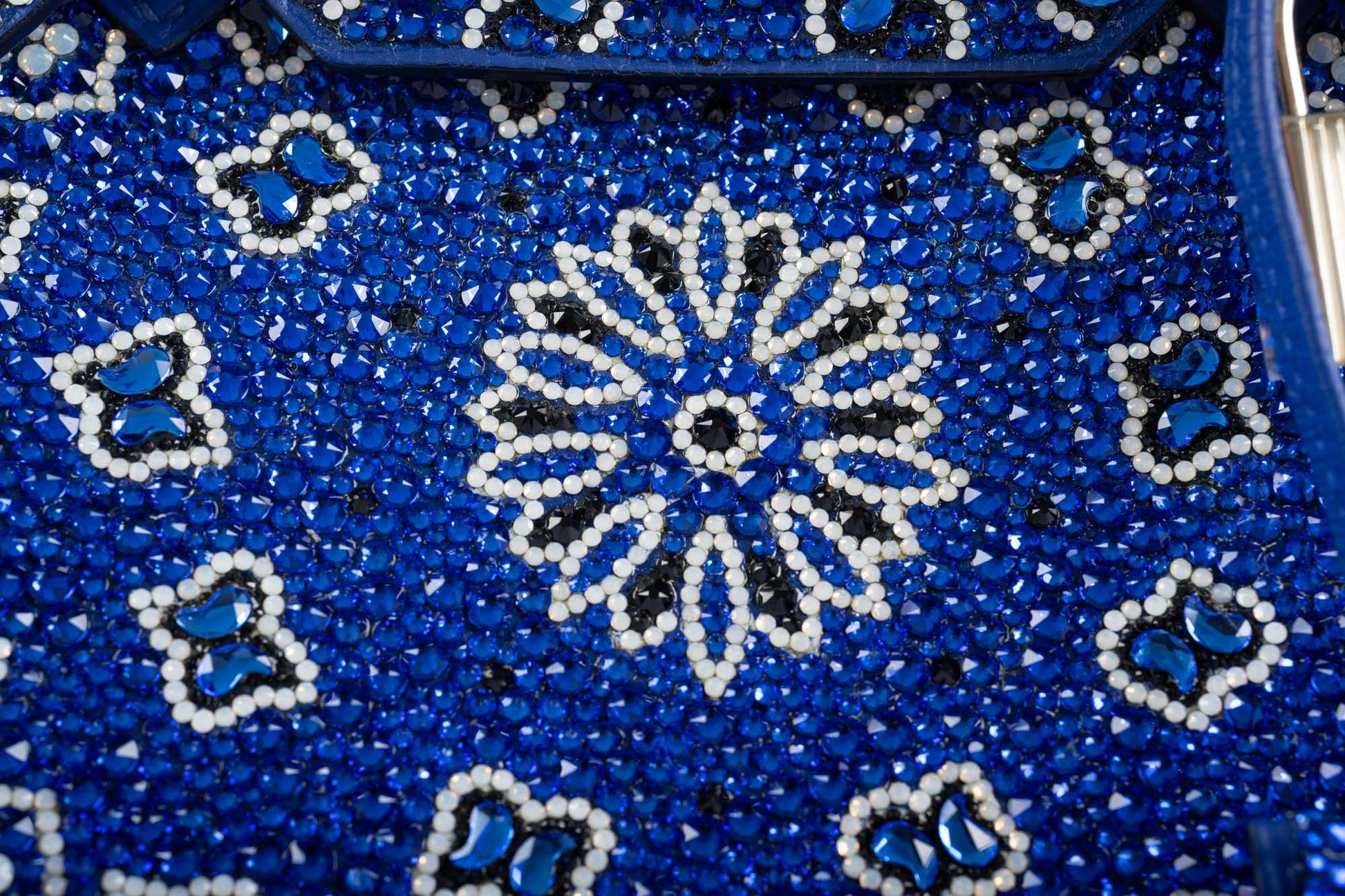 This Hermès Customized Swarovski Crystal Cowgirl Bandana Birkin is a dazzling homage to the wild spirit of the West, reimagined through the lens of a custom crystal encrusted Birkin. Adorned with an intricate array of blue Swarovski rhinestones, this Togo leather Birkin emulates the classic bandana pattern with a luxurious twist. The palladium hardware gleams against the sea of blue, adding a contemporary edge to this sartorial masterpiece. This Hermès Birkin isn't just an accessory; it's a statement that blends the heritage of Americana with the pinnacle of creativity, creating a piece that's as bold as it is beautiful.
