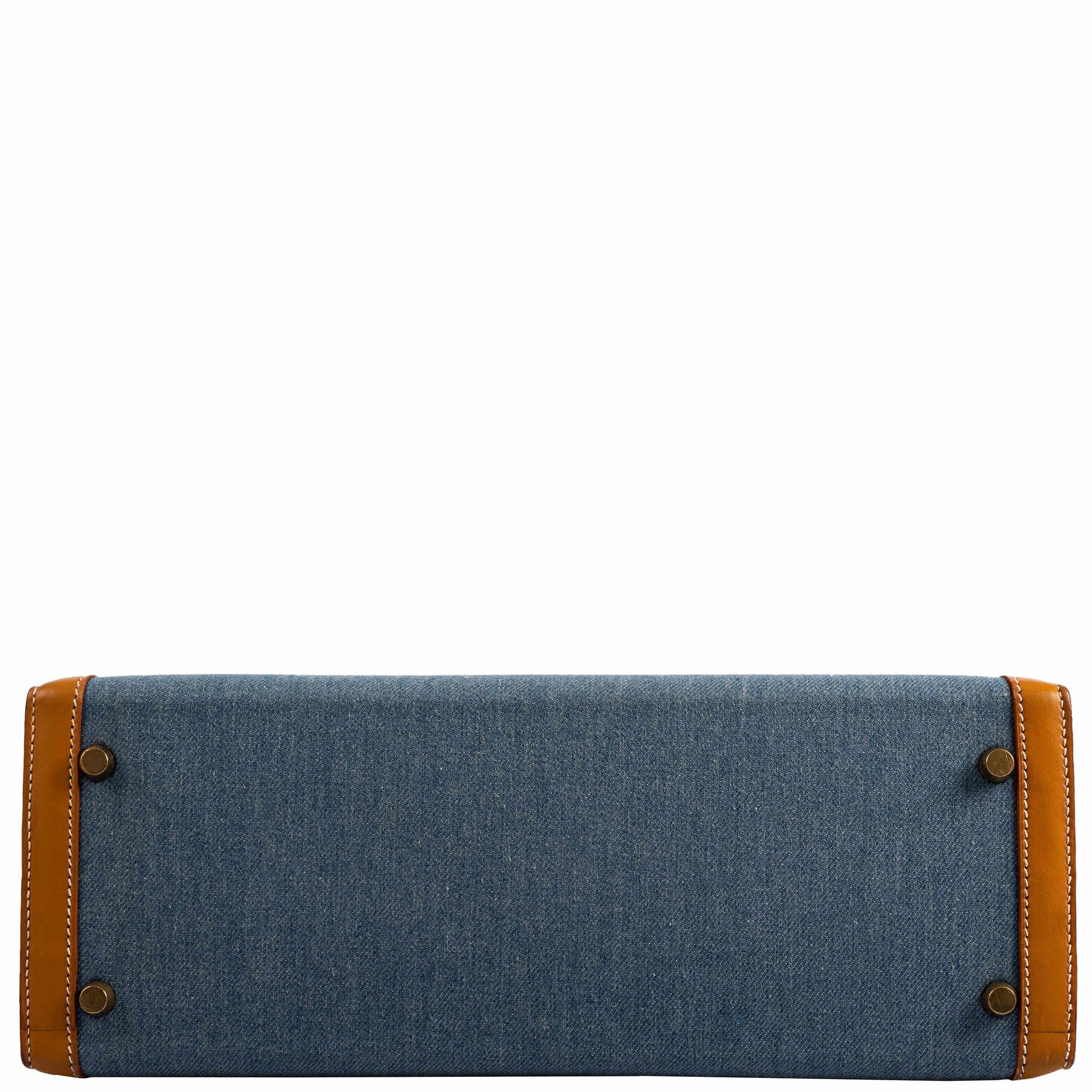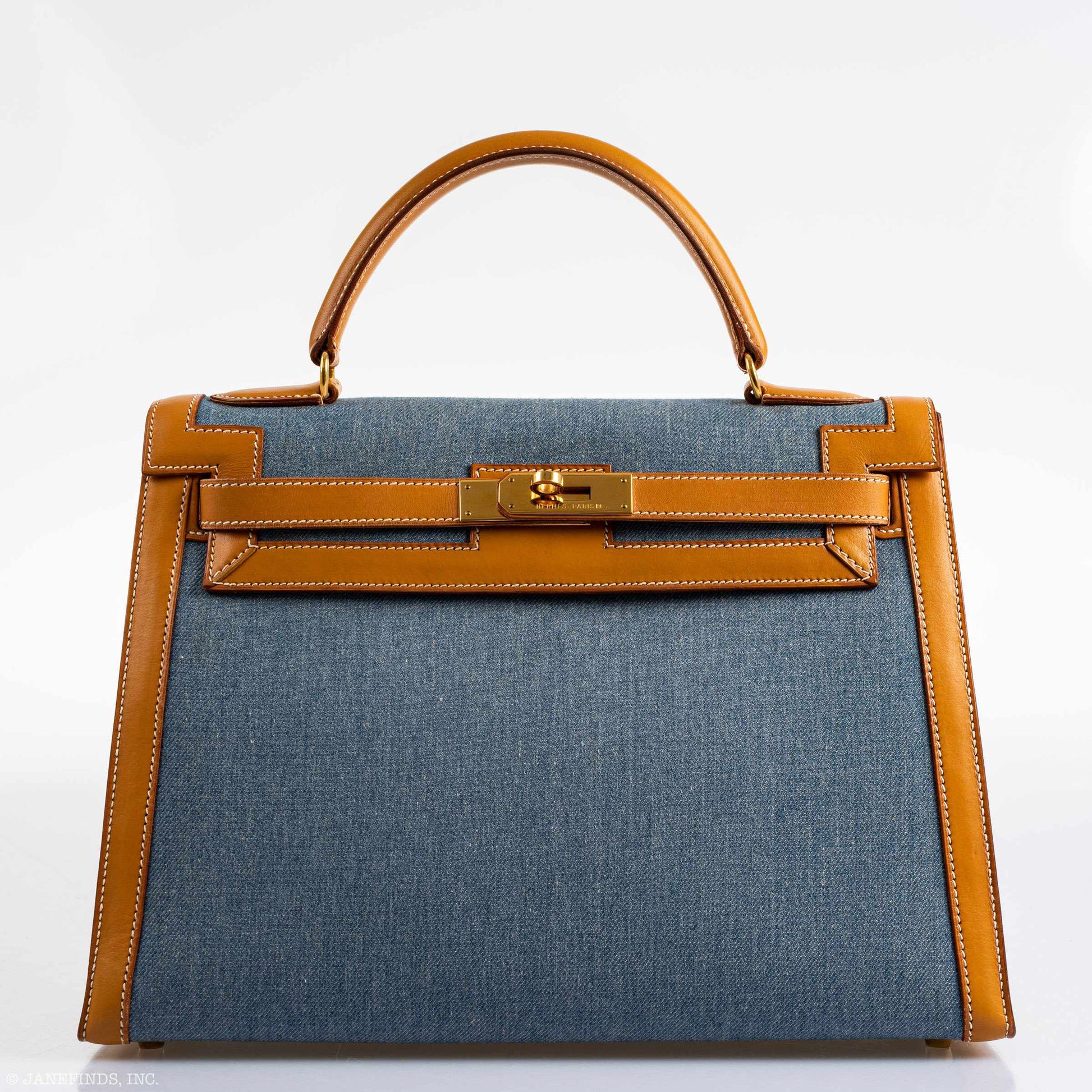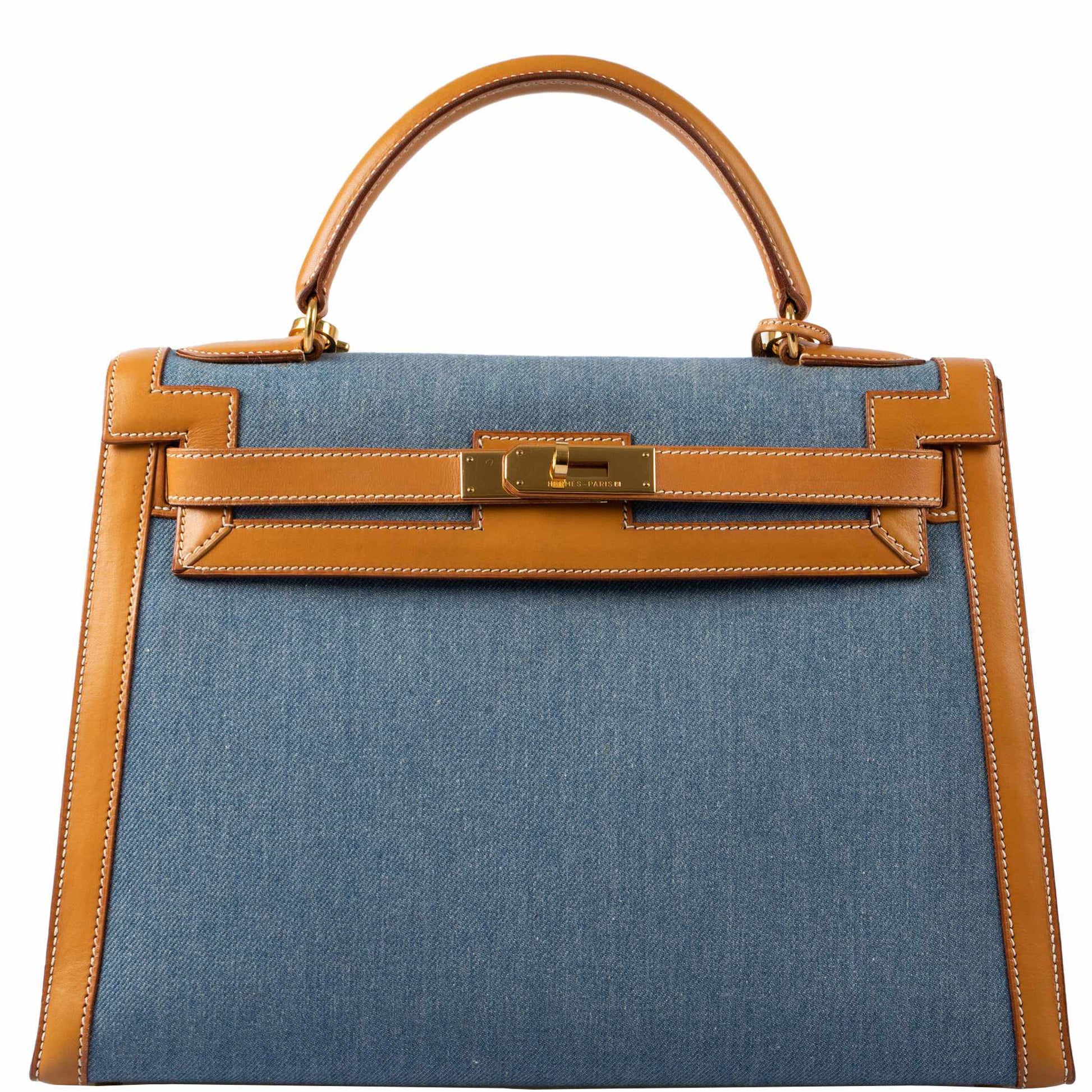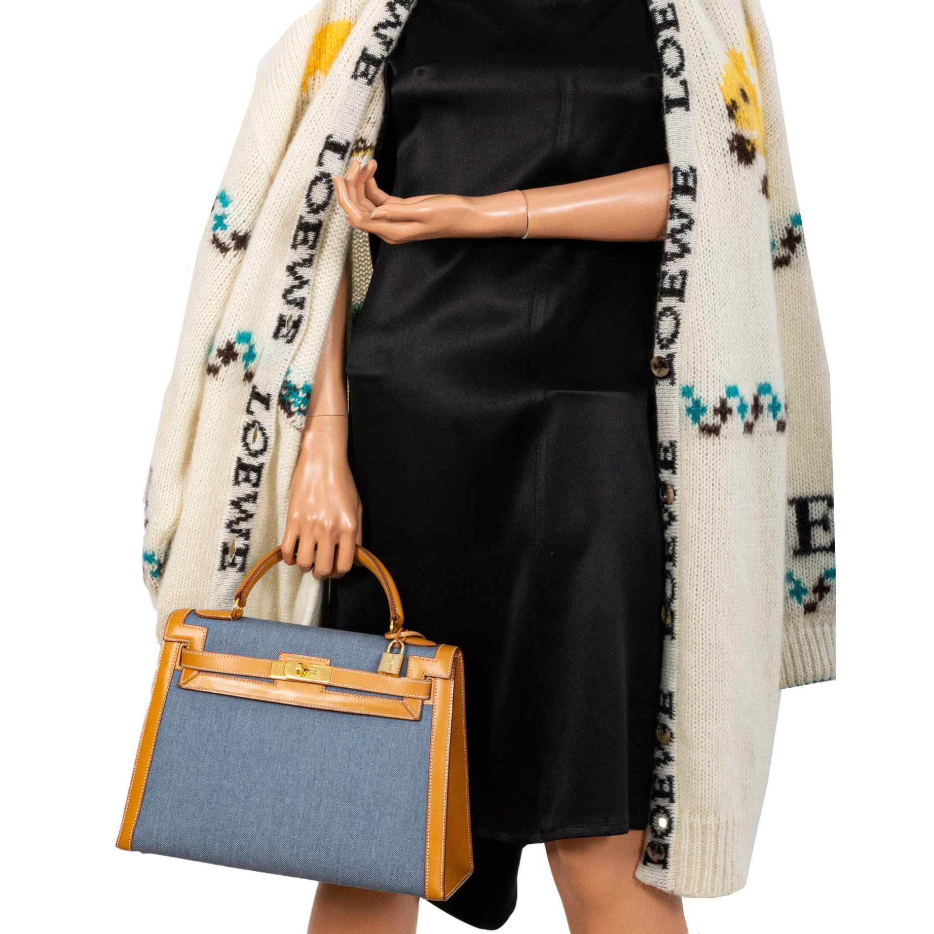 Hermès has a long history of producing their famous bags with canvas bodies to make them lighter and more casual. These limited editions are varied, and highly sought after by collectors, especially if they've managed to stay in excellent condition, as this has. This Kelly 32 uses light Vache Naturelle leather throughout the trim, which evokes the brand's equestrian heritage. The main feature of this bag is the very unusual blue jean Denim body, which instantly makes the bag casual and effortless, yet still as sophisticated as any Sellier Kelly could be.