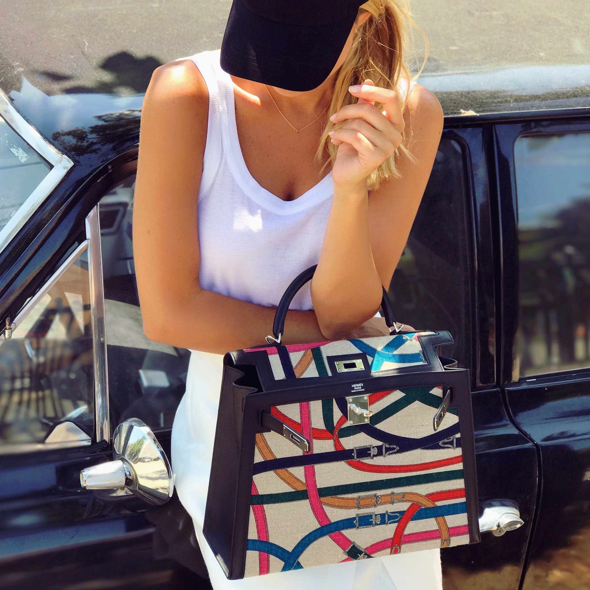 A very special collectors Kelly 32cm. The vintage print is from the Hermès archives - The Cavalcadour designed by Henri d'Origny issued in 1981. This is a very special Kelly offered only to VIP clientele. Interior is chévre leather with two slip pockets and one zip pocket. There is an extra outside back pocket.
