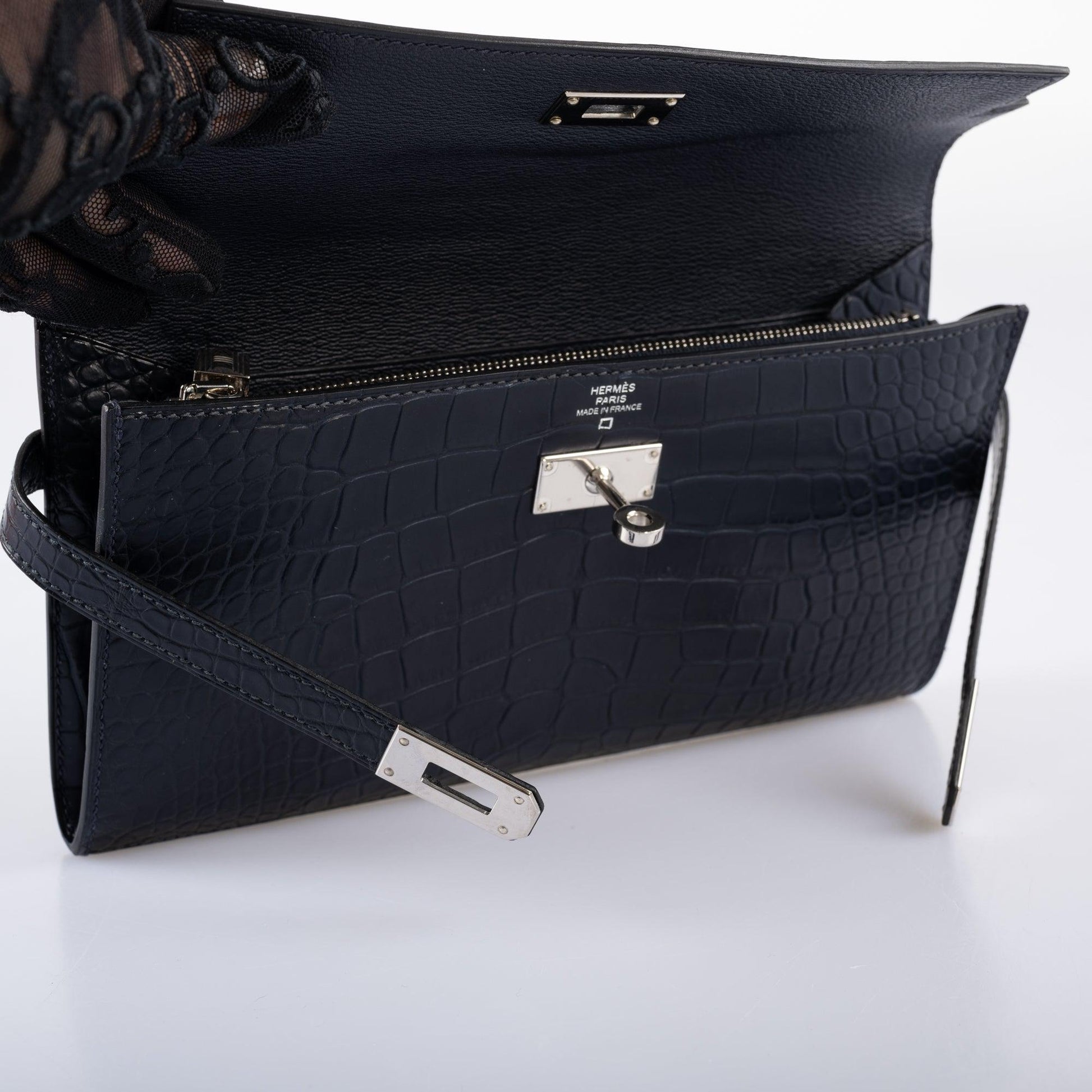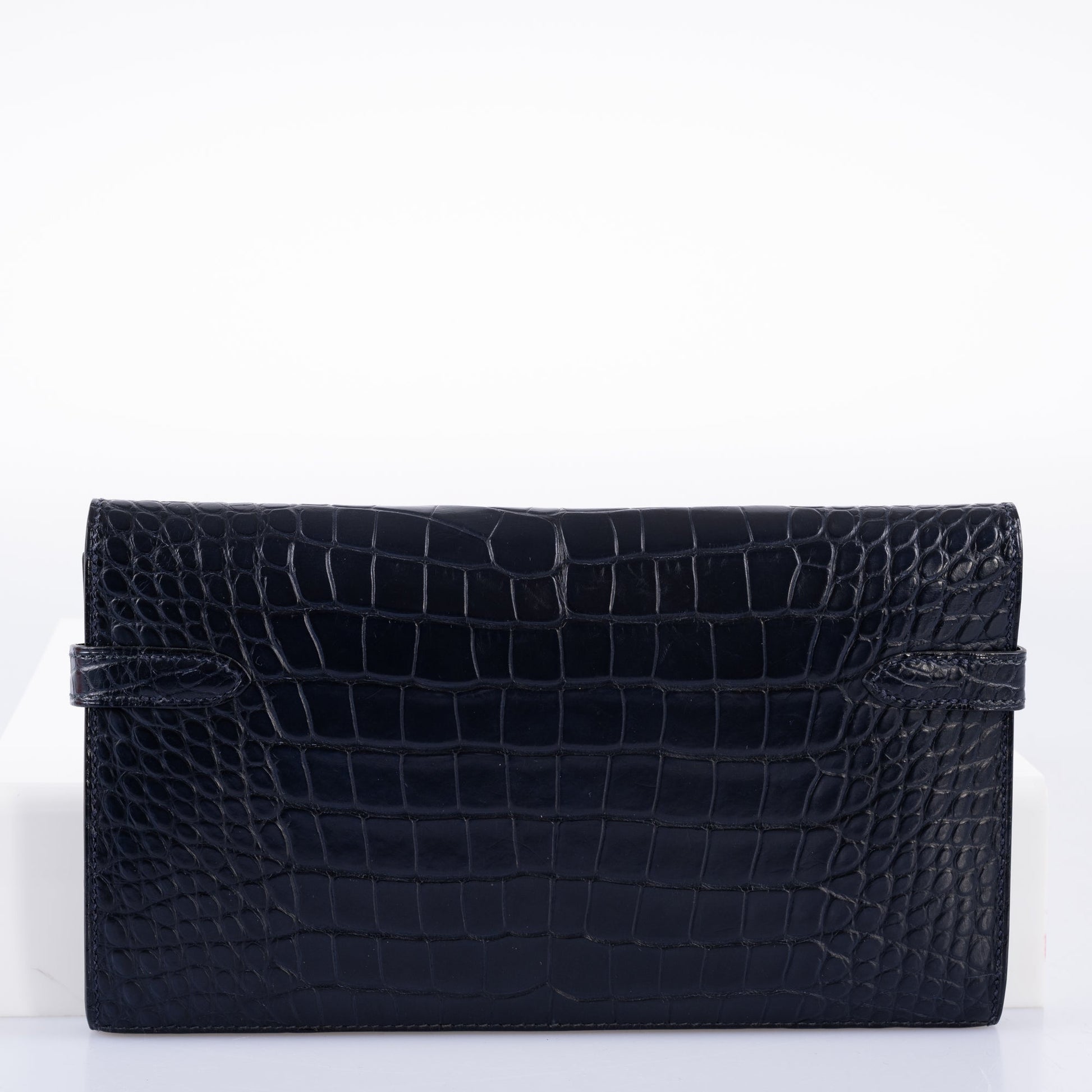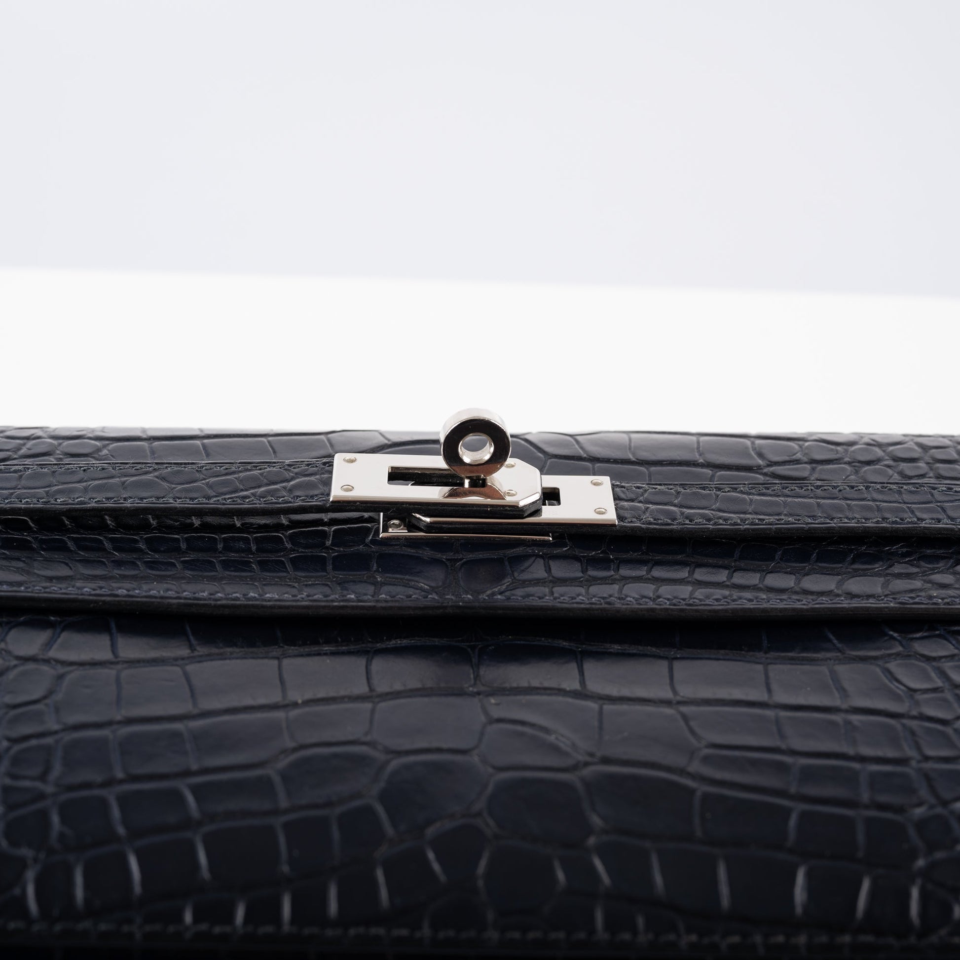 Before the Kelly Cut, there was the Kelly Longue. Overall larger, with a distinct Trapezoid shade, the Kelly Longue is a favorite among collectors. Out of production for over 10 years, examples of these sought-after clutches are becoming harder and harder to find. This Longue, done in rich Blue Marine Matte Alligator with Palladium hardware is exquisite.