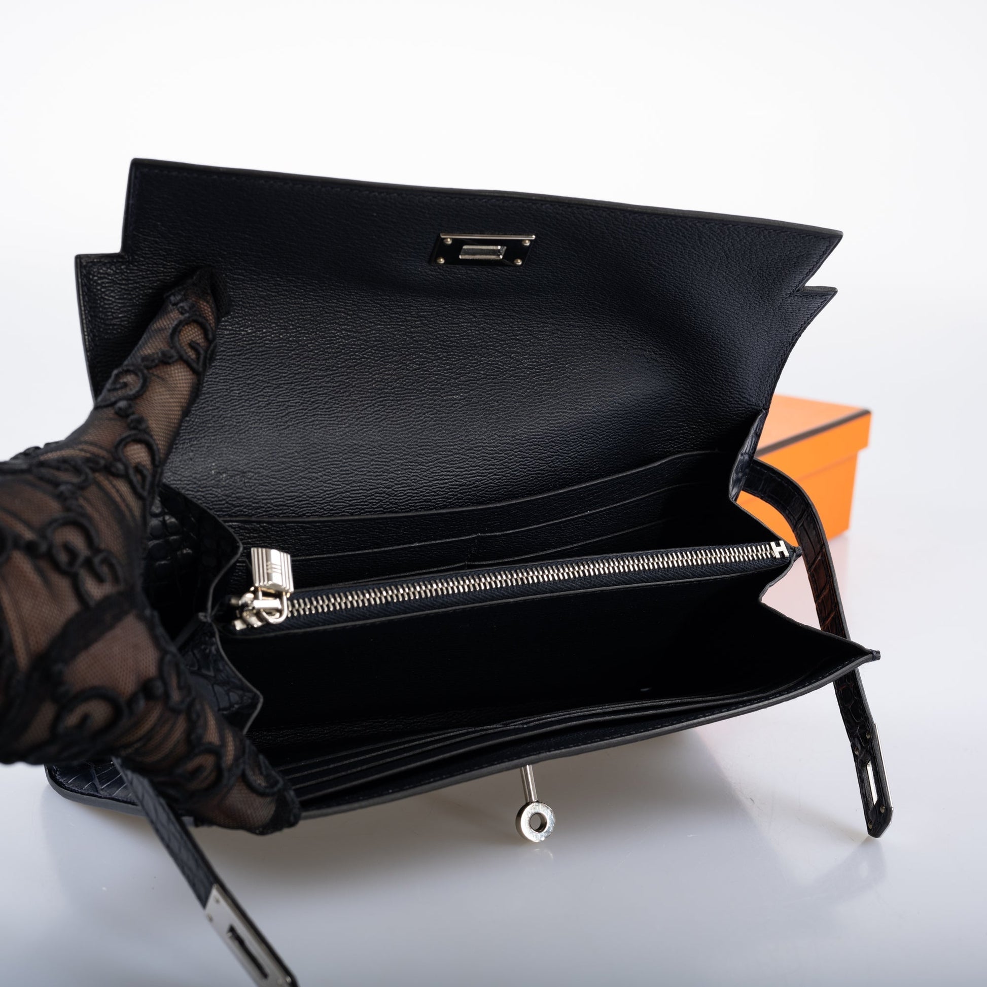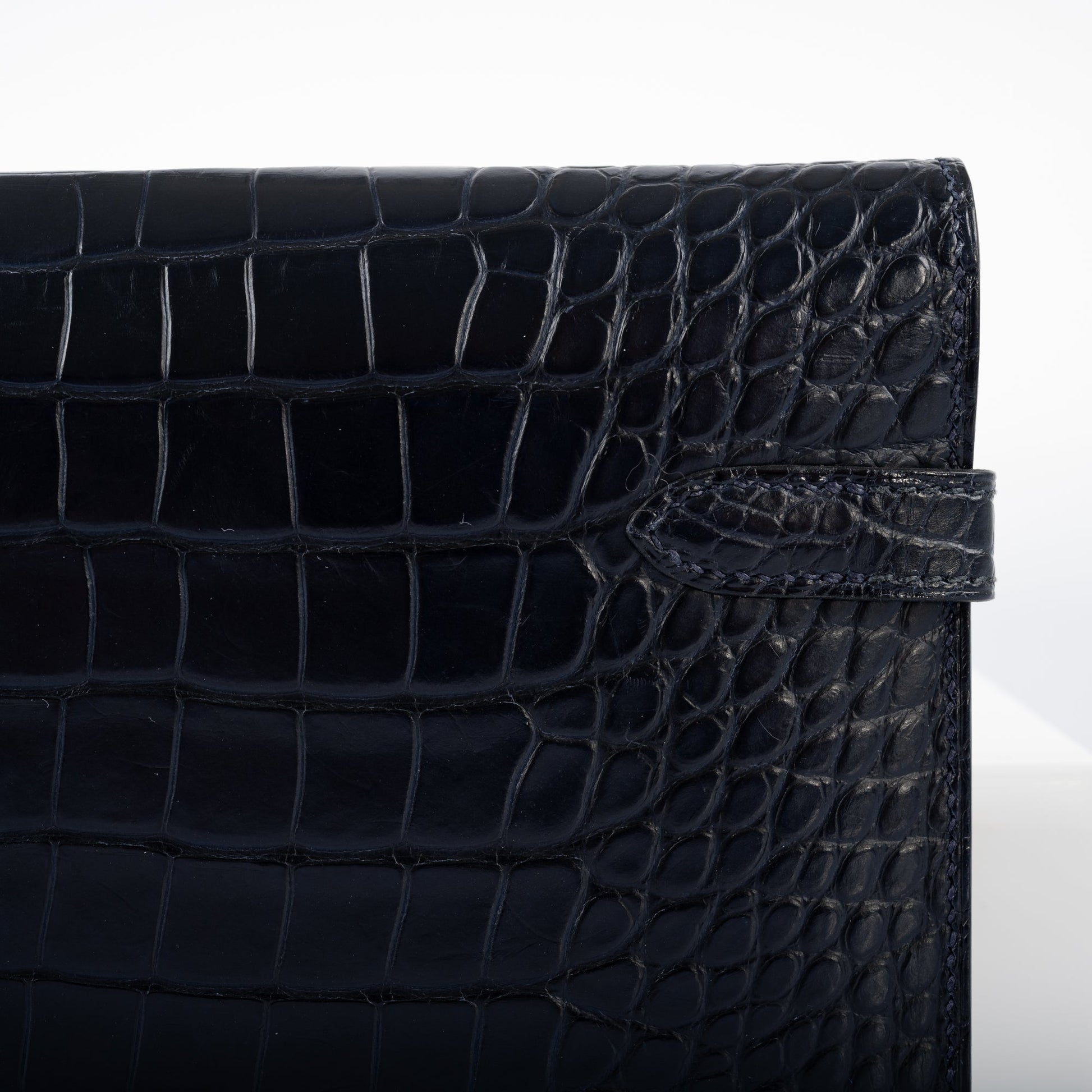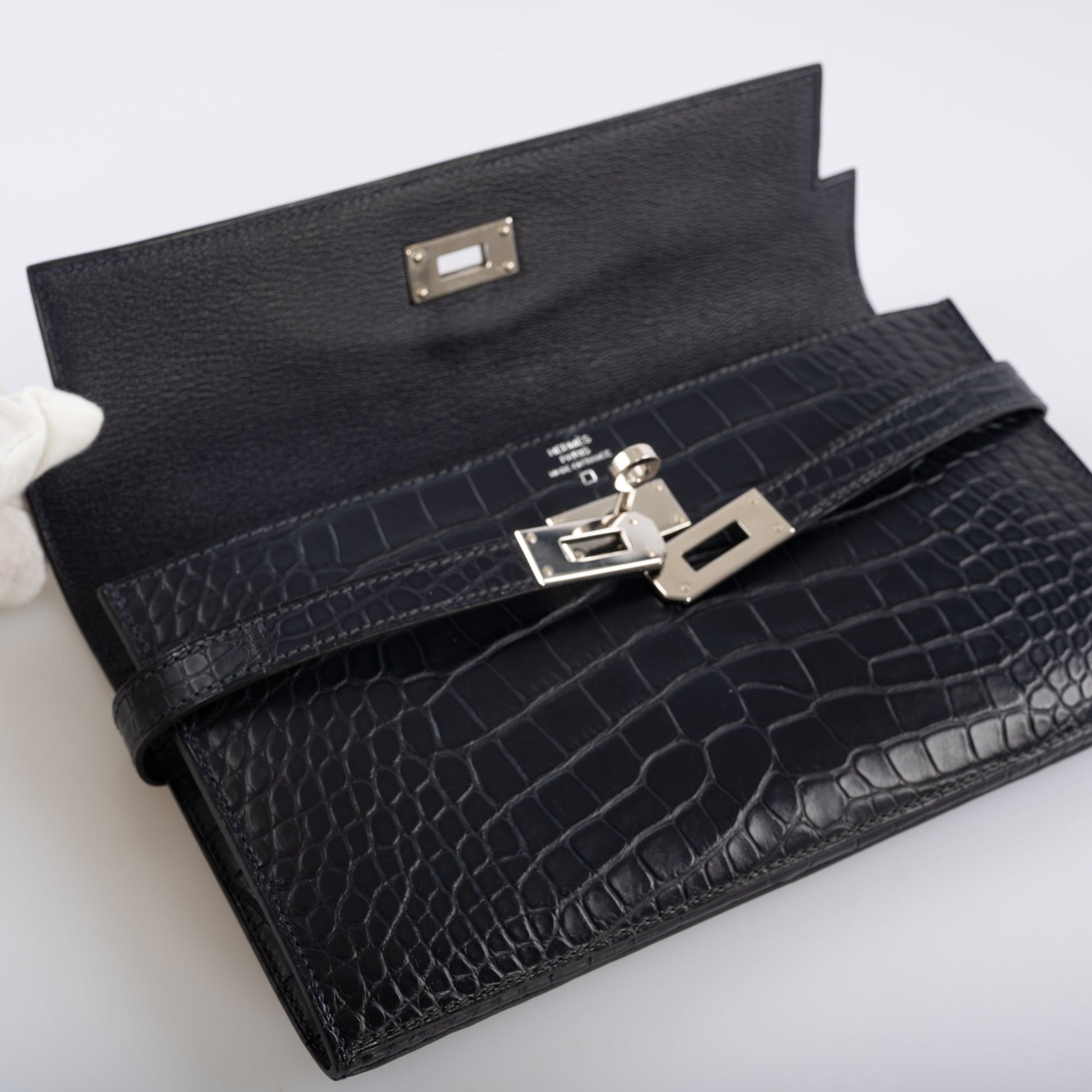 Before the Kelly Cut, there was the Kelly Longue. Overall larger, with a distinct Trapezoid shade, the Kelly Longue is a favorite among collectors. Out of production for over 10 years, examples of these sought-after clutches are becoming harder and harder to find. This Longue, done in rich Blue Marine Matte Alligator with Palladium hardware is exquisite.