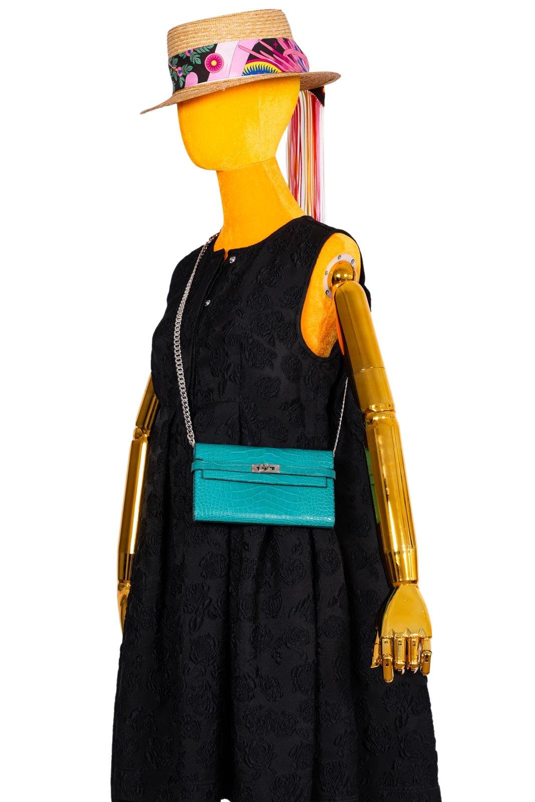 Prior to the introduction of the widely popular Kelly Cut, Hermès enthusiasts coveted the larger and equally unique Kelly Longue. Its distinctive Trapezoid silhouette, coupled with its ample proportions, have earned it a special place among collectors. Sadly, the Kelly Longue has been out of production for over a decade, making its acquisition an increasingly rare occurrence. This particular piece, crafted in the luxurious Blue Paon Matte Alligator leather and complemented by Palladium hardware, is a truly exquisite example of this coveted clutch.Color: Blue Paon - 13″ W x 6" T x 1″ D - Material: Matte Alligator. Condition: Very Good, some swirls on hardware.