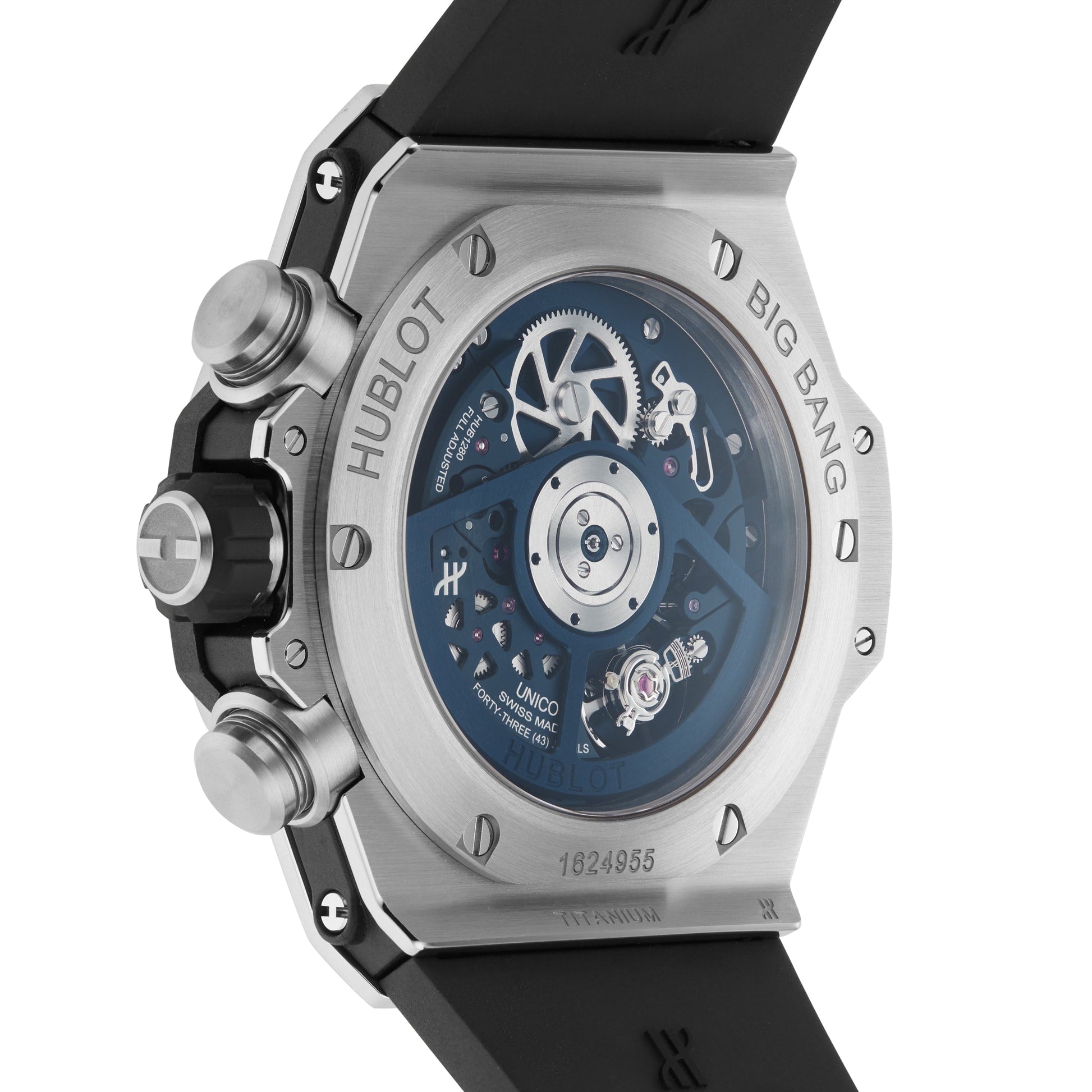 Big Bang Unico – a sporting sense of style Presented in a 44mm grade 5 titanium case with a titanium bezel Powered by the HUB1251 UNICO manufacture movement Striking blue skeleton dial Secured with a robust black and blue structured rubber strap ORIGINAL AND TECHNICAL Hublot’s flagship model, the Big Bang collection has undoubtably revolutionised the watchmaking universe – bringing together extraordinary features that never fail to make an impact. A unapologetic contemporary icon, this range is constantly evolving in line with technological and aesthetic advances. ROBUST AND POWERFUL This model has been designed to move with precision and style, with an anthracite skeleton dial, two chronograph sub-dials, and a date display. Presented in a polished 44mm titanium case, this impressive timepiece is protected by sapphire crystal with anti-reflective treatment and secured with a black and blue structured rubber strap. Power is provided be the Unico 2 calibre, designed to equip smaller chronographs with the power of the original movement. Thanks to technical optimisations, the movement has been reduced by 1.3mm in thickness, while still retaining key features such as a double coupling system, which can be viewed from the side of the dial, as well as a 72-hour power reserve. ?