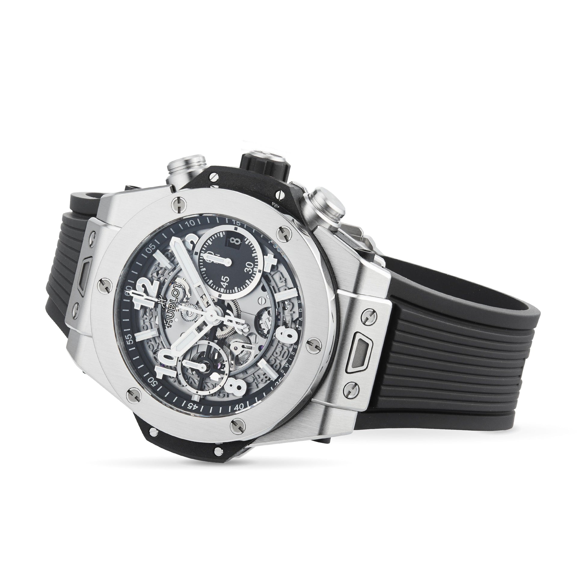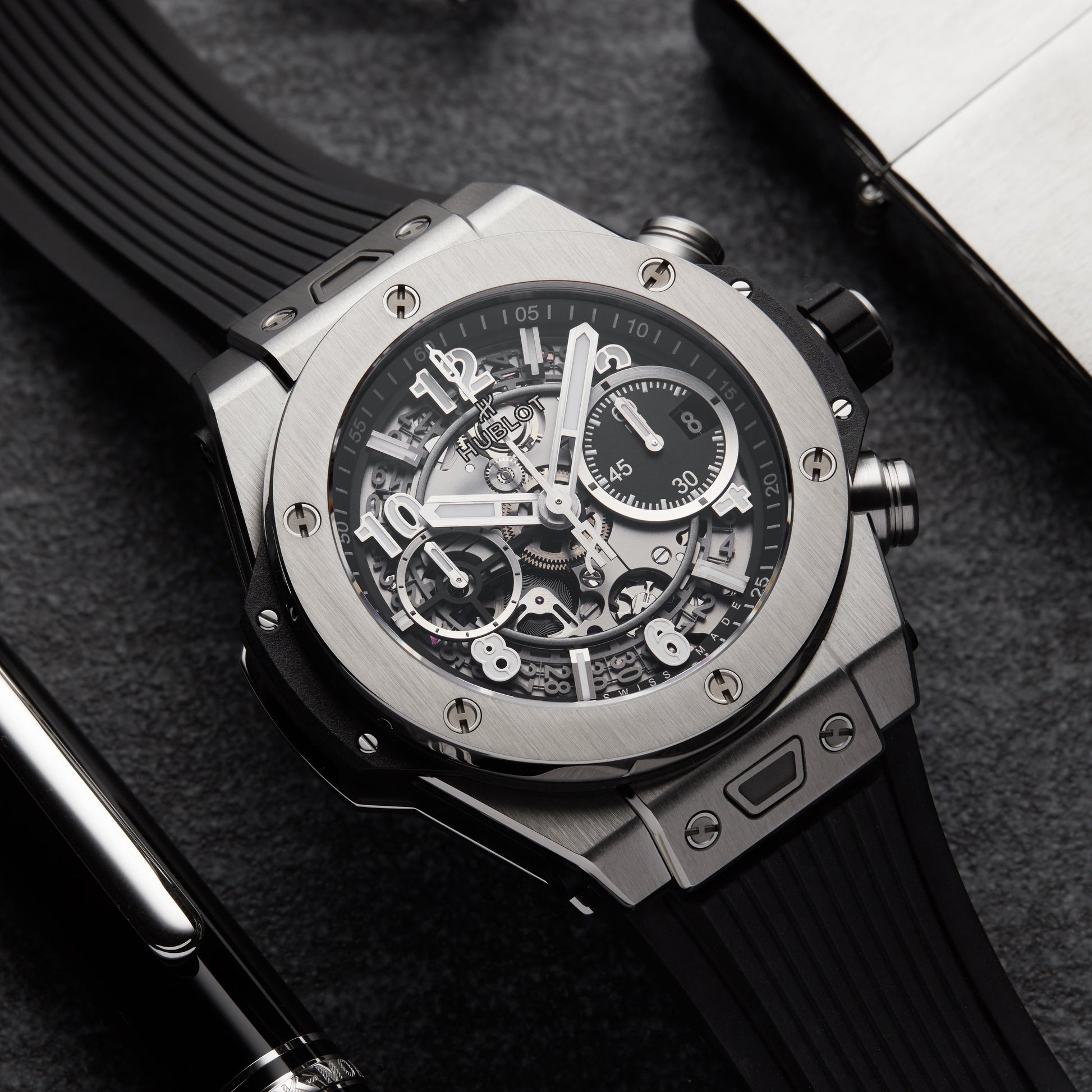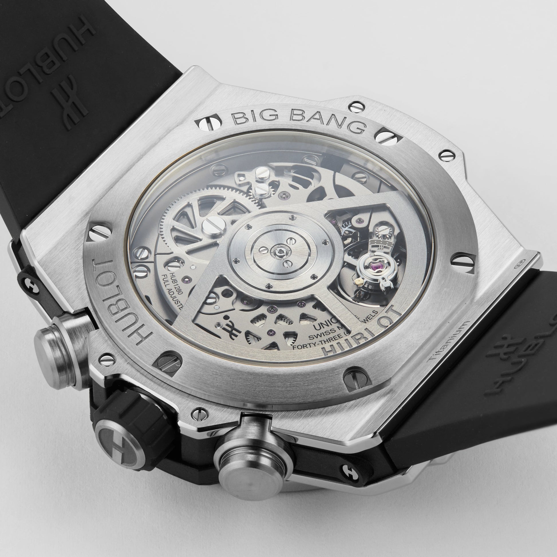 Big Bang Unico Titanium – The power of the Unico Manufacture in a more compact size Presented in a 42mm satin-finished and polished titanium case with a co-ordinating bezel Powered by the in-house HUB1280 UNICO manufacture self-winding chronograph flyback movement with a 72-hour power reserve Striking matte black skeleton dial Secured with a robust black rubber strap with black ceramic and a titanium deployant buckle clasp UNPARALLELED PERFORMANCE Hublot’s flagship model, the Big Bang collection has undoubtably revolutionised the watchmaking universe – bringing together extraordinary design elements that never fail to make an impact. The Big Bang Unico model features the Unico 2 calibre, designed to equip smaller chronographs with the power of the original movement. Thanks to technical optimisations, the movement has been reduced by 1.3mm in thickness, while still retaining key features such as a double coupling system, which can be viewed from the side of the dial, as well as a 72-hour power reserve. DESIGNED TO STAND THE TEST OF TIME Ultra tough, this distinctive model presents a matte black skeleton dial with Arabic numerals and batons. The 42mm satin-finished and polished titanium case is paired with a co-ordinating titanium bezel with 6 H-shaped titanium screws, and a robust black rubber strap with a black ceramic and titanium deployant buckle clasp. Powered by the performance driven in-house HUB1280 UNICO manufacture self-winding chronograph flyback movement, this incredible model is equipped with a 72-hour power reserve and water resistance to 10 bar (100 metres).
