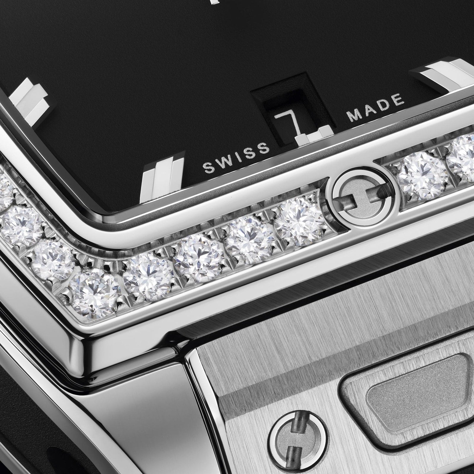 Spirit of Big Bang- an updated design Presented in an elegant, square steel case Polished steel bezel set with a further 44 diamonds for effortless radiance Understated matte black dial allows the diamond bezel to take centre stage Powered by the HUB1120 self-winding movement ELEGANCE REINVENTED Hublot has adapted the elegant spirit of Big Bang to create an exclusive barrel shaped collection that offers clever multi-layer construction, and countless combinations of striking materials, colours, and finishes. Fusing tradition and innovation, the Spirit of Big Bang collection pushes boundaries to unleash the extraordinary. GLISTENING DIAMONDS Designed to move with precision, this wonderfully elegant model is presented in a 32mm stainless steel case, framed by a steel bezel set with 44 glistening diamonds that radiate the light. Allowing the diamonds to take centre stage, the matte black dial is distinctly understated, with minimal hands and hour markers, and a subtle date display. Secured with a black structured rubber strap, this high performance watch is powered by the HUB1120 self-winding movement. Further functionality is provided by a 40-hour power reserve and water resistance to 10 bar (100 metres).