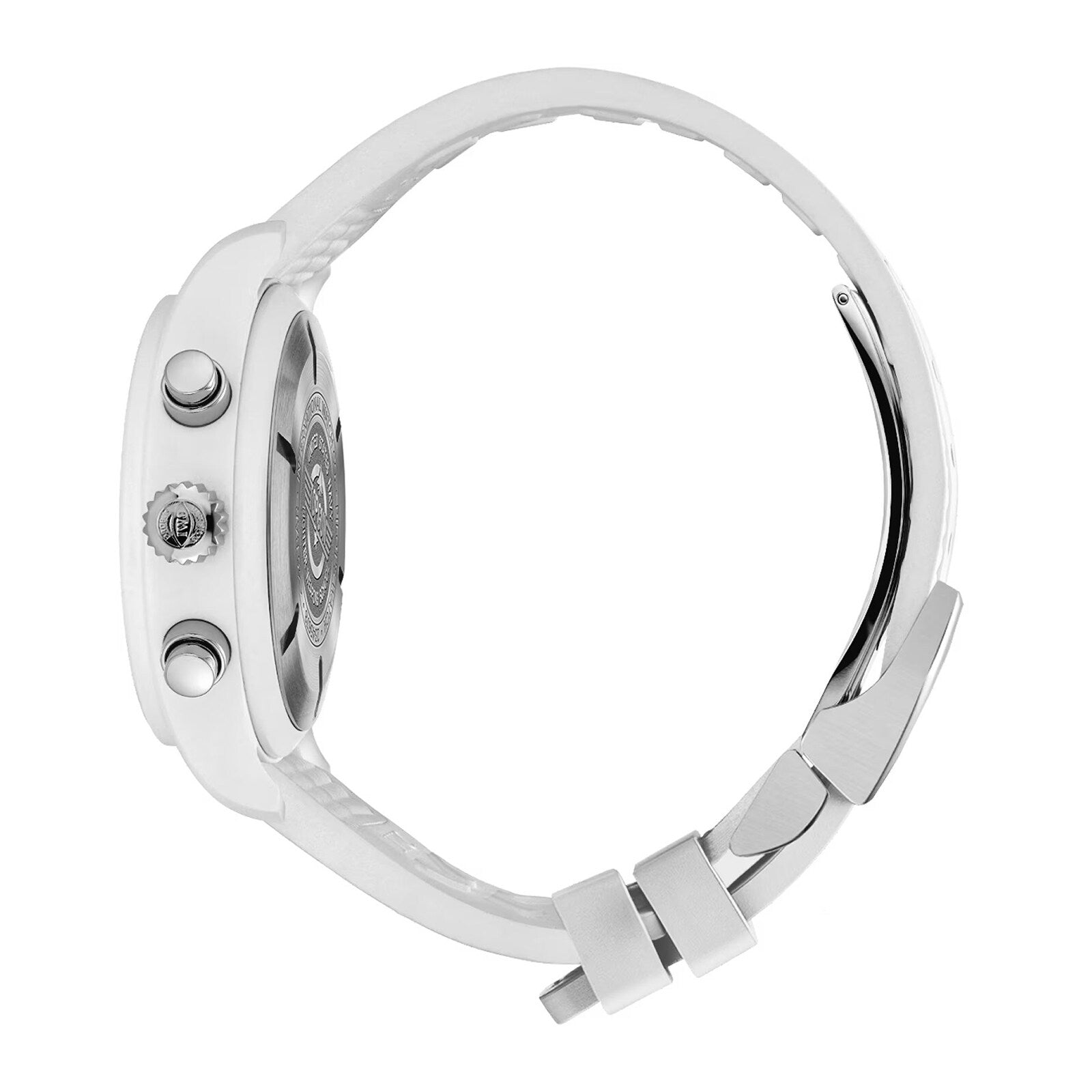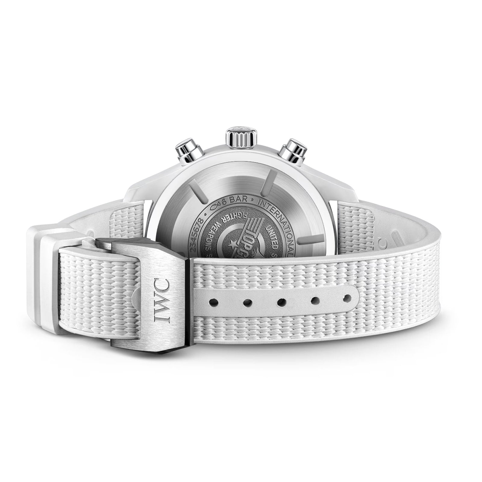 The ceramic case of the Pilot’s Watch Chronograph TOP GUN Edition "Lake Tahoe" boasts a subdued white color with a mysterious shimmer, inspired by both the US Navy's "Service Dress White" uniform and the magnificent winter landscape of the Sierra Nevada. Its bold black dial, hands, and white print and luminescence perfectly complement the white ceramic case and the ico nic TOP GUN logo on the titanium case back. Inside, the IWC-manufacture 69380 calibre, showcasing classic column-wheel design and a day and date display at 3 o'clock, is protected by a soft-iron inner case from the harmful effects of magnetic fields. This exclusiv e timepiece is completed with a white rubber strap, embossed with matching "Lake Tahoe" color, making it a luxurious accessory for a ny elite pilot.
