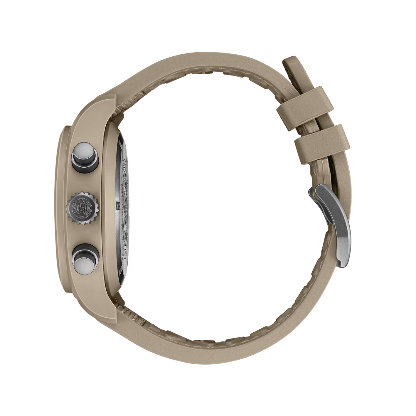 Travel through the skies with the Pilot’s Watch Chronograph 41 TOP GUN Mojave Desert. Its 41-m illimetre sand-colored ceramic case, inspired by naval aviator flight suits and the desert surroundings of China Lake, is both light weight and scratch-resistant. The brown dial and beige rubber strap with a textile inlay perfectly complement the ceramic case, whil e the titanium case back, crown, and push-buttons add a touch of strength and durability. Inside the watch, the IWC-manufactured 693 80 calibre movement guarantees precision and reliability with its vertical dial layout and day date aperture. With an inner case mad e of soft iron to protect against magnetic fields and a front glass that stays in place even during sudden air pressure drops, this chronograph is designed for any adventure.