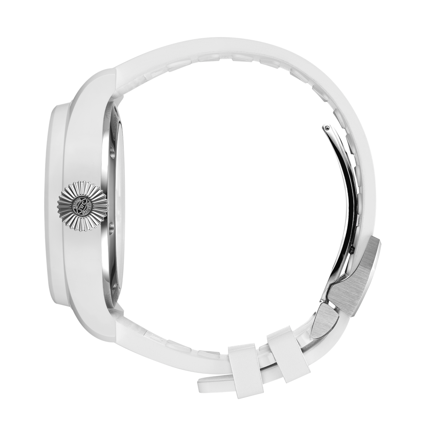 Inspired by the snow-covered scenery surrounding Lake Tahoe, the IWC Big Pilot's Watch Perpetual Calendar T OP GUN features a striking ceramic color, aptly named "IWC Lake Tahoe." As pilots from the nearby US Navy TOPGUN flight school frequ ently fly over this picturesque mountainous region, the watch captures the rugged beauty and spirit of adventure. With a pitch-black dial, luminescent black hands, and a contrasting white textured rubber strap, this timepiece exudes a sense of dynamic energy. Furt hermore, the use of white ceramic showcases IWC's expertise and innovation in advanced materials. Developed in the 1980s, the perpet ual calendar function has been continuously refined and improved, making it a true testament to IWC's commitment to excellence. Addi tionally, the patented double moon phase display and the automatic Pellaton winding system further enhance the watch's reliability a nd precision. The result is a timeless, iconic timepiece that will continue to impress for generations to come.