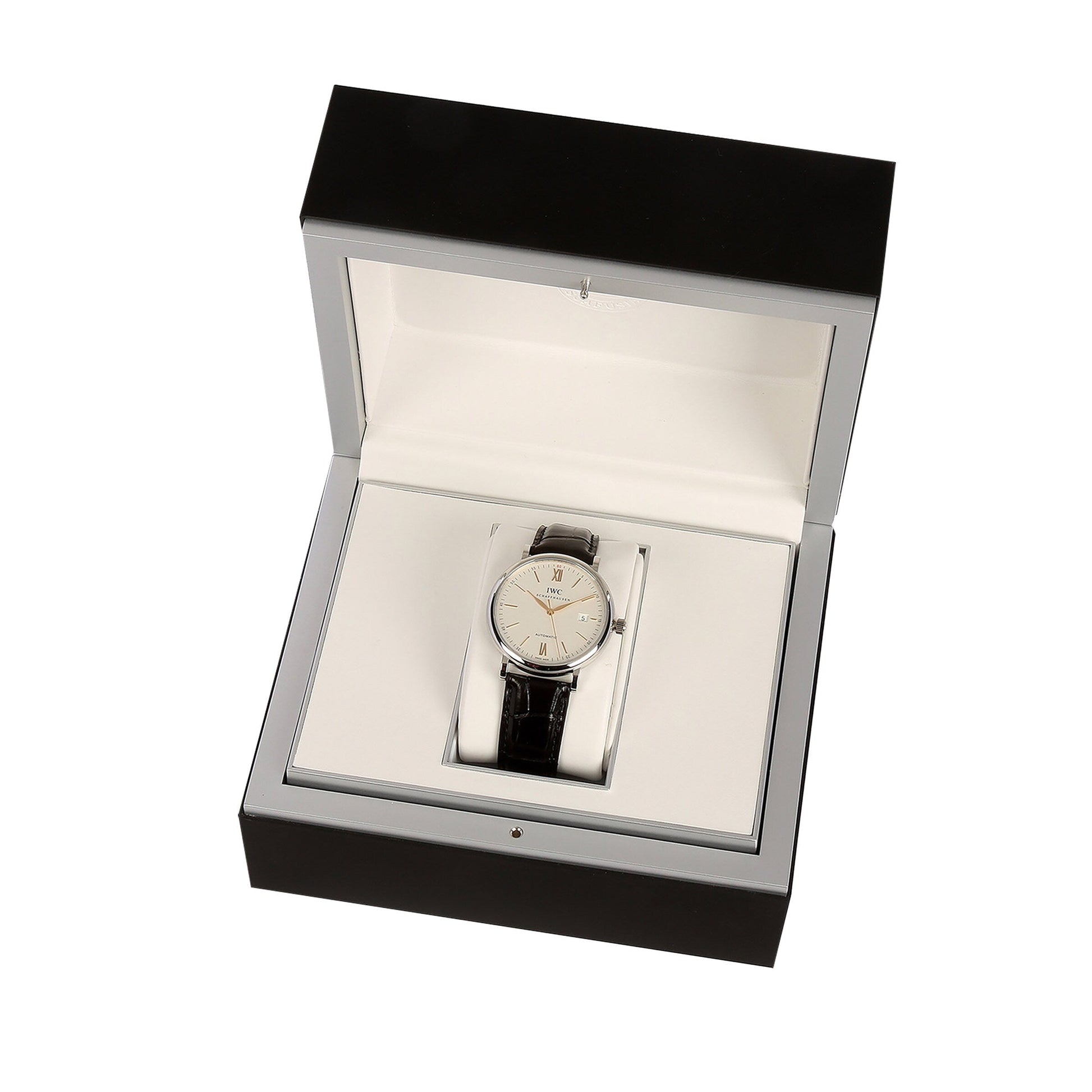 Reimagining an iconic design Powered by Swiss-made automatic movement and water resistant to 3 bar (30 metres) Presented in a striking 40mm stainless steel case and secured with a black alligator leather strap with a pin buckle for added security on the wrist Water resistant to 3 bar (30m) Featuring a 42-hour power reserve SPORTING INSPIRATION Celebrating the IWC Schaffhausen vision of pairing impeccable Swiss precision with cutting edge technology, the Portofino collection takes its design cues from the 1960s, with elegantly sporty push-buttons and chronograph displays. For over 30 years, the collection has effortlessly encapsulated the laid-back Mediterranean lifestyle with understated luxury. With a distinctly sport-inspired aesthetic, this 42mm timepiece is timelessly elegant, powerful and precise. A BEACON OF LUXURIOUS STYLE The robust 40mm stainless steel case is paired with a stylish black alligator leather strap with a pin buckle for added security on the wrist. The crisp white dial is home to gold-tone hour markers and hands, a date display window positioned at 3 o’clock display, as well as Roman numeral markers at 12 and 6 o’clock. Protected by a sapphire crystal lens with anti-reflective coating to eliminate glare and powered by a Swiss-made automatic movement, this timepiece is equipped with a 42-hour power reserve and is water resistant up to 3 bar (30 metres).