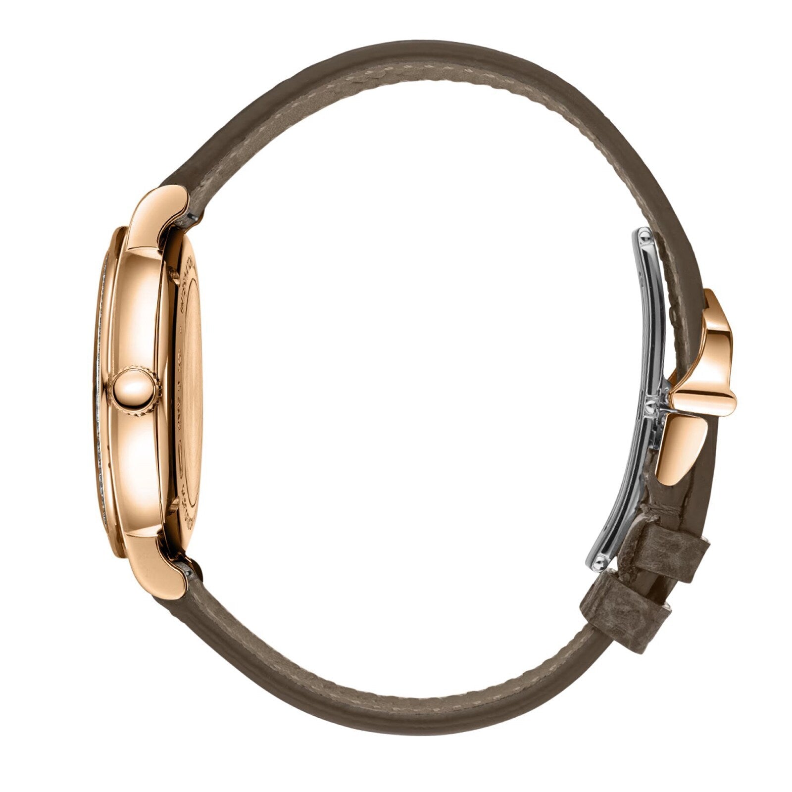 Experience the captivating beauty of the sun and moon in a never-ending dance with the Portofino Auto matic Day & Night 34 watch. This exquisite ladies' timepiece features a striking day & night complication, indicated by a sm all disc at 6 o'clock. The 34-millimetre case crafted from 18-carat 5N gold is adorned with a silver-plated dial and 66 diamonds wei ghing almost 1 carat. With an improved setting, these diamonds reflect light brilliantly, adding an extra touch of elegance. The wat ch is completed with a luxurious taupe calfskin strap and a butterfly folding clasp, providing a comfortable and stylish fit. Thanks to the integrated quick-change system, the strap can easily be exchanged for a different look. Experience the charm and allure of P ortofino with this exclusive timepiece.