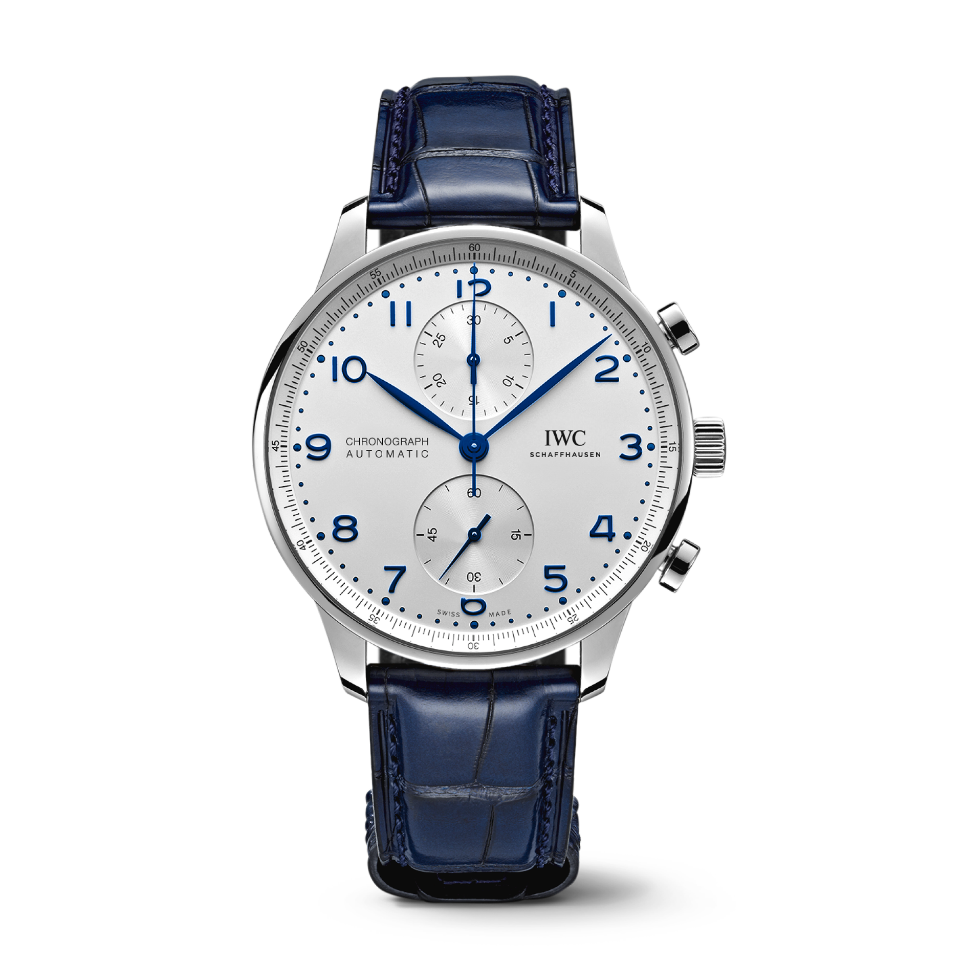 IWC Schaffhausen Portugieser Chronograph 41 mm Silver Dial Stainless Steel Blue Leather Strap IW371605