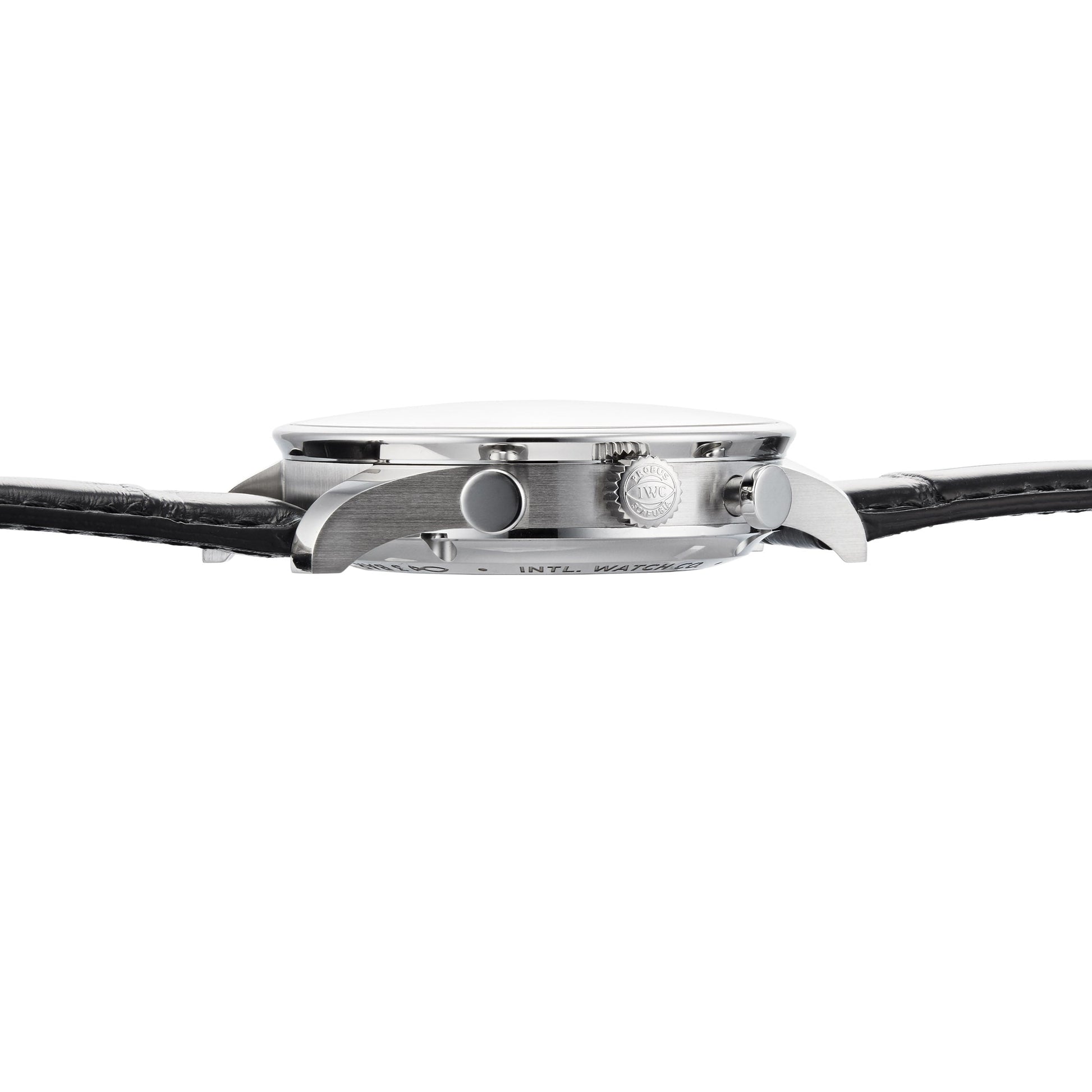 Reimagining an iconic design Powered by the IWC-manufactured 69355 calibre movement Presented in a 41mm stainless steel case secured with a black alligator leather strap Water resistant to 3 bar (30m) Visible internal column-wheel design A MODERN DAY MASTERPIECE An unequivocal icon, The Portugieser Chronograph showcases an intrinsic 1930s IWC Schaffhausen design, reimagined for the modern day. Timeless luxury meets unparalleled quality for a statement timepiece that is as functional as it is comfortable. Boasting clean, bold aesthetics on an open dial, this model benefits from a compact 41mm case diameter, housing a powerful IWC- manufactured 69355 calibre movement for expert timekeeping. NATURICAL HERITAGE The case is encircled by a thin stainless steel bezel, giving the illusion of a much larger watch than its compact 41mm size. The clean, silver-plated dial features applied Arabic numerals and slender golden Feuille hands. The characteristic réhaut evokes memories of the brands nautical heritage, printed with a quarter-second scale for excellent precision. The piece is paired with a stylish black alligator style leather strap and secured with a robust butterfly folding clasp for elevated levels of comfort. The model is also water resistant up to 3 bar (30 metres).