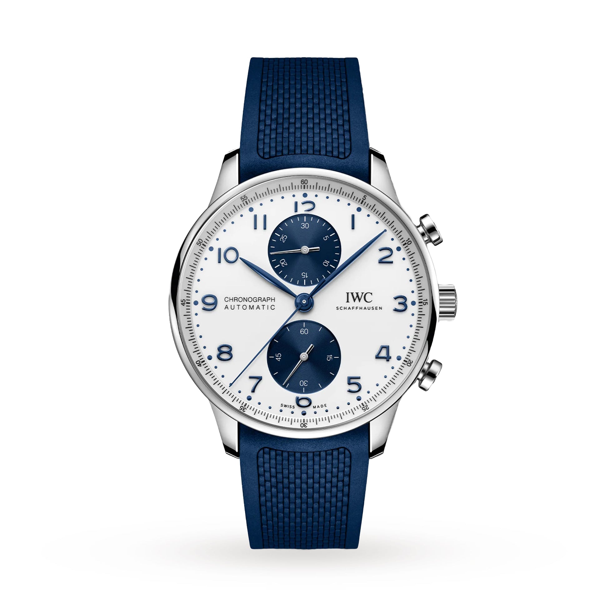 Reimagining an iconic design Powered by the IWC-manufactured 69355 calibre automatic movement Presented in a 41mm stainless steel case and secured with a blue rubber strap Water resistant to 3 bar (30 metres) Showcasing a see-through sapphire glass case back A CLASSIC AESTHETIC An unequivocal icon, The Portugieser Chronograph showcases an intrinsic 1930s IWC Schaffhausen design, reimagined for the modern day. Timeless luxury meets unparalleled quality to create a statement timepiece that is as functional as it is comfortable. Boasting clean, bold aesthetics on an open dial, this model benefits from a compact 41mm case diameter, housing a powerful IWC-manufactured 69355 calibre movement for expert timekeeping. FRESH AND CONTEMPORARY The case is encircled by a thin stainless steel bezel, giving the illusion of a much larger watch than its compact 41mm size. Showcasing a clean white dial, this timepiece features small hacking seconds and innovative chronograph function with minutes and seconds. Complete with a blue rubber strap secured by a robust folding clasp, this model includes a 46-hour power reserve and water resistance up to 3 bar (30 metres).