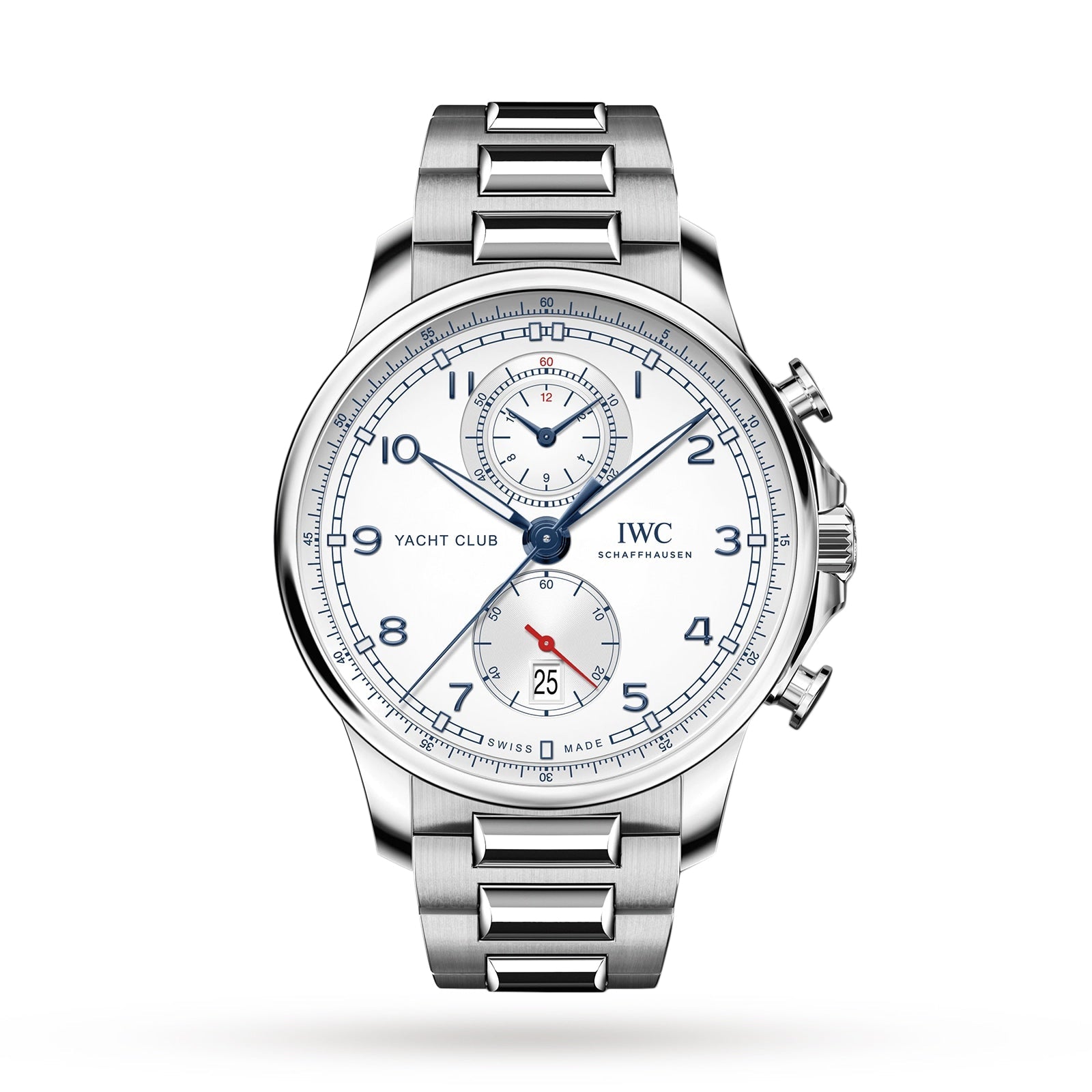 Precise and powerful on deck and ashore Powered by IWC-manufactured 89361 calibre automatic movement Presented in a 44.6mm stainless steel case with a coordinating bracelet Water resistant up to 10 bar (100 metres) Showcasing advanced chronograph function SUPREME EXCELLENCE EVEN AT SEA An unequivocal icon, this collection showcases an intrinsic 1930s IWC Schaffhausen design, reimagined for the modern day. Timeless luxury meets unparalleled quality for a statement timepiece that is as functional as it is comfortable. A prime example of high-performing, nautical sports watches, the Portugieser Yacht Club Chronograph combines timeless style with rugged, sportsman appeal. With water resistance up to 10 bar (100 metres), this IWC collection provides ultimate accuracy and reliability on deck and ashore. RELIABLE TIMEKEEPING The 44.6mm stainless steel case houses a clean white Gris argent dial with luminescence for optimum visibility while at sea. The dial is further stylised by a date display at 6 o’clock, hour and minute counters combined in a totalizer at 12 o’clock, and chronograph functions with precision to the nearest hour, minute, and second. The IWC-manufactured 89361 calibre automatic movement powers this model building a 68-hour power reserve and showcasing an impressive Cotes de Geneve finish, visible through the sapphire glass case back. Secured by a robust co-ordinating bracelet with a folding clasp securement, this timepiece offers incredible style and security.