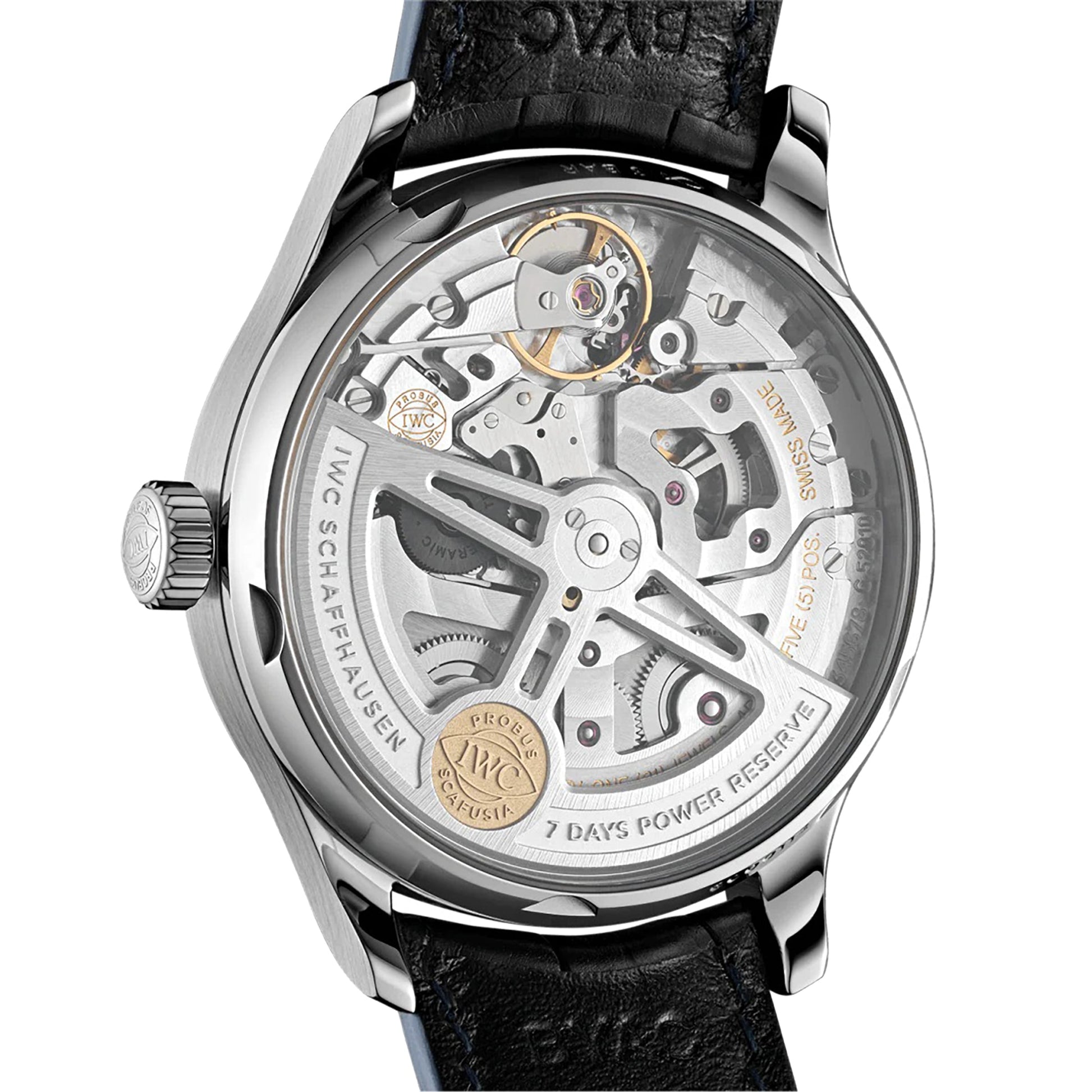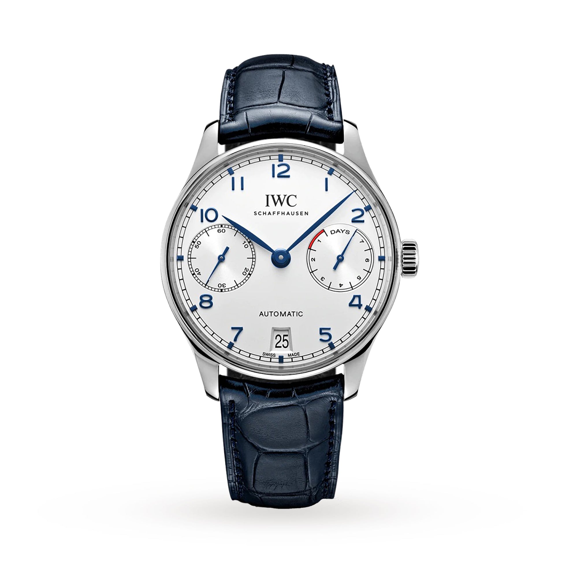 Unforgettably bold Powered by the automatic self-winding 52010 calibre movement Presented in a 42.3mm stainless steel case secured with a blue alligator leather strap Water resistant to 3 bar (30 metres) Featuring a 168-hour power reserve EVERYDAY ELEGANCE Recognised for pioneering designs, technical prowess and revolutionary aesthetics, the Portuguese range has become a stand out amongst the IWC line. Pairing bold designs with unequivocal style and engineering excellence, the Portugieser Automatic is a powerful and reliable timepiece that complements the wrist and enhances any outfit. REIMAGINING AN ICONIC DESIGN The 42.3mm stainless steel case houses a clean white dial organised by blue-toned hands and appliques, showcasing an unmistakable Portugieser design. The dial is further enhanced by Arabic numerals, a date display at 6 o’clock and a power reserve indicator. The 52010- calibre automatic, self-winding movement is at the heart of this model, building up a seven day power reserve. Through the sapphire glass case back, all 257 working components, 31 jewels, and an 18ct gold medallion can be seen powering this timepiece. Paired with a blue alligator leather strap secured by a reliable folding clasp, this model is complete with water resistance up to 3 bar (30 metres).