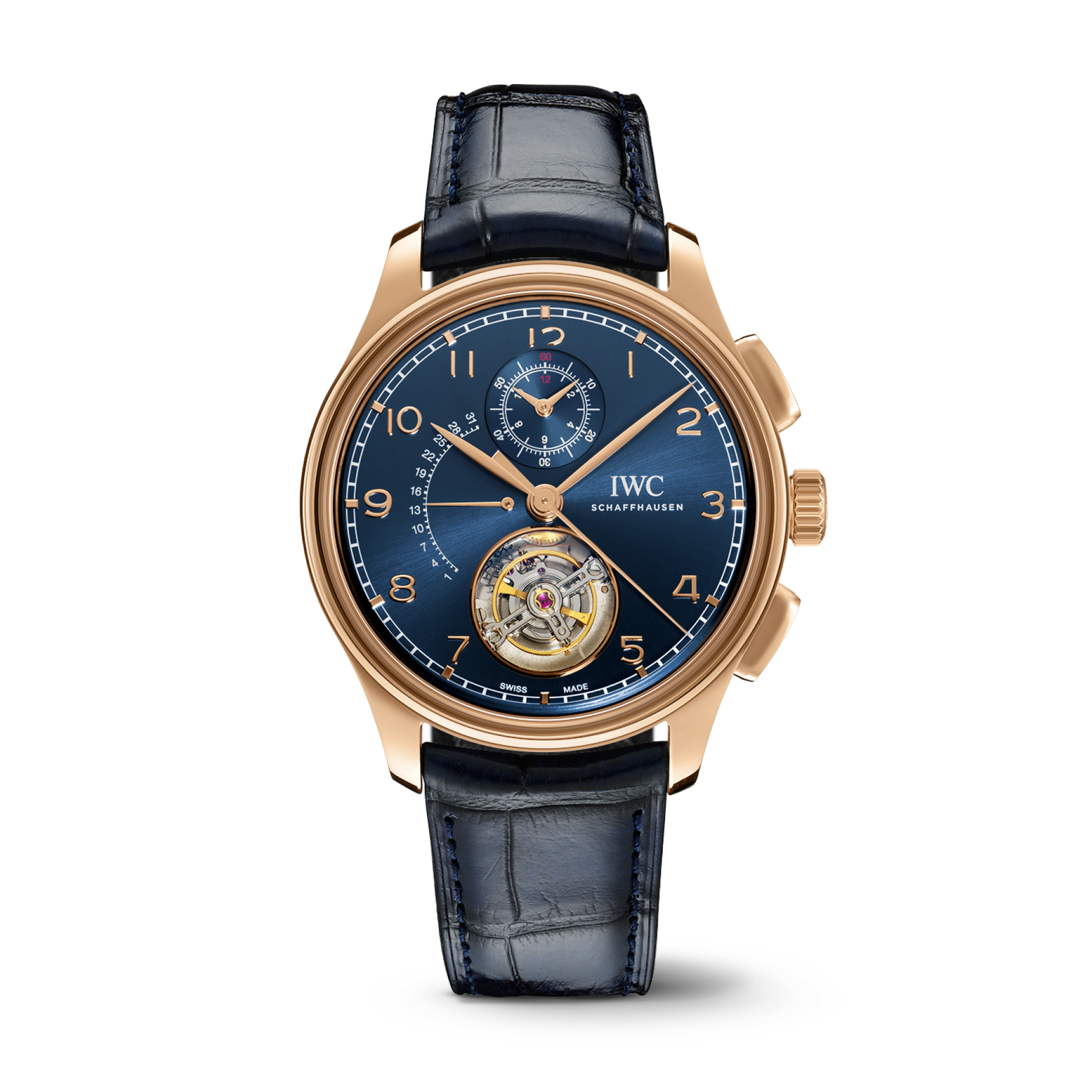 IWC Schaffhausen Portugieser Tourbillon Rétrograde Chronograph 43.5 mm Blue Dial 18k Armor Gold Blue Leather Strap IW394005
