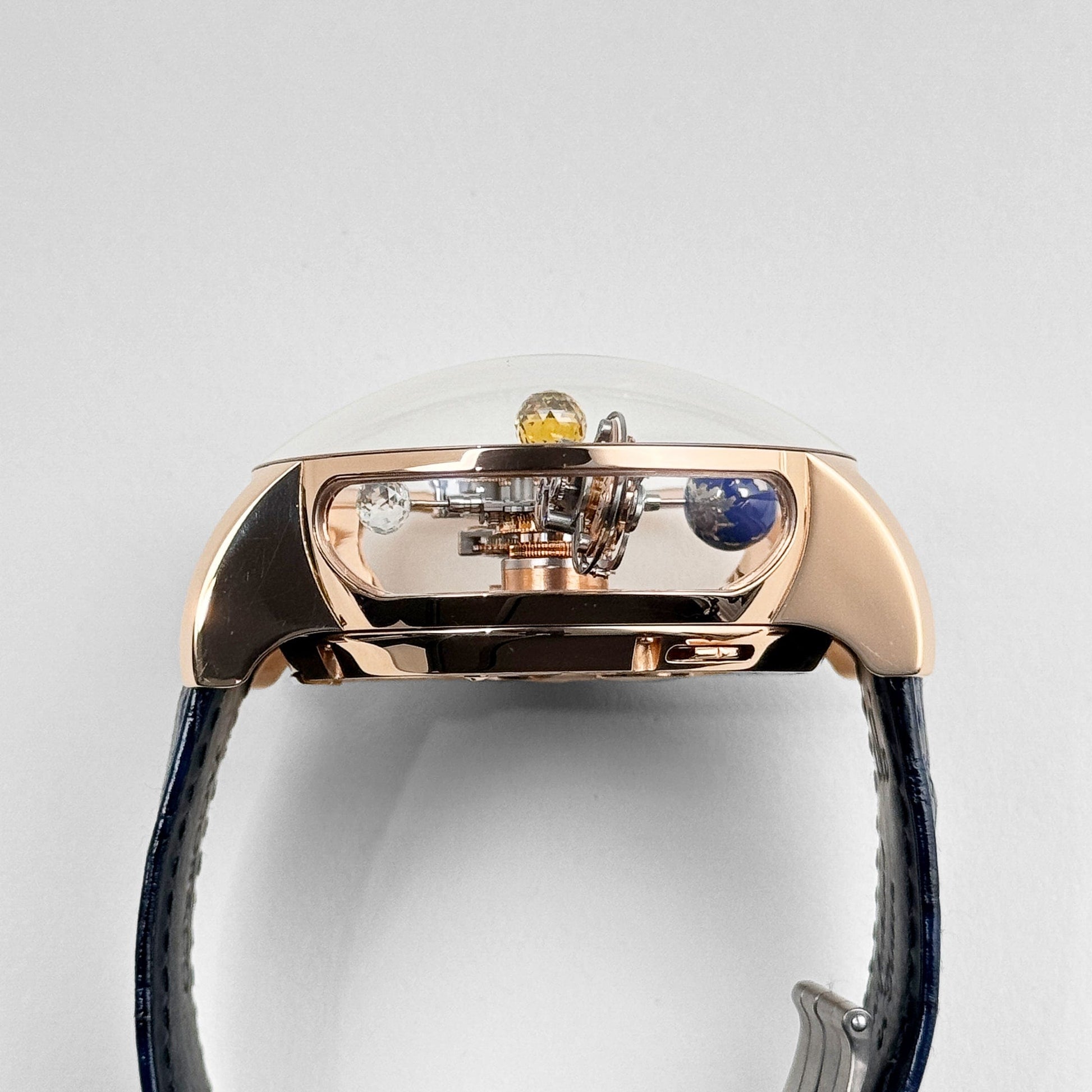 Surrounding the tourbillon are three additional arms mounted on a rotating carrier: a magnesium lacquered globe representing Earth, a rotating diamond-cut sphere symbolizing the moon, and a subdial for hours and minutes that remains upright thanks to an ingenious differential system. This timepiece is powered by both an automatic movement and the manual-winding JCAM10 caliber. The manual movement completes a full rotation every 20 minutes and offers a 60-hour power reserve. The Astronomia AT150.40.AC.SD.A is not just a timepiece—it’s a kinetic sculpture that fuses astronomy, fine watchmaking, and high jewelry into one unforgettable creation.